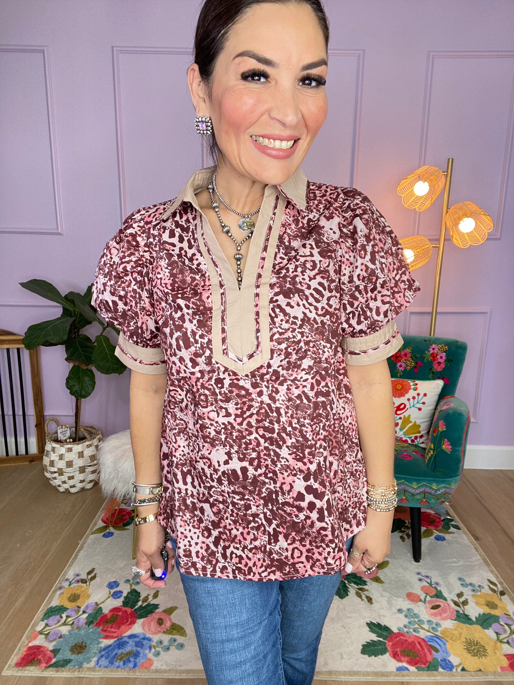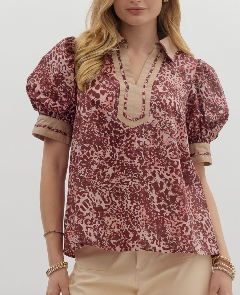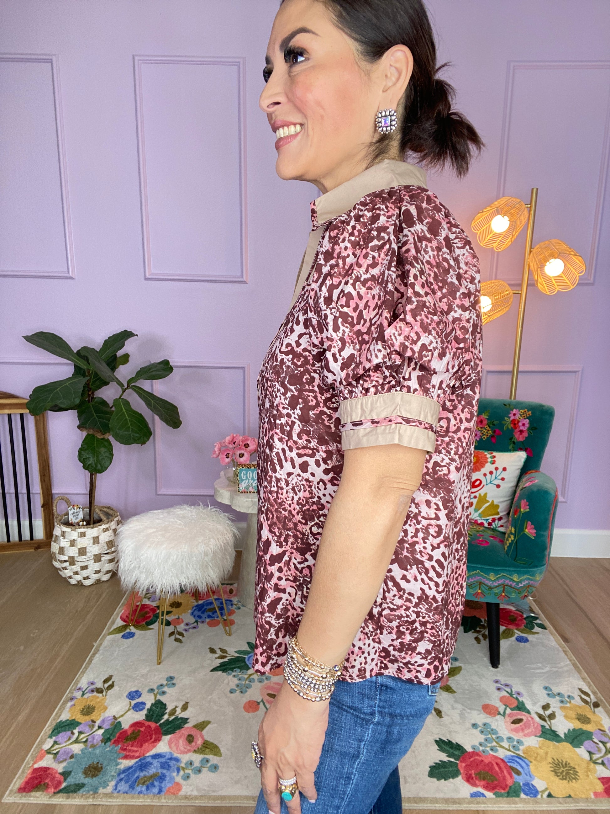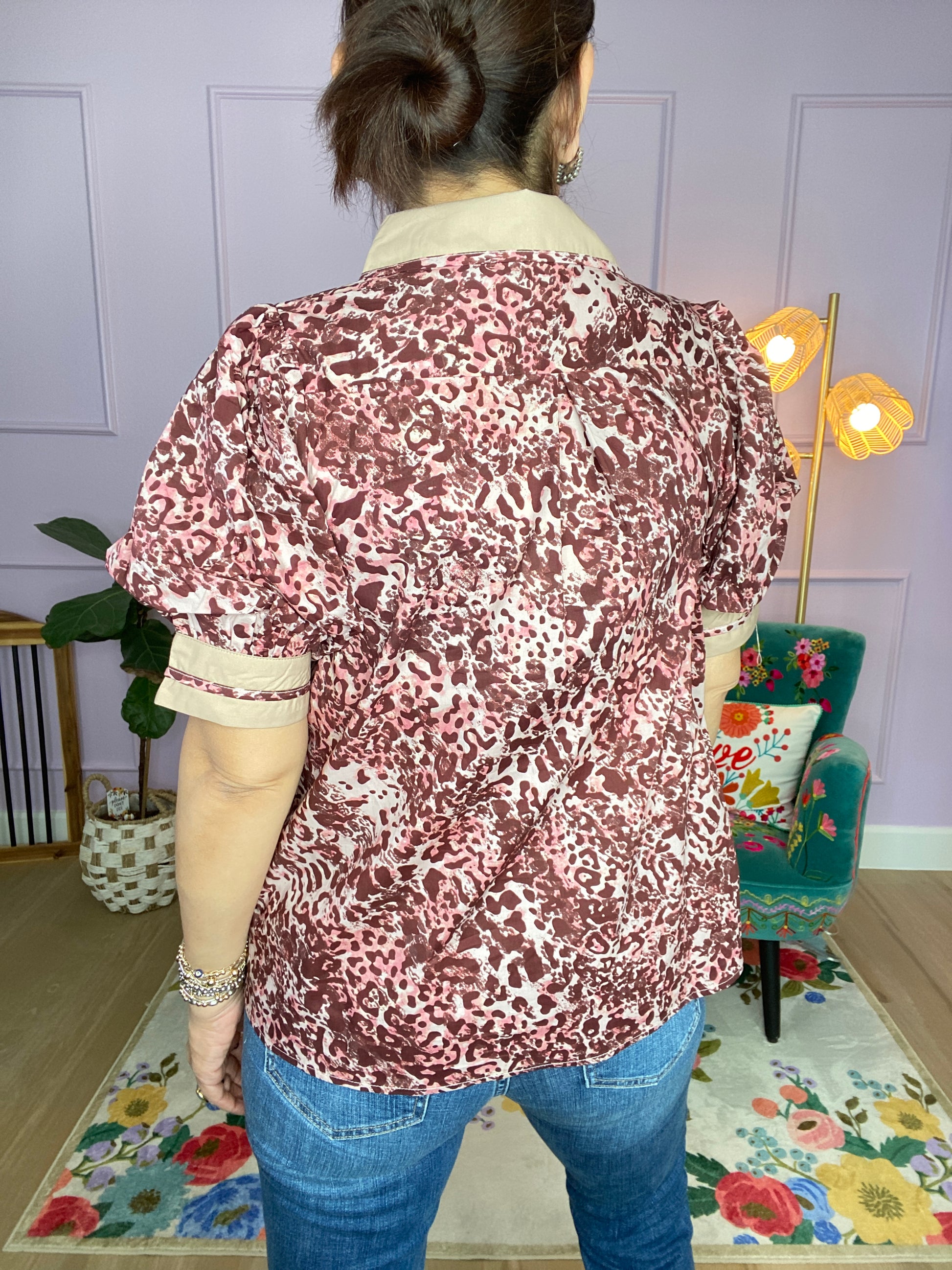 Animal pattern short cuff band sleeve top featuring contrast accent cuff band and collar. Unlined. Woven. Non-sheer. Lightweight.