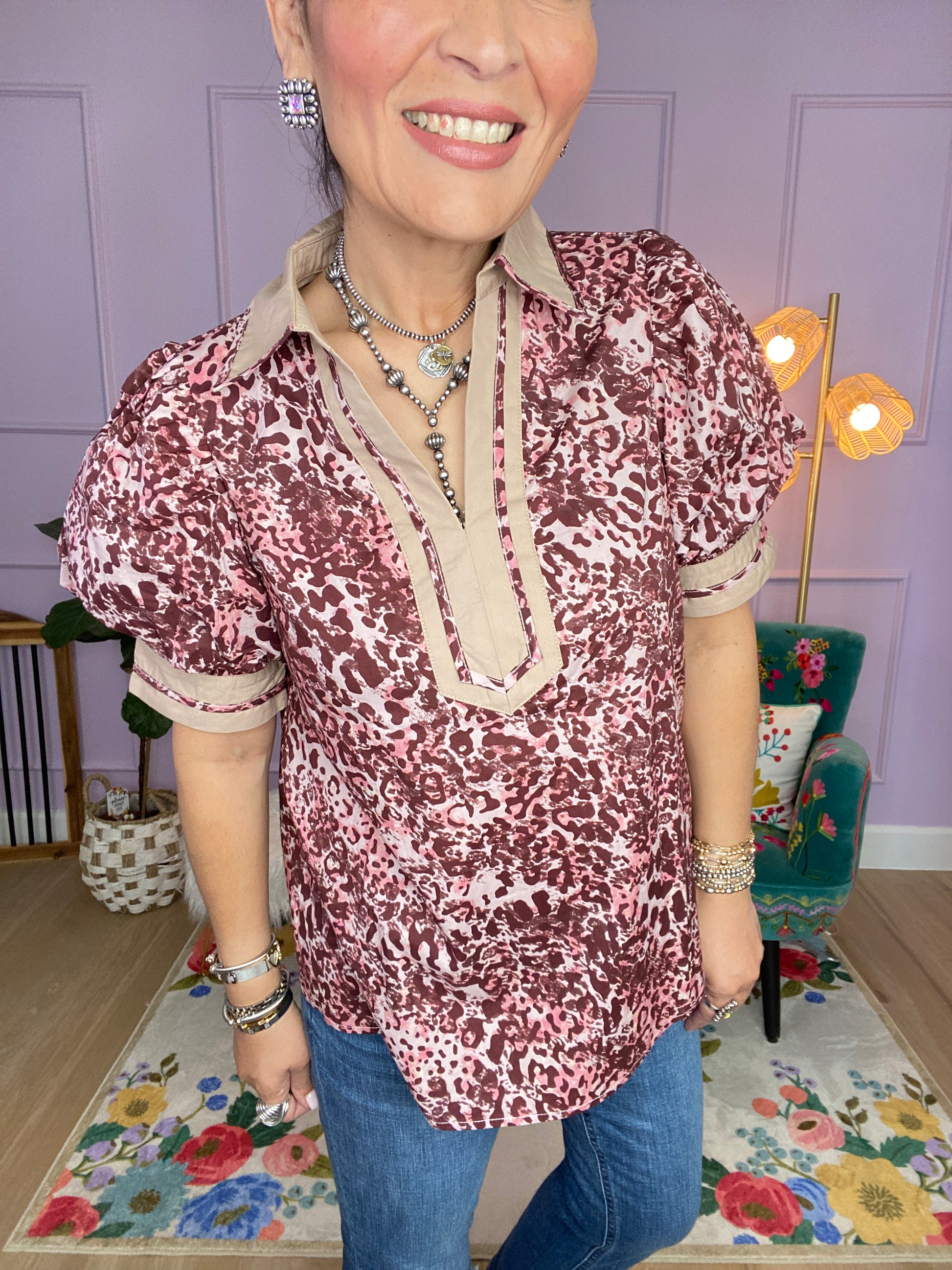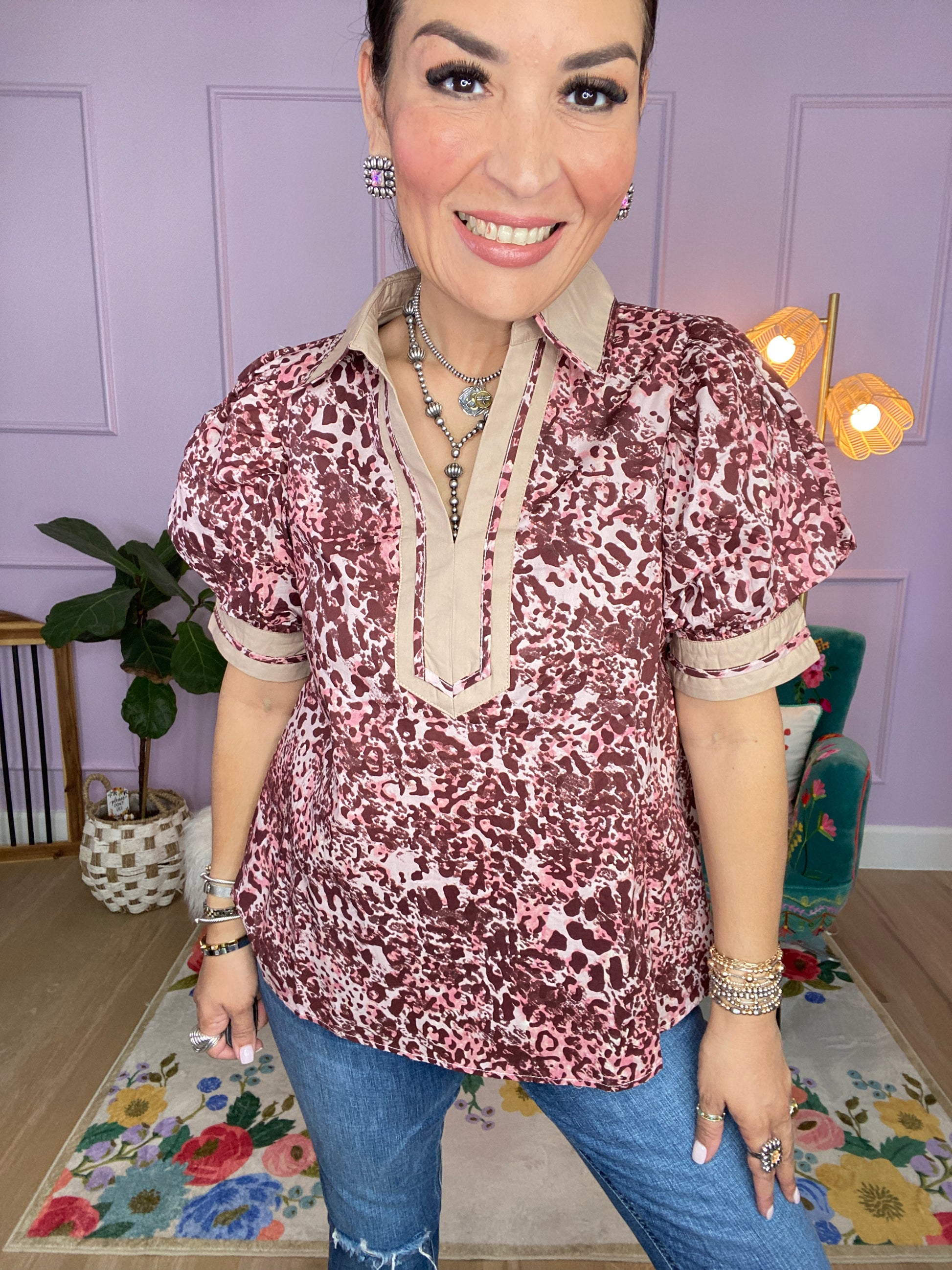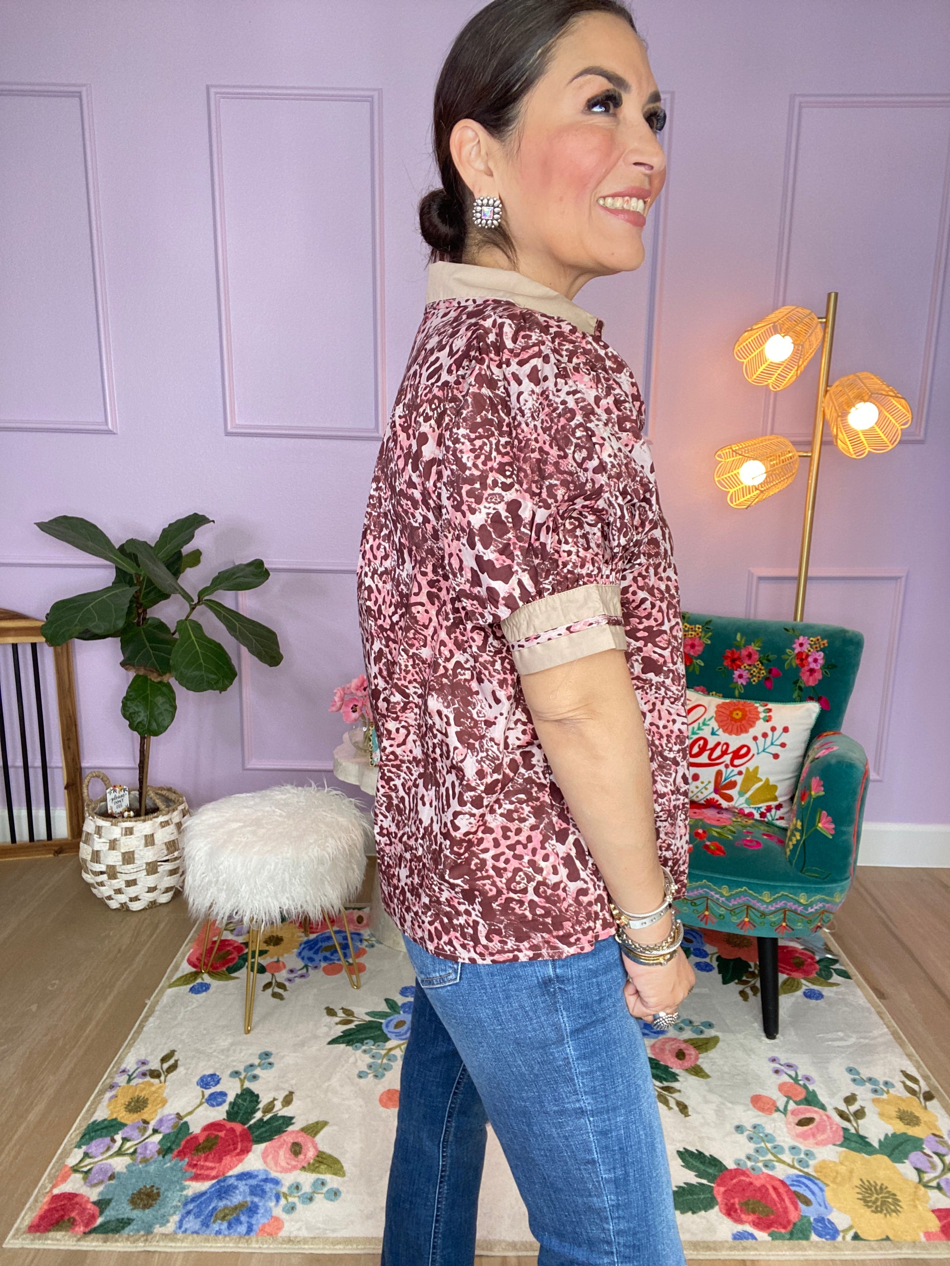 Animal pattern short cuff band sleeve top featuring contrast accent cuff band and collar. Unlined. Woven. Non-sheer. Lightweight.