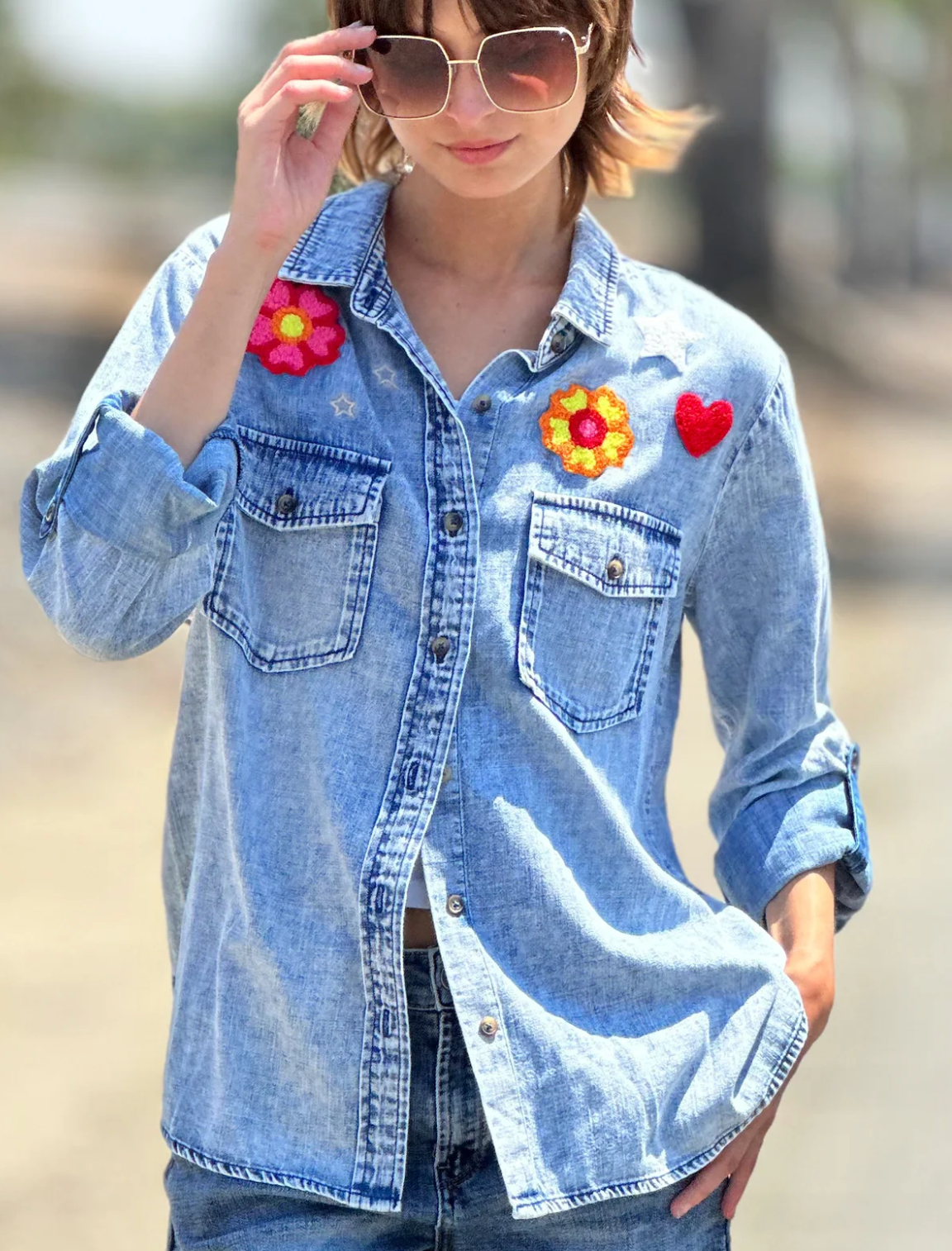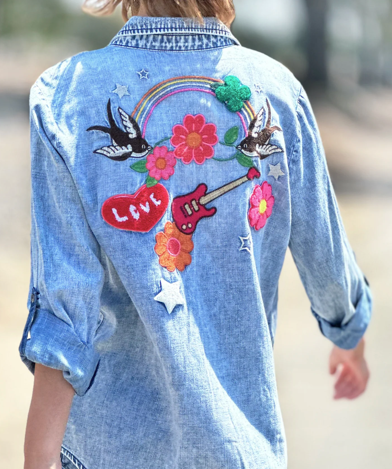 Birds of a Feather flock together, in this gorgeous summer-fest inspired classic denim shirt, with button pockets and sleeves.