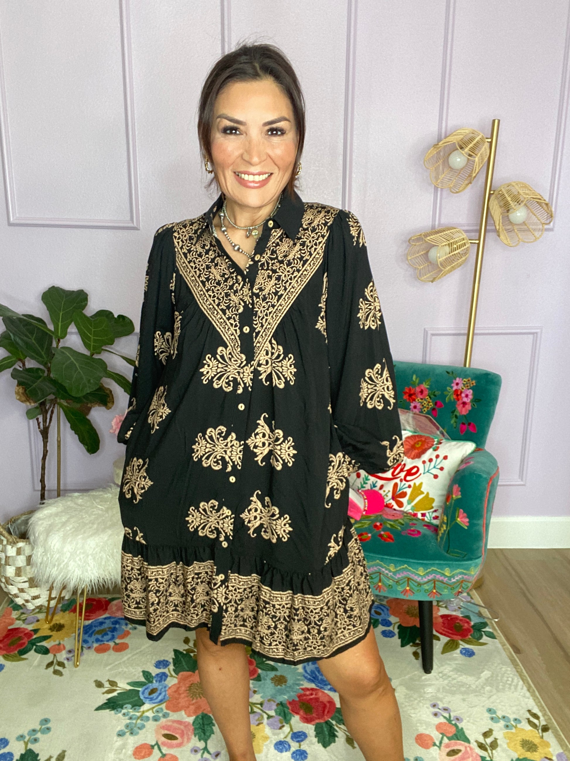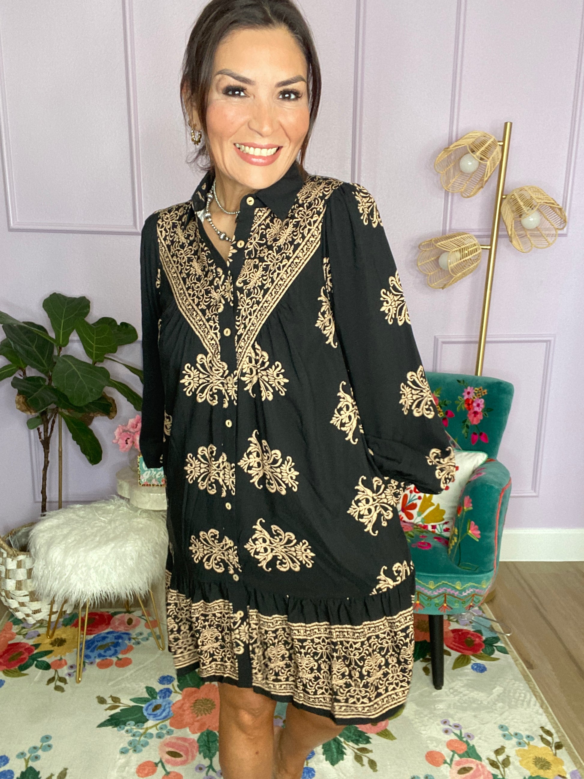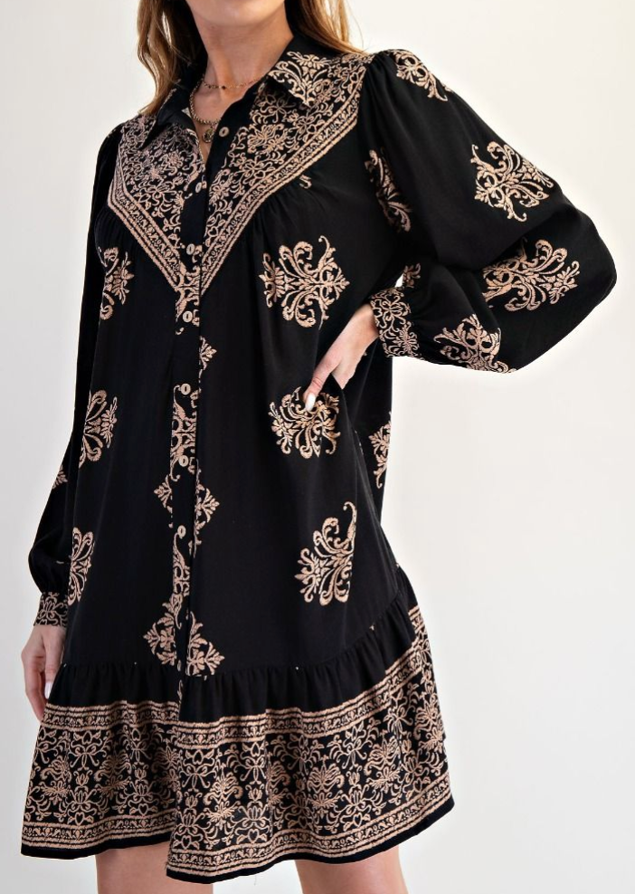 BORDER PRINTED CHALLIS SHIRT DRESS