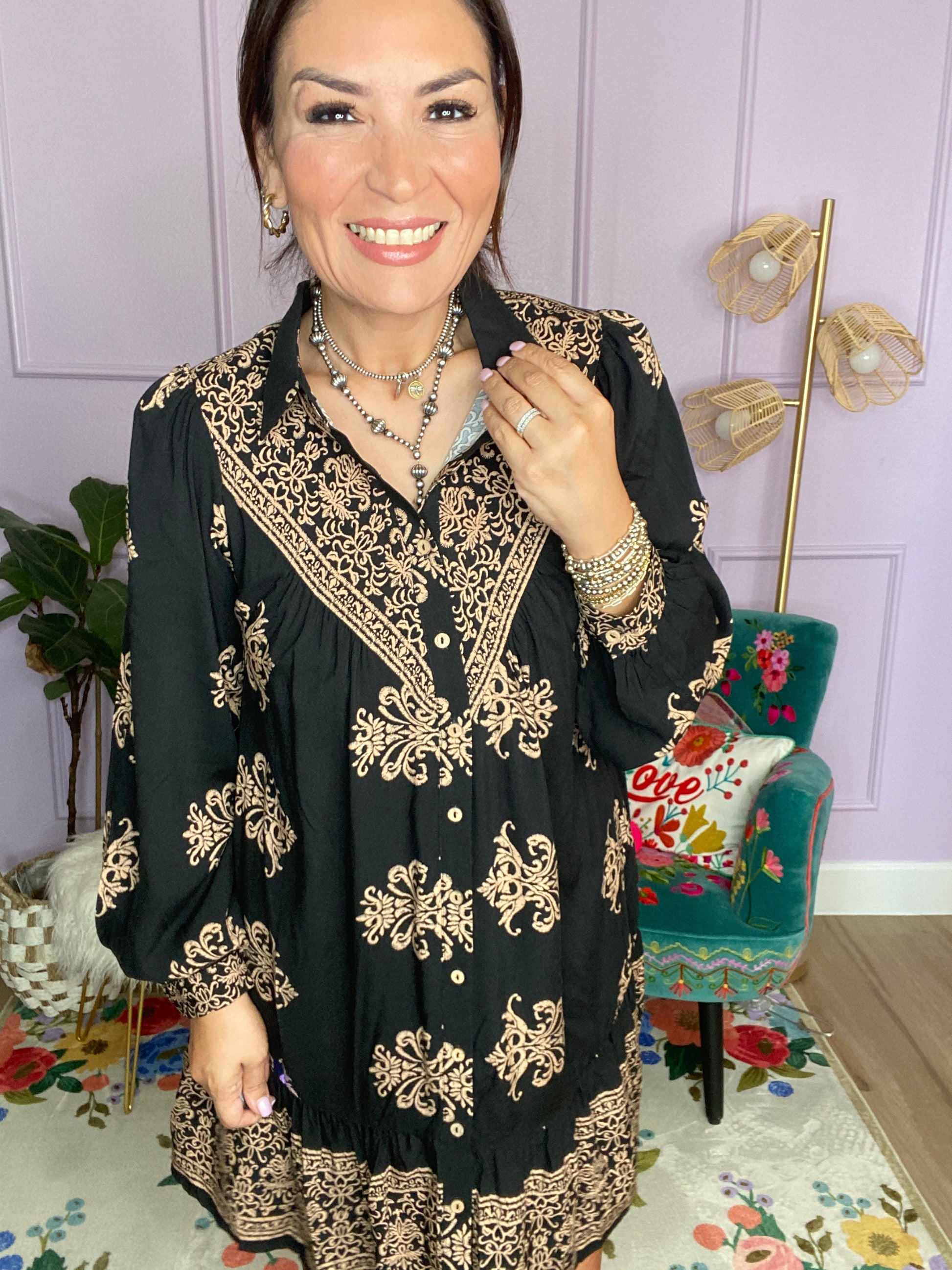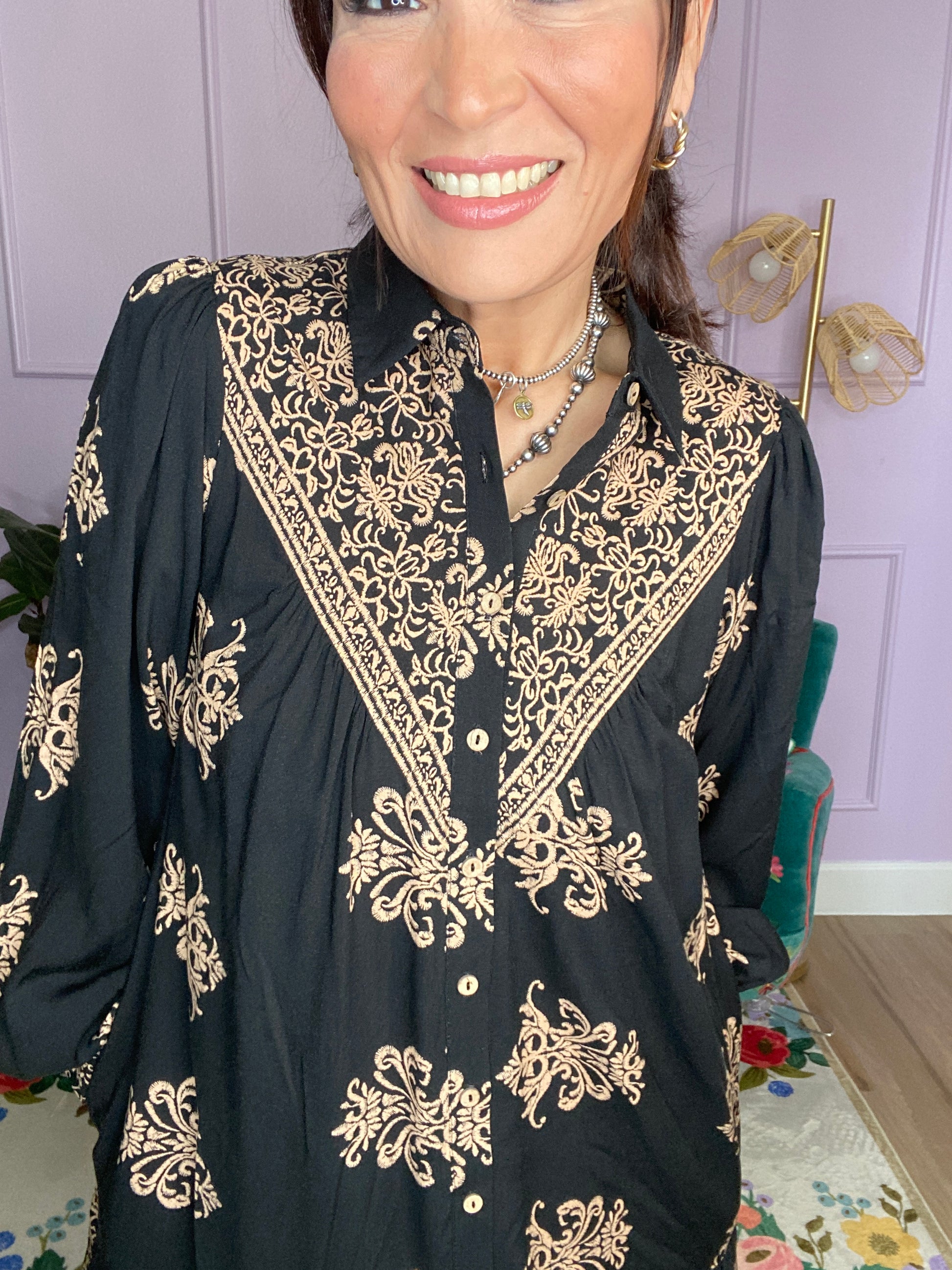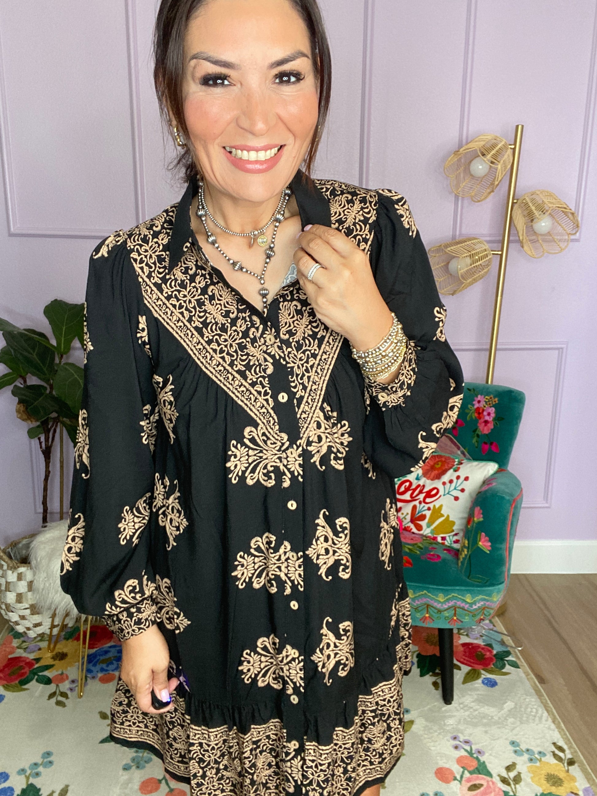 BORDER PRINTED CHALLIS SHIRT DRESS