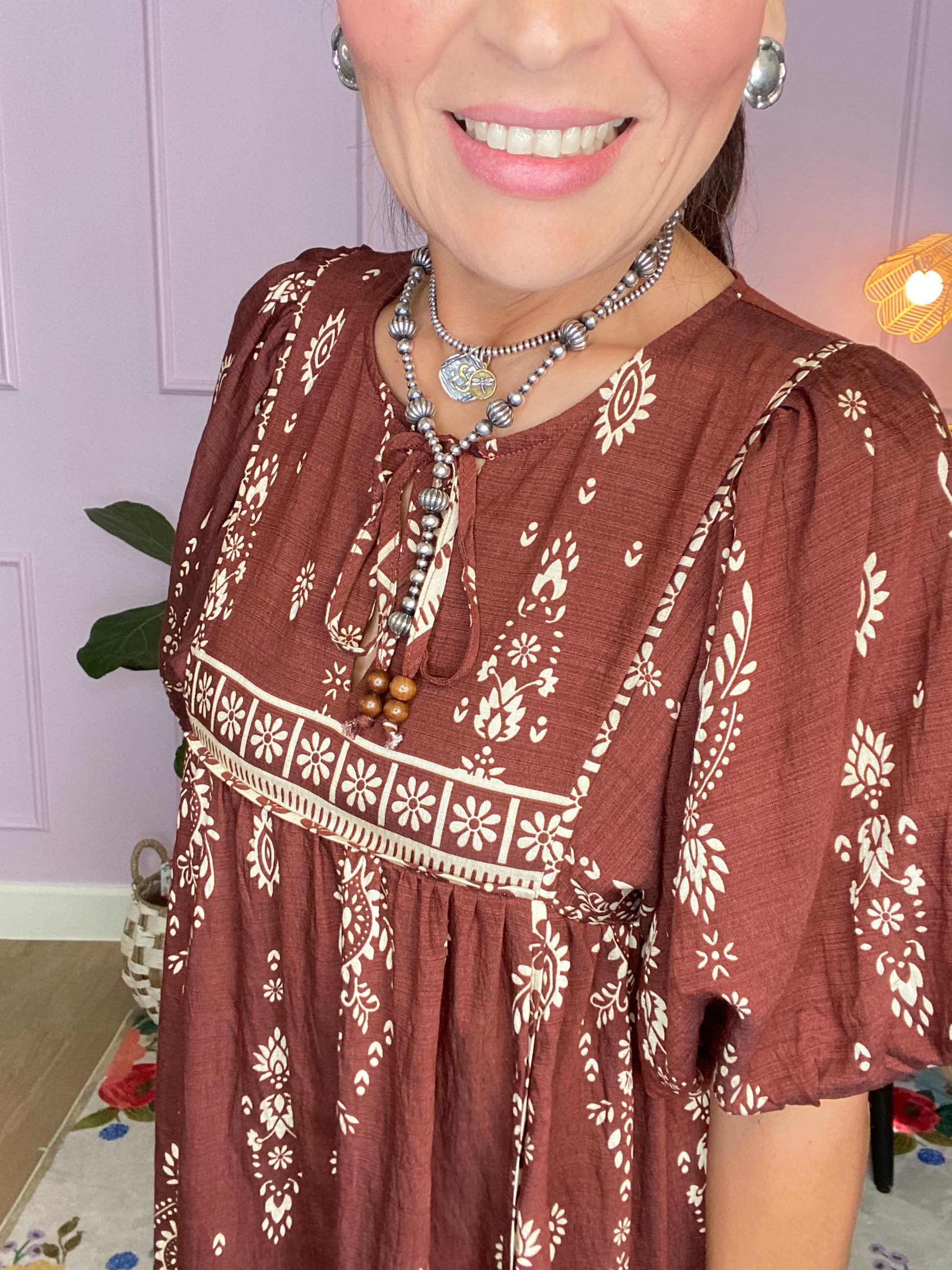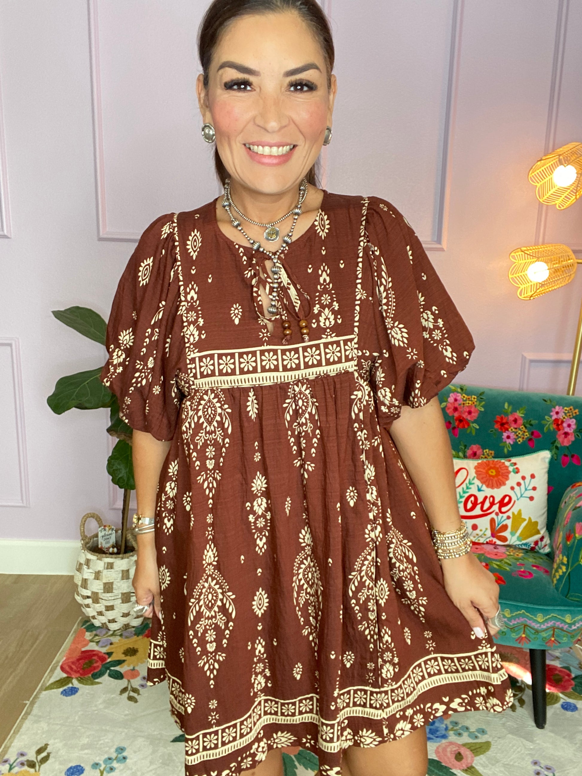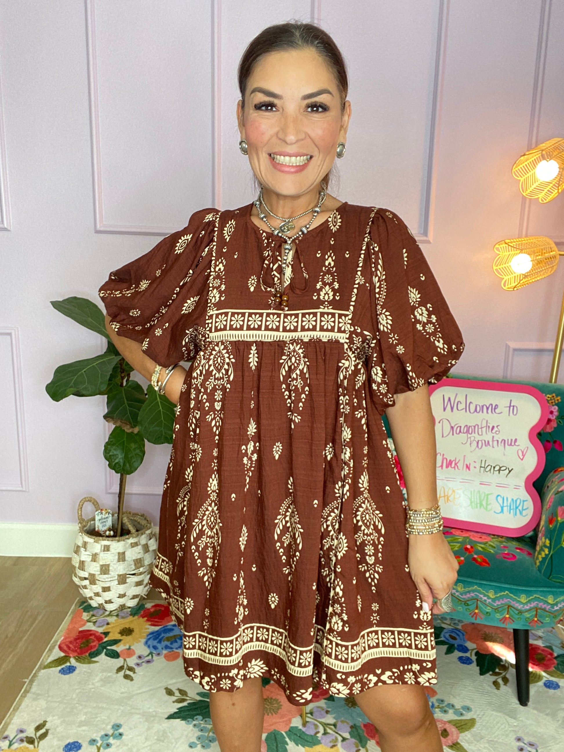 Boho vibes meet effortless charm in this beautiful babydoll mini dress. The warm brown base is adorned with a delicate cream print, while the neck tie strings and puff sleeves add a feminine, flowy touch. Lightweight and breathable, it's the perfect piece for staying cute and comfy all day long.