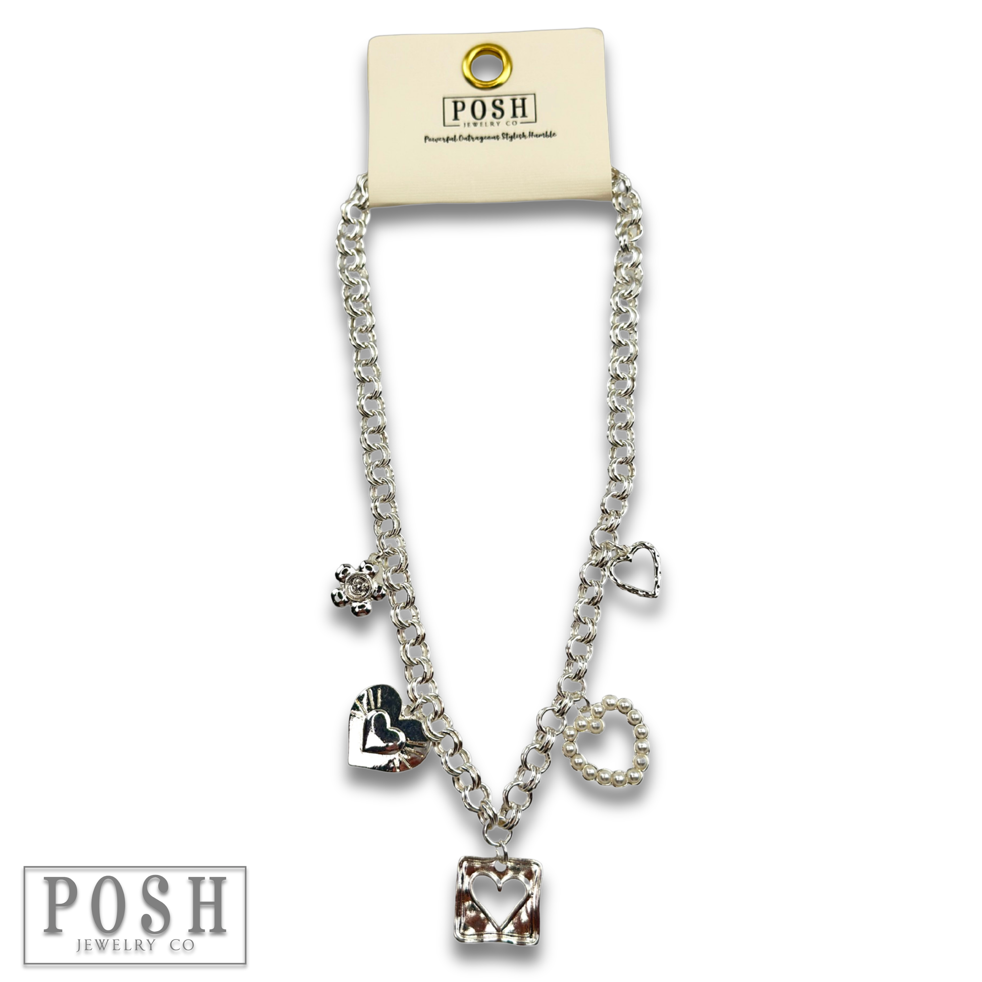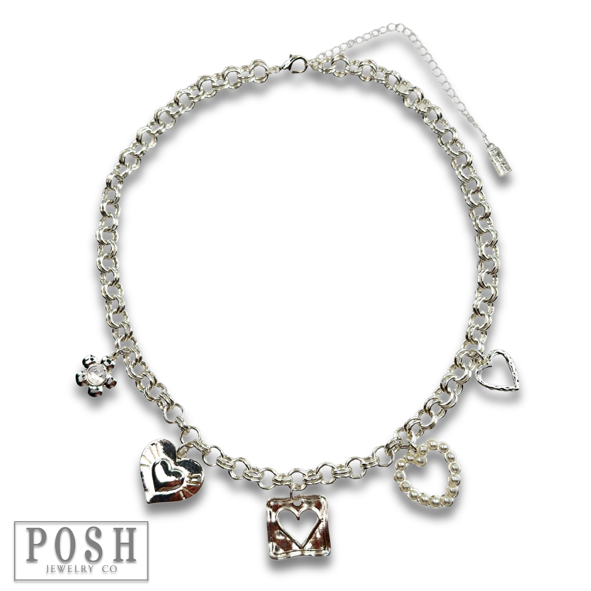 This fun and flirty charm necklace has a variety of heart and flower charms. They're all together on a double link chain necklace.