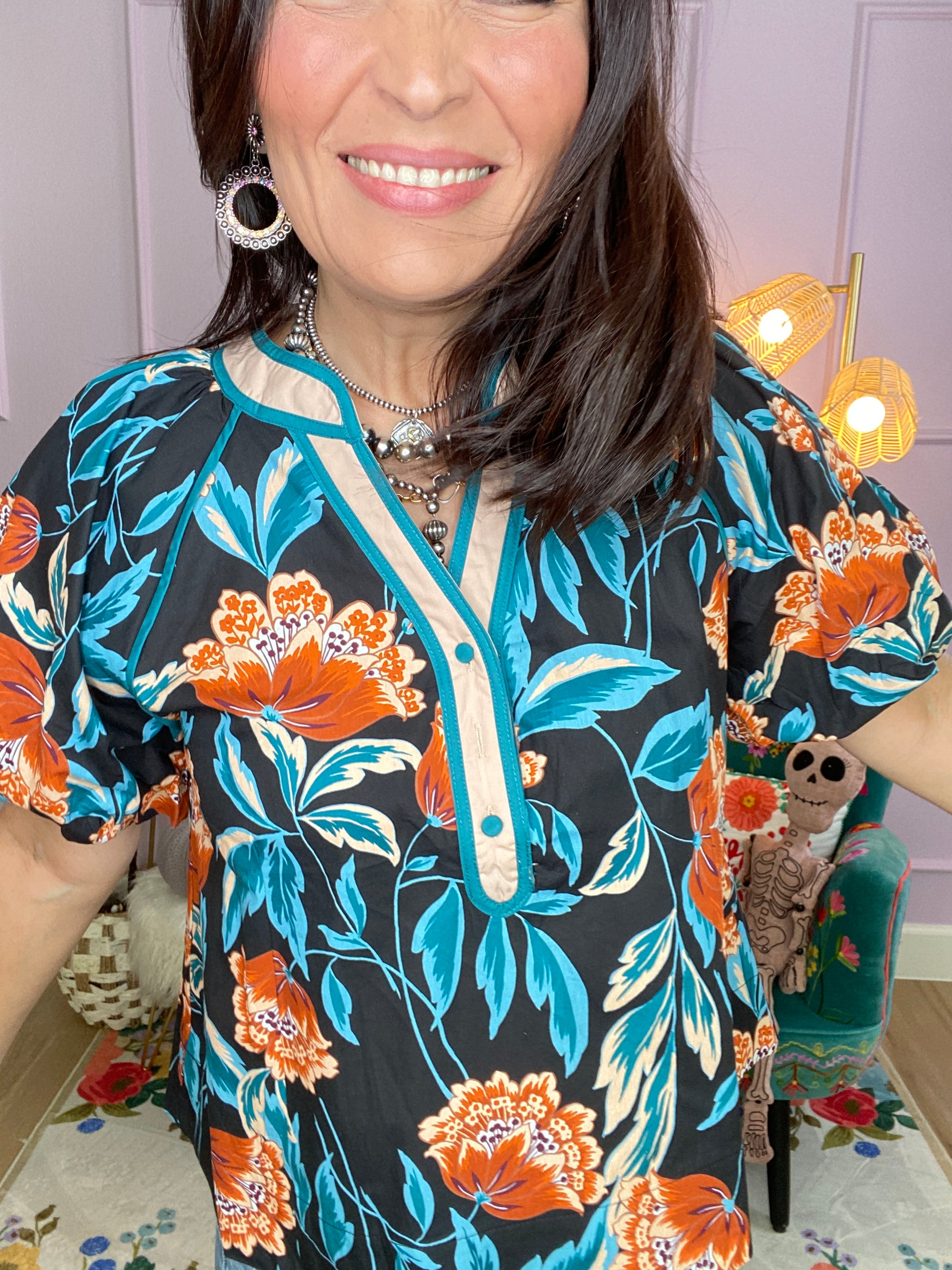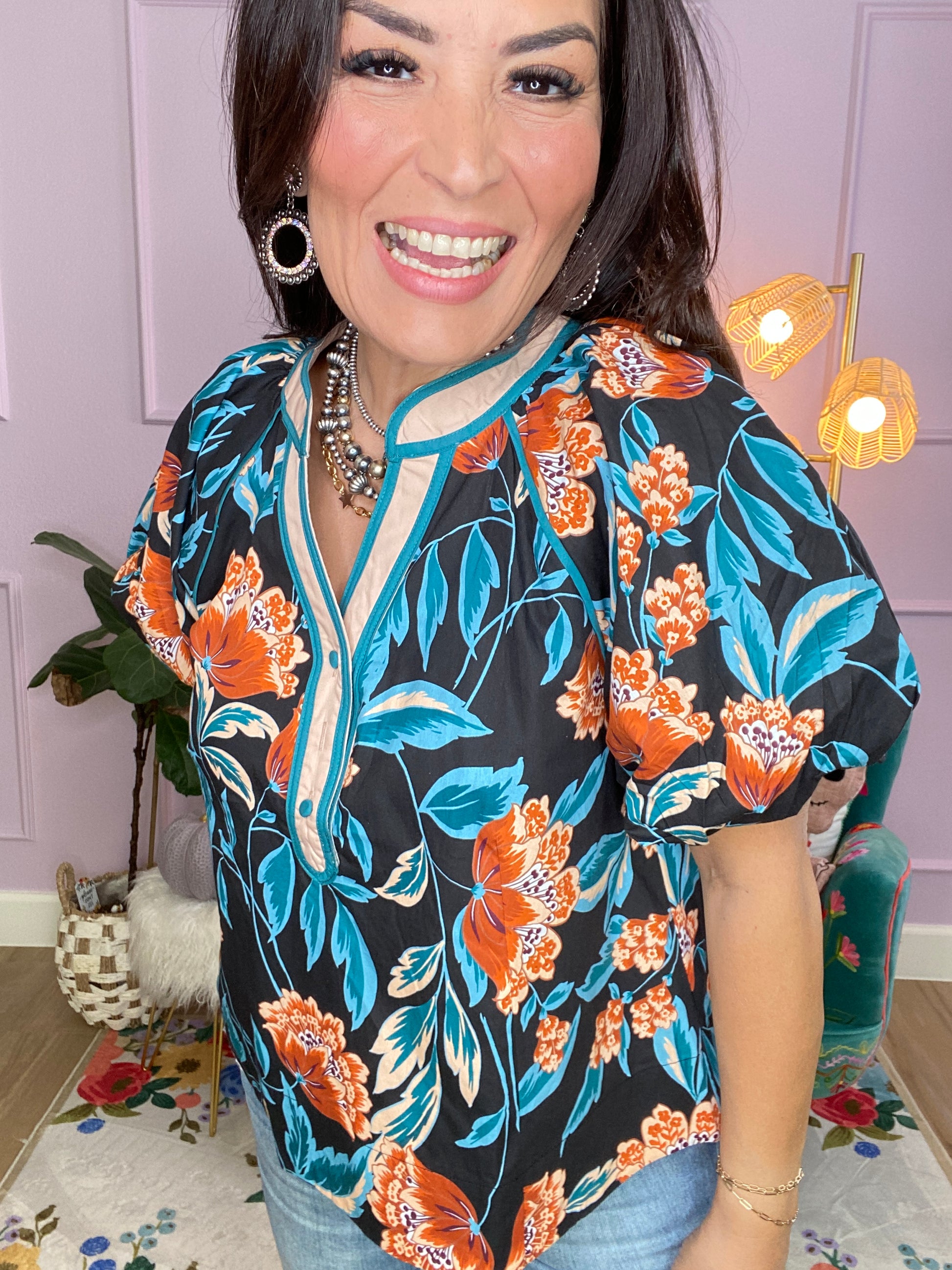 Feminine and fun, this floral top is designed with short bubble sleeves and a playful striped contrast accent for a unique twist. The button-front closure adds classic charm, making it an easy go-to for any occasion.