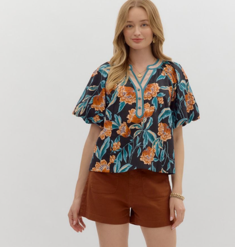 Floral Bubble Sleeve Contrast Top