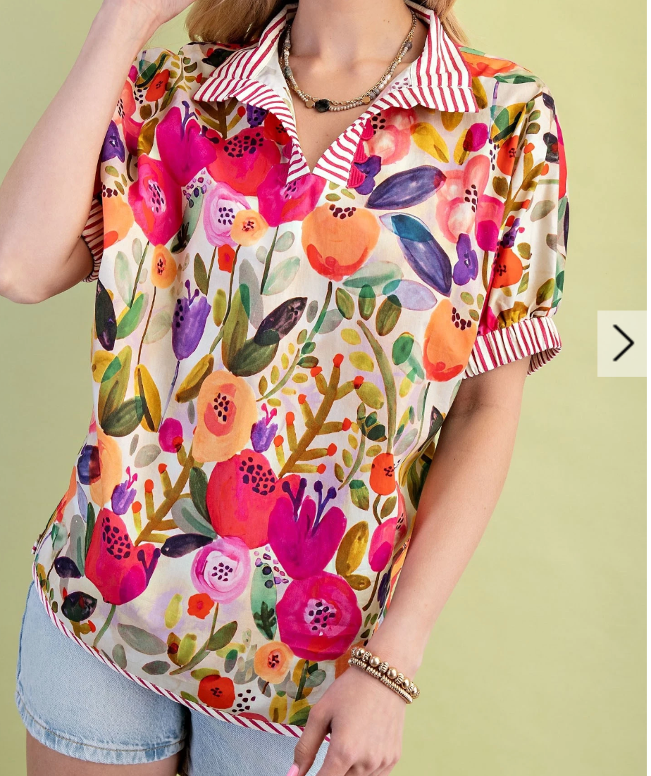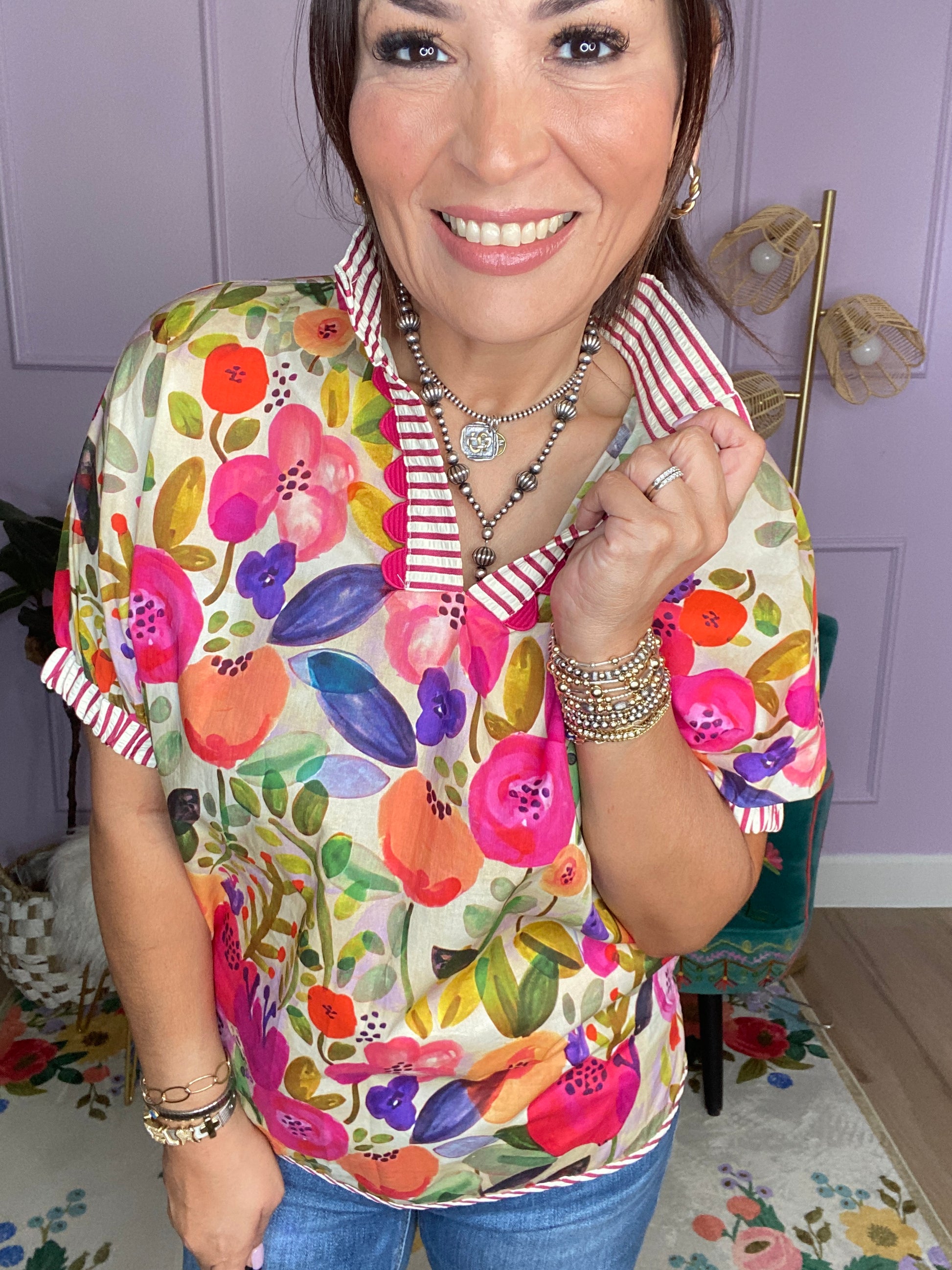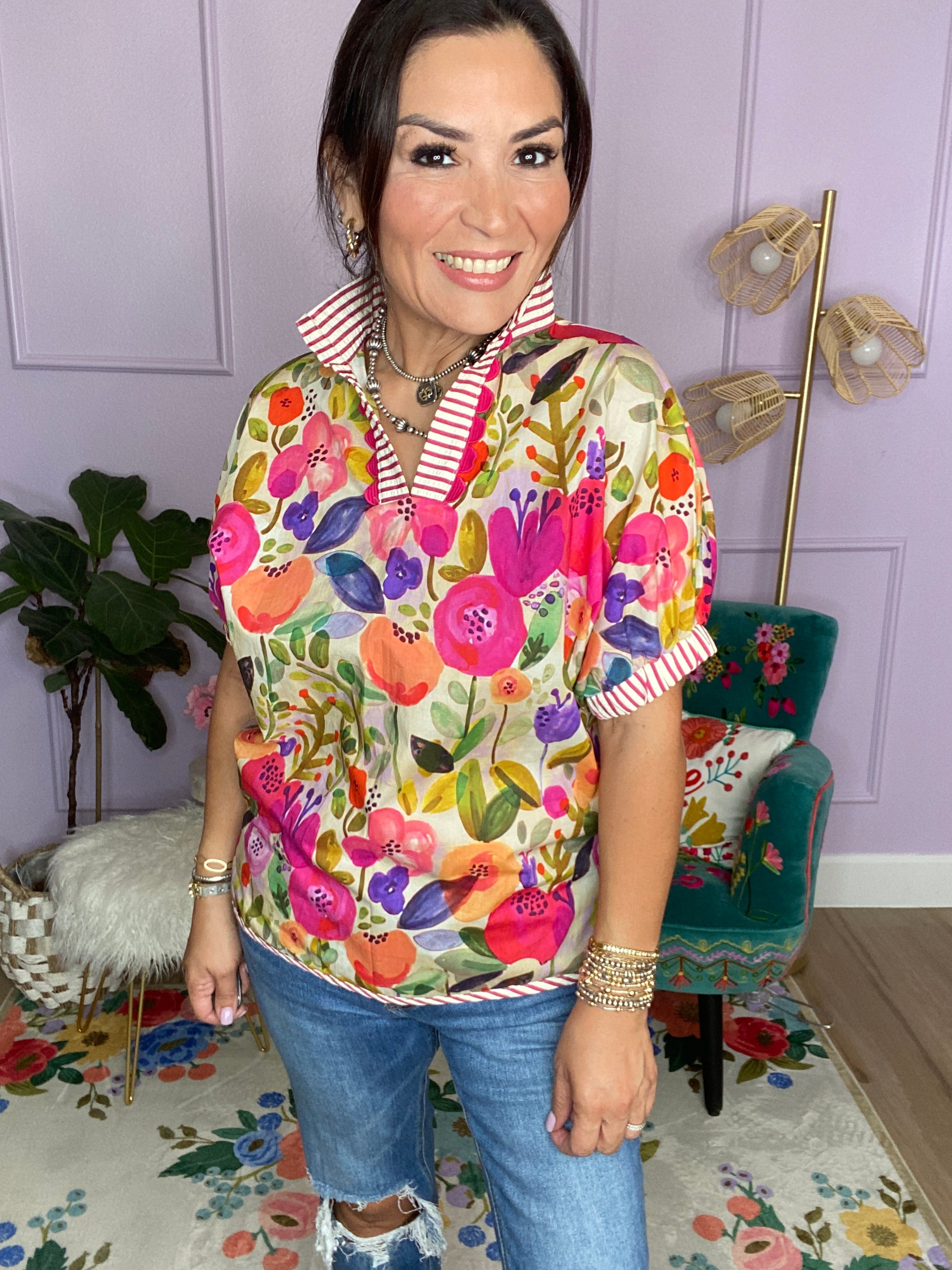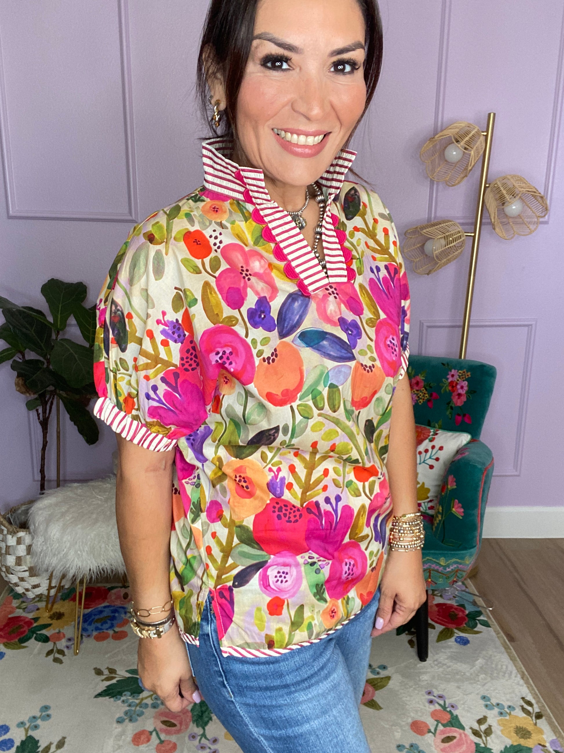 Floral Mock-Neck Top with Contrasting Stripe Accents and Decorative Trim