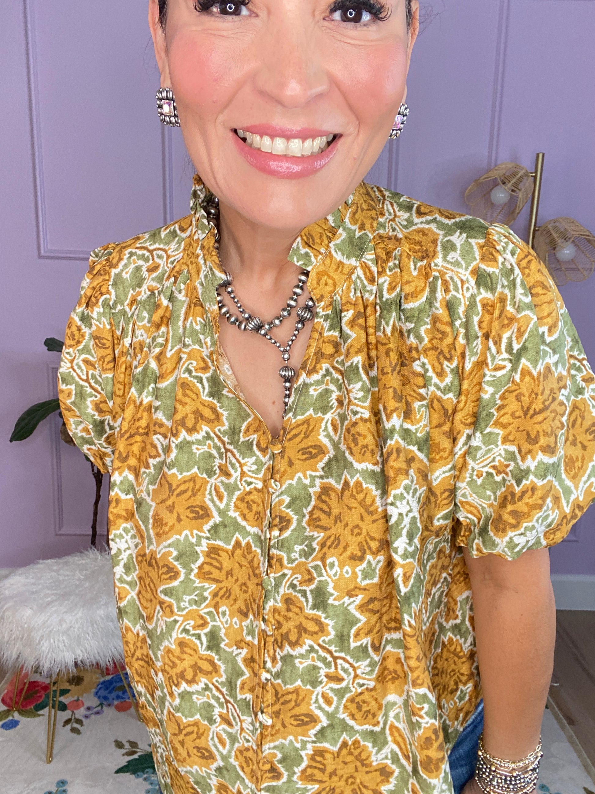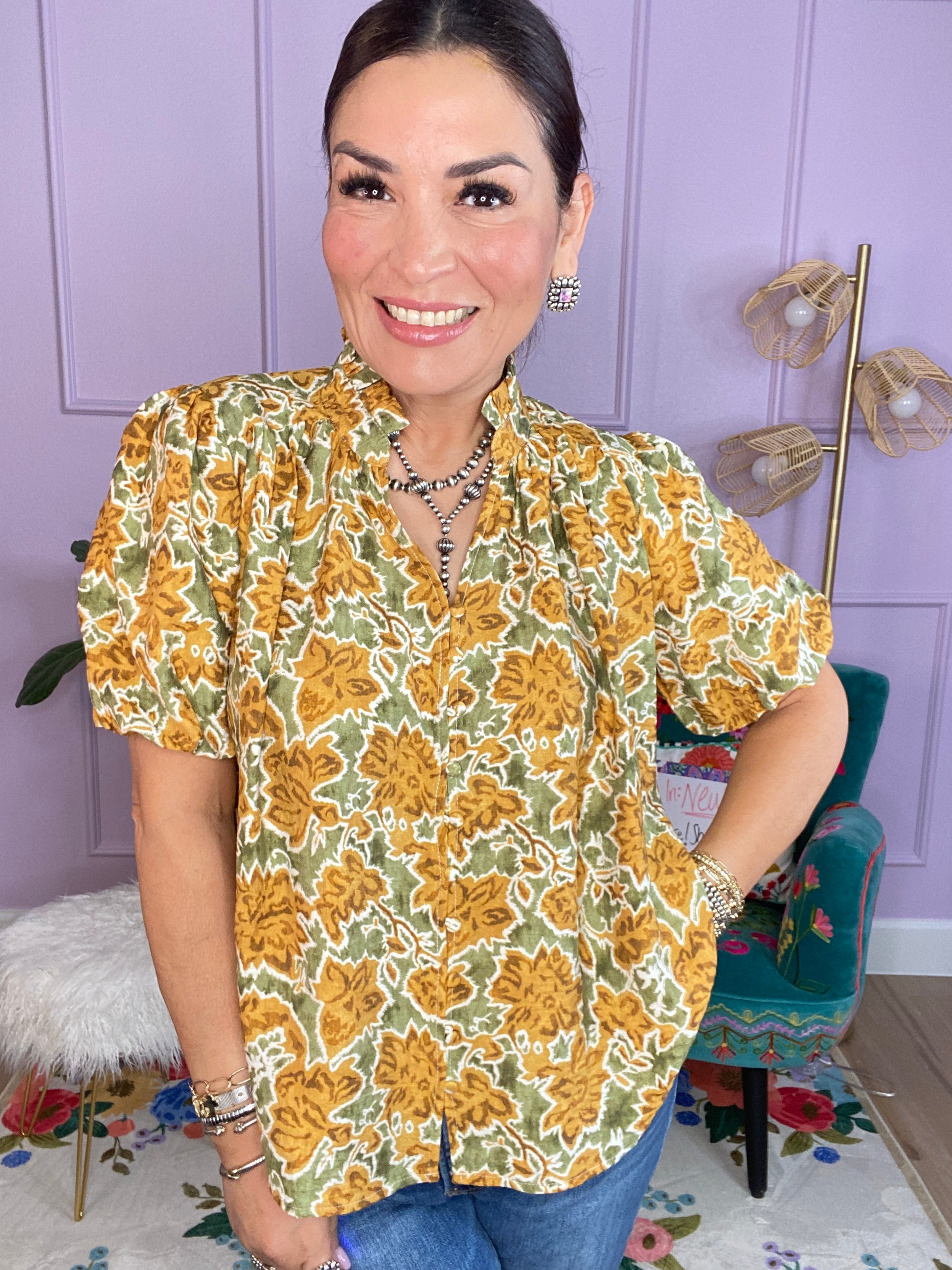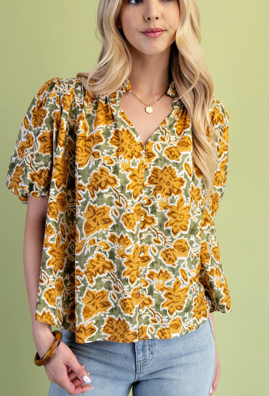 Floral Print Button Down Top with Short Puff Sleeves and a Ruffled Neck