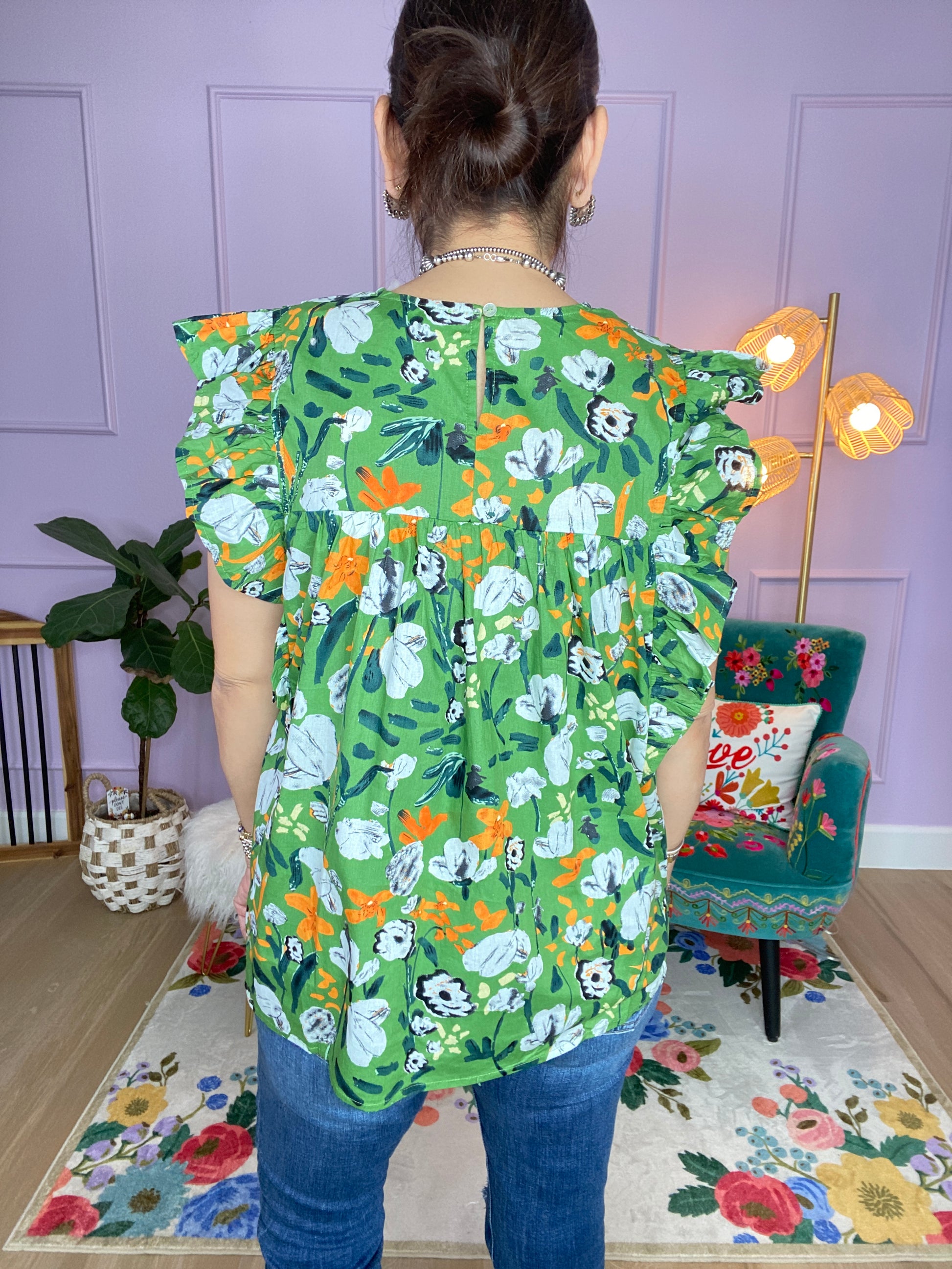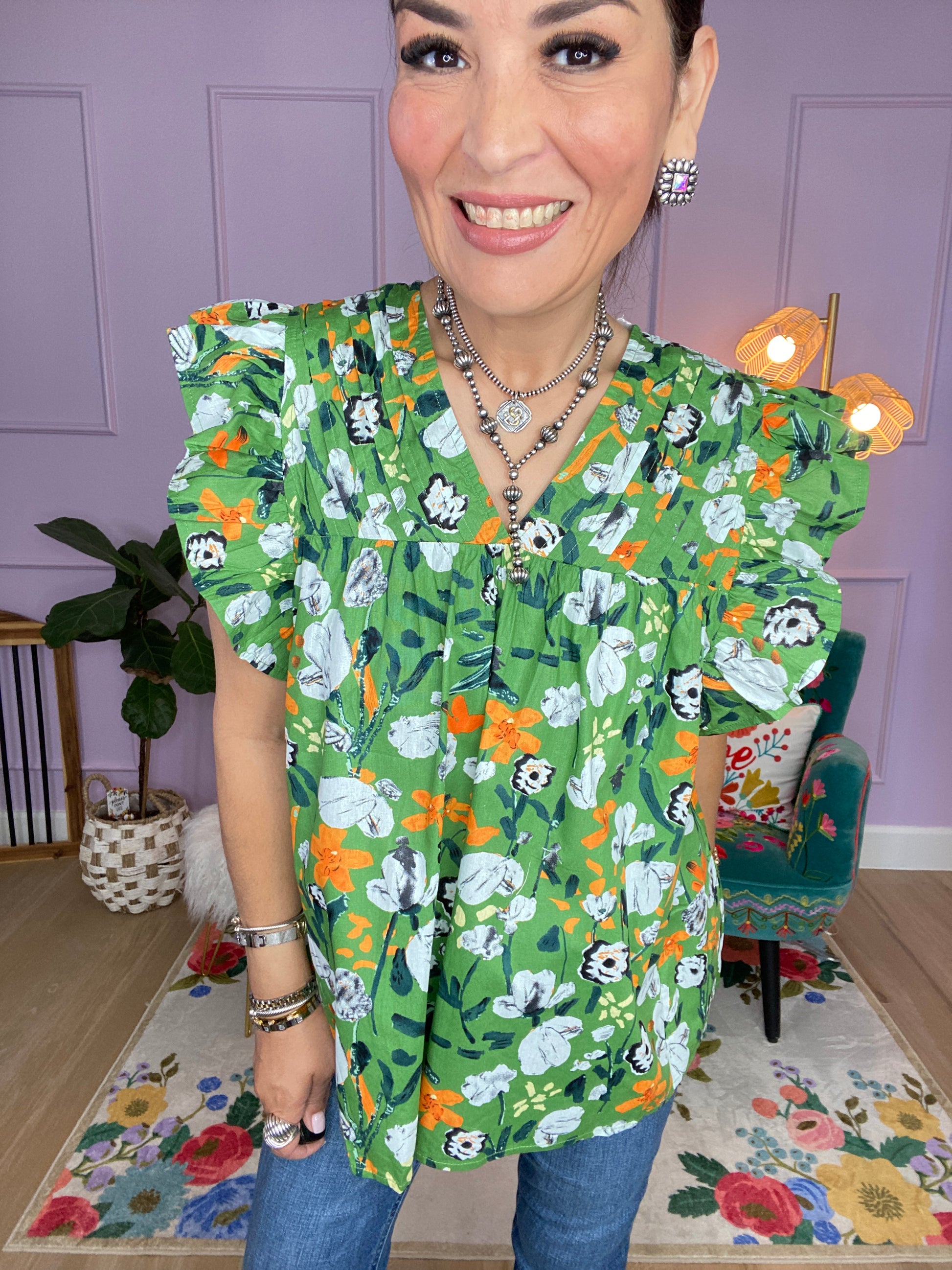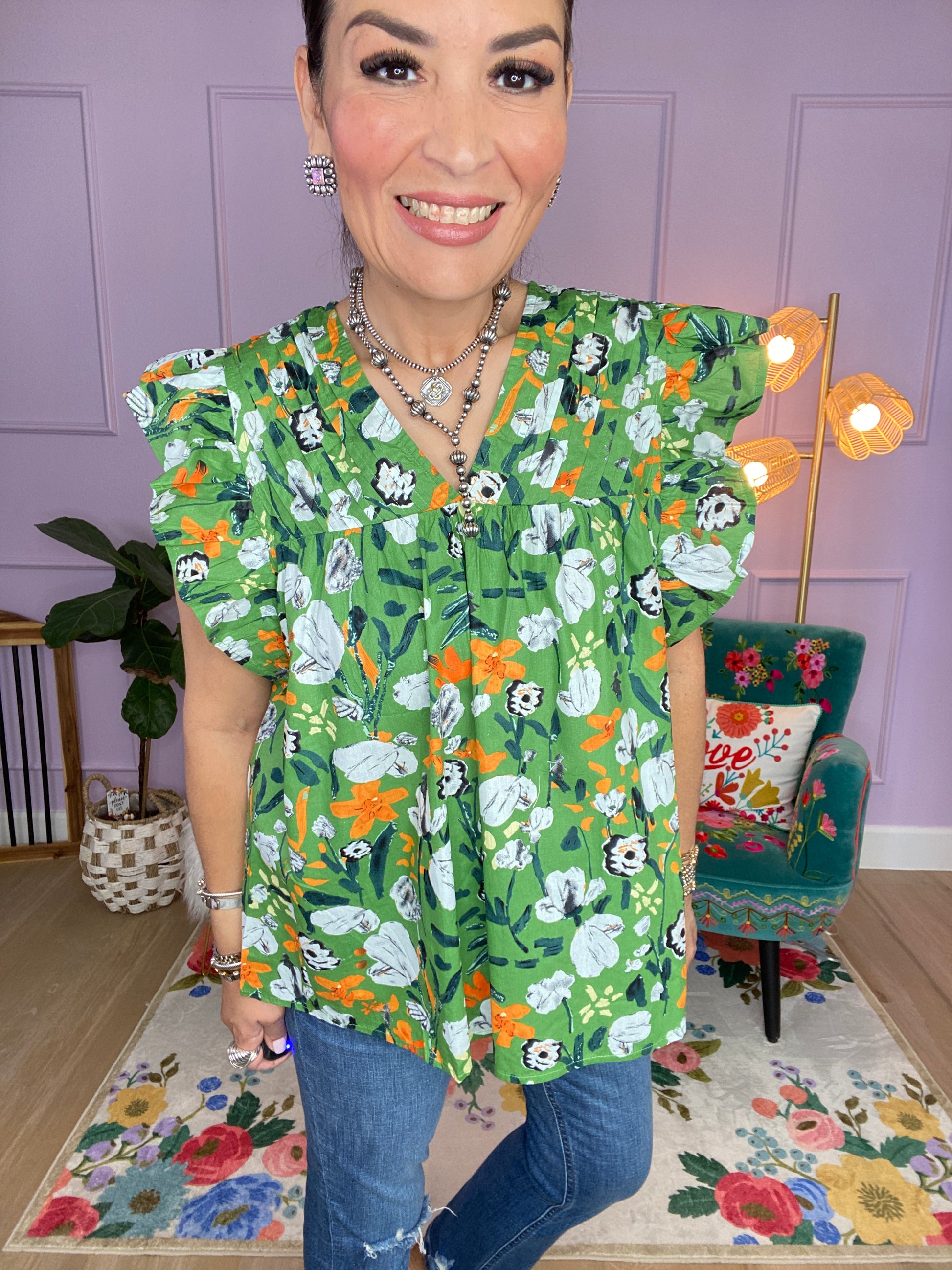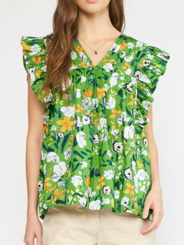 Floral print v-neck short sleeve top featuring pintuck detail at bust. Button closure at back. Unlined. Woven. Non-sheer. Lightweight.