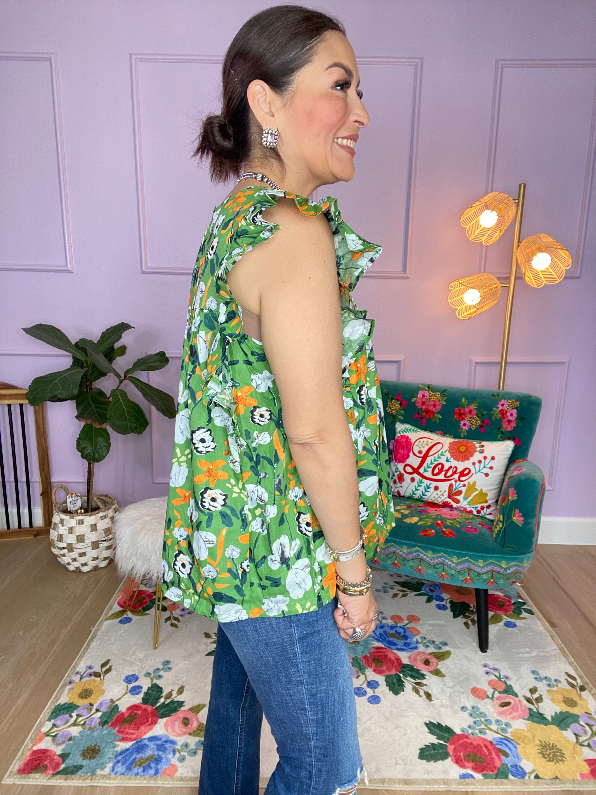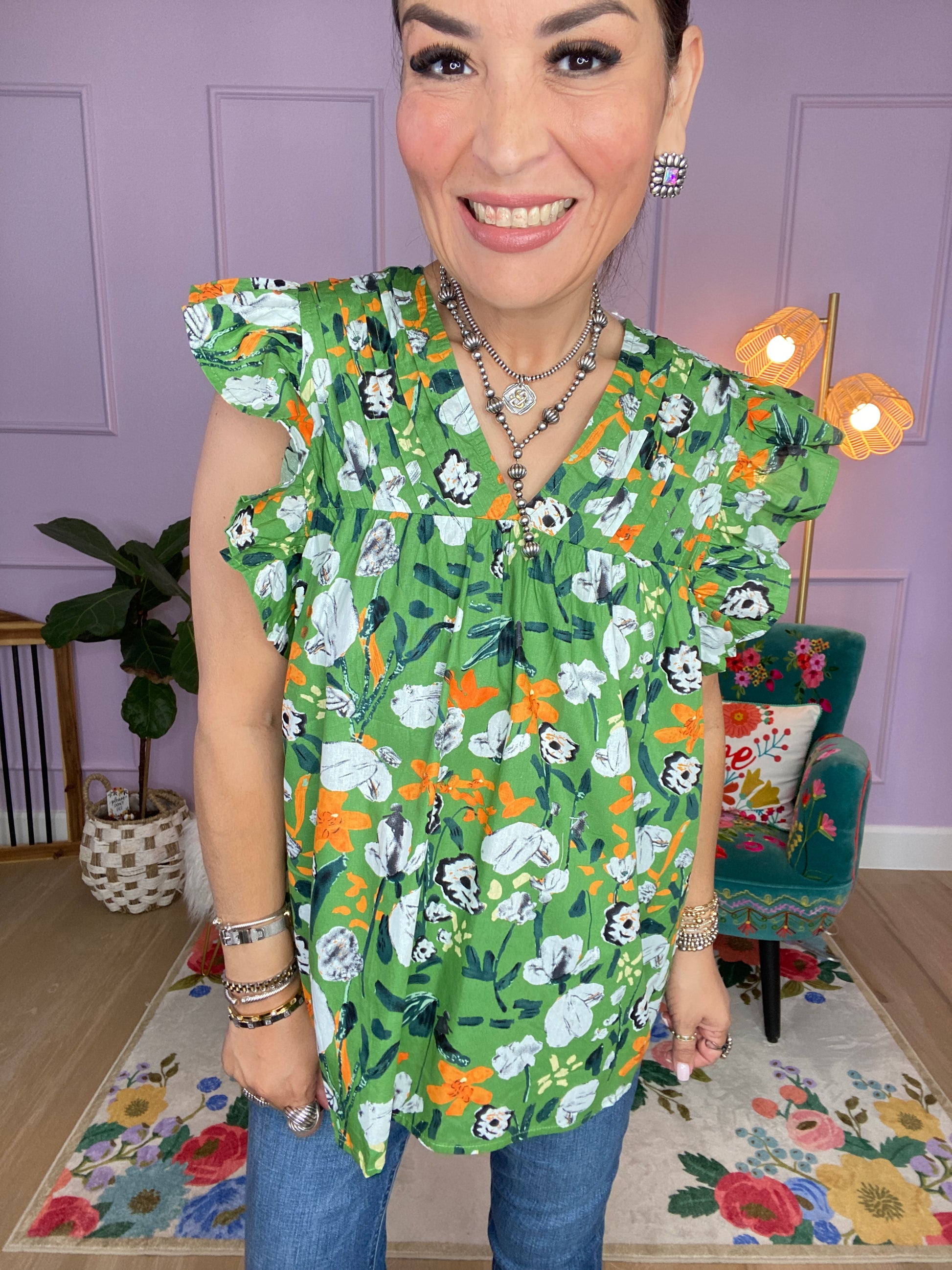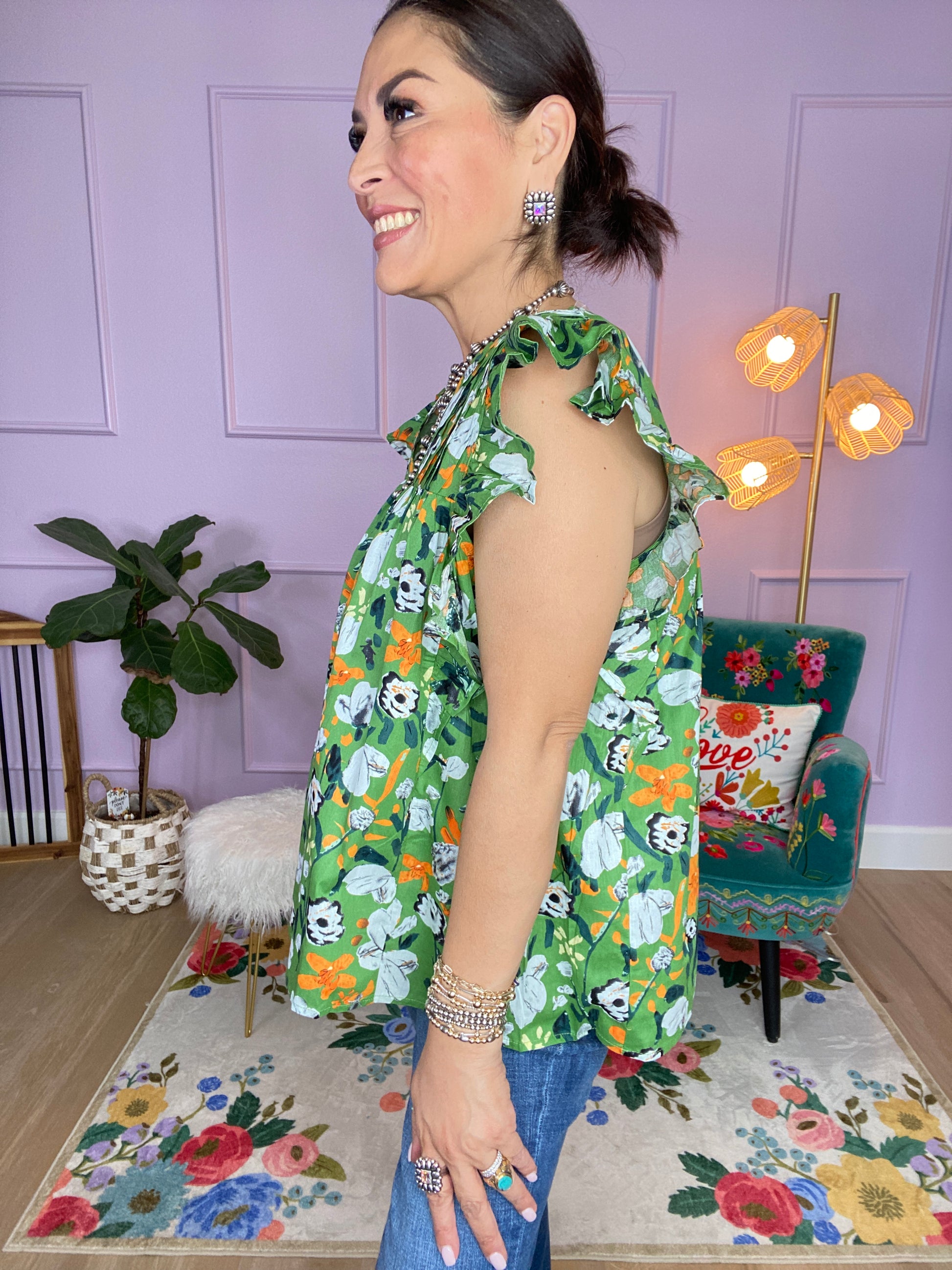 Floral print v-neck short sleeve top featuring pintuck detail at bust. Button closure at back. Unlined. Woven. Non-sheer. Lightweight.