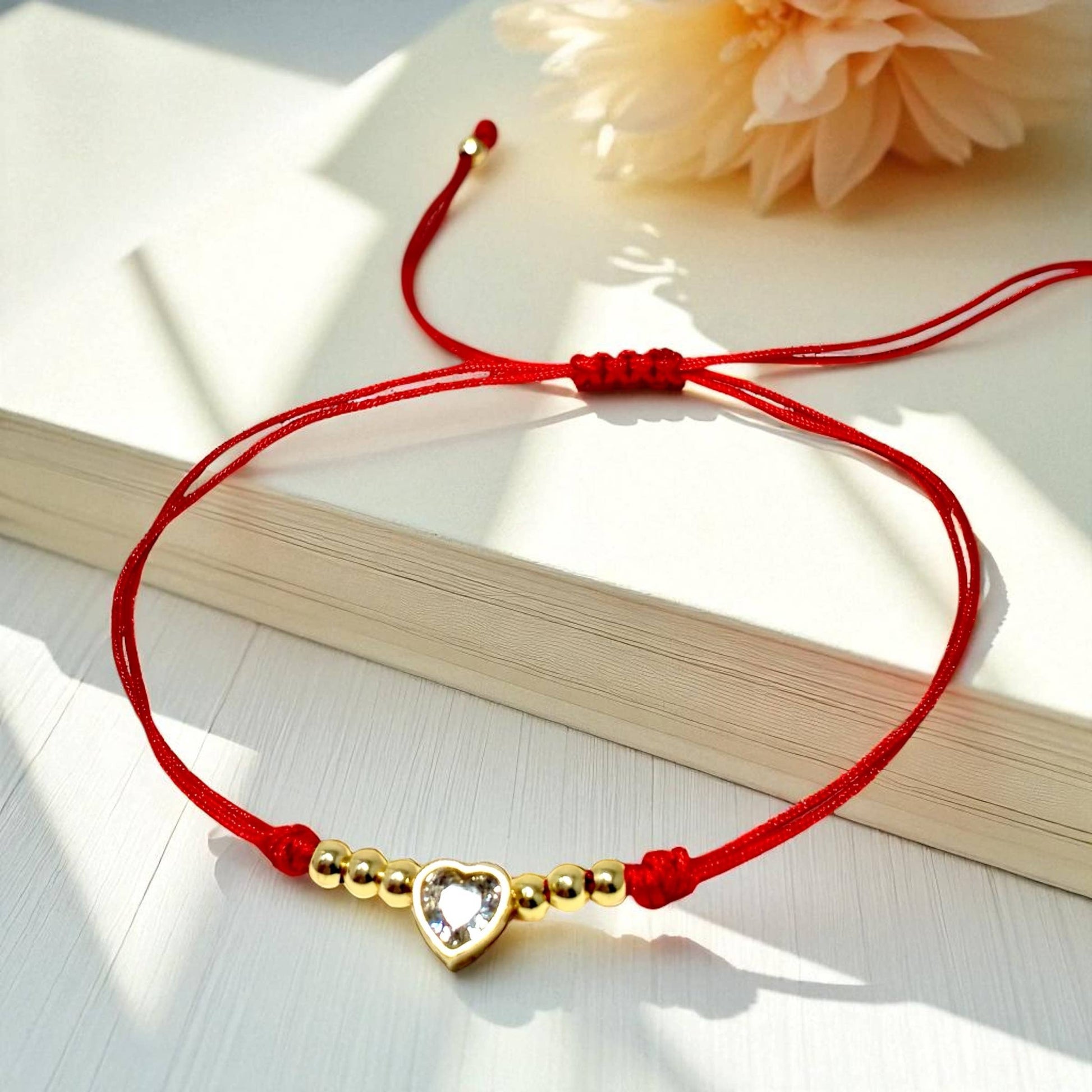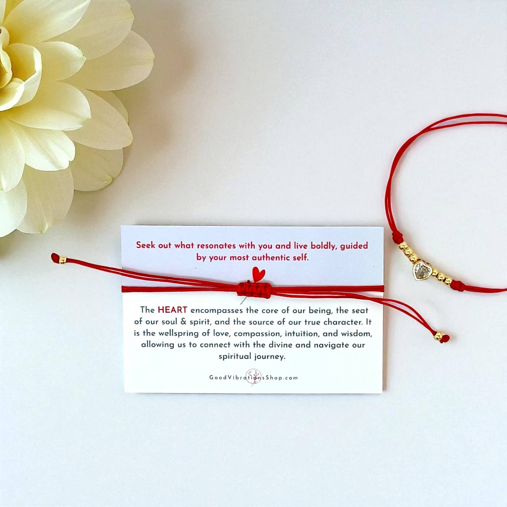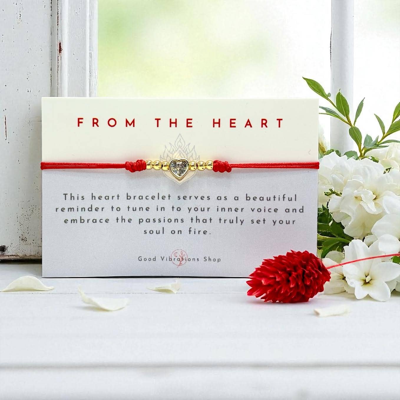 Our "From the Heart Bracelet" is a beautiful embodiment of love and self-discovery. Featuring a stunning cubic zirconia heart with 14 K gold plating, this bracelet radiates a purposeful brilliance that captivates the eye. The adjustable red cord, rich with spiritual significance, symbolizes protection, strength, and the deep connections of love that unite us with our true selves and one another.