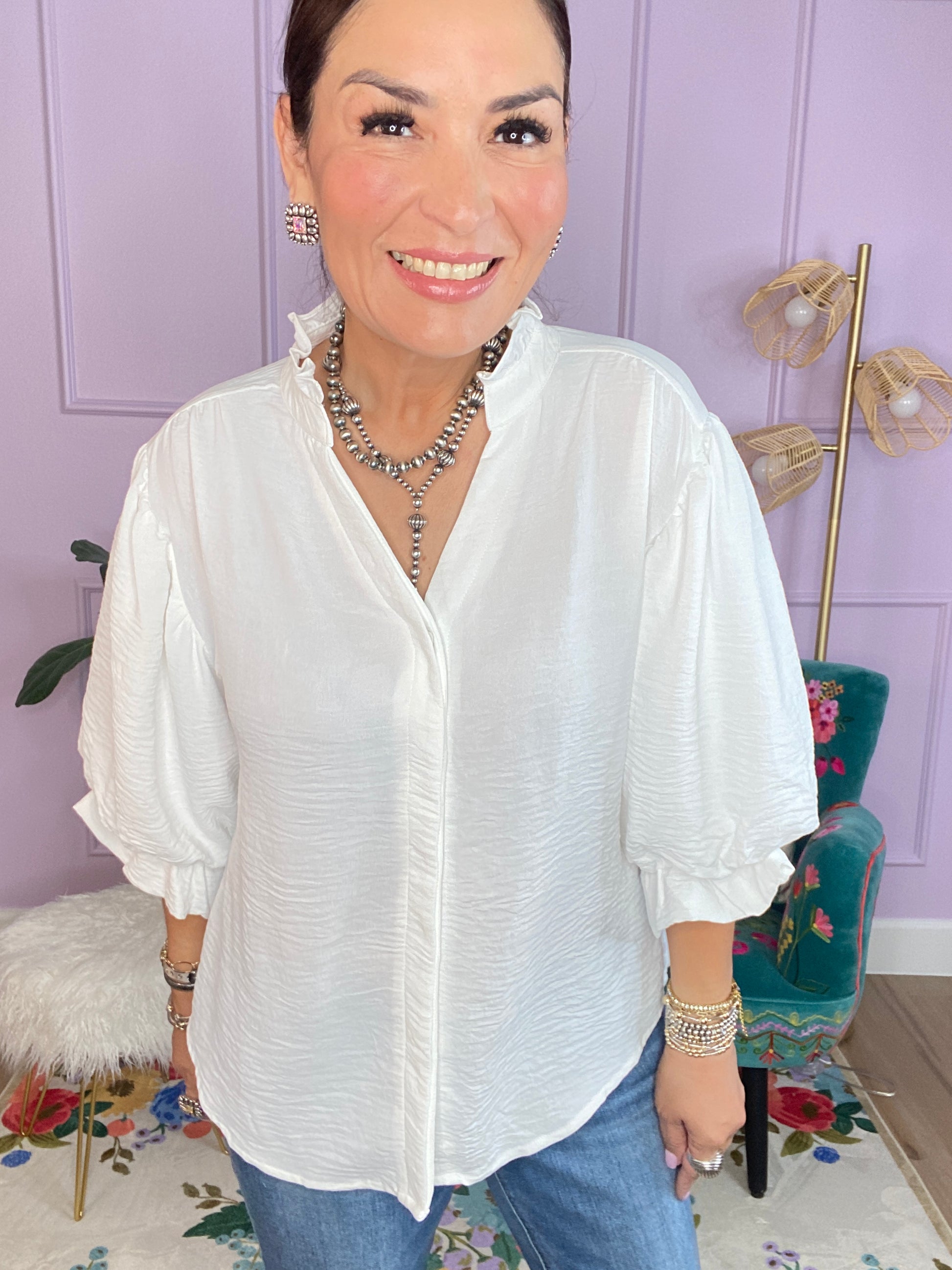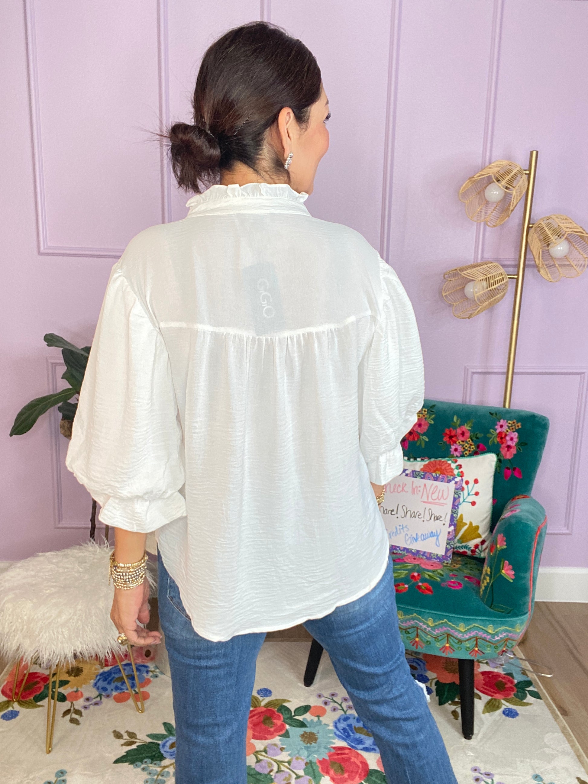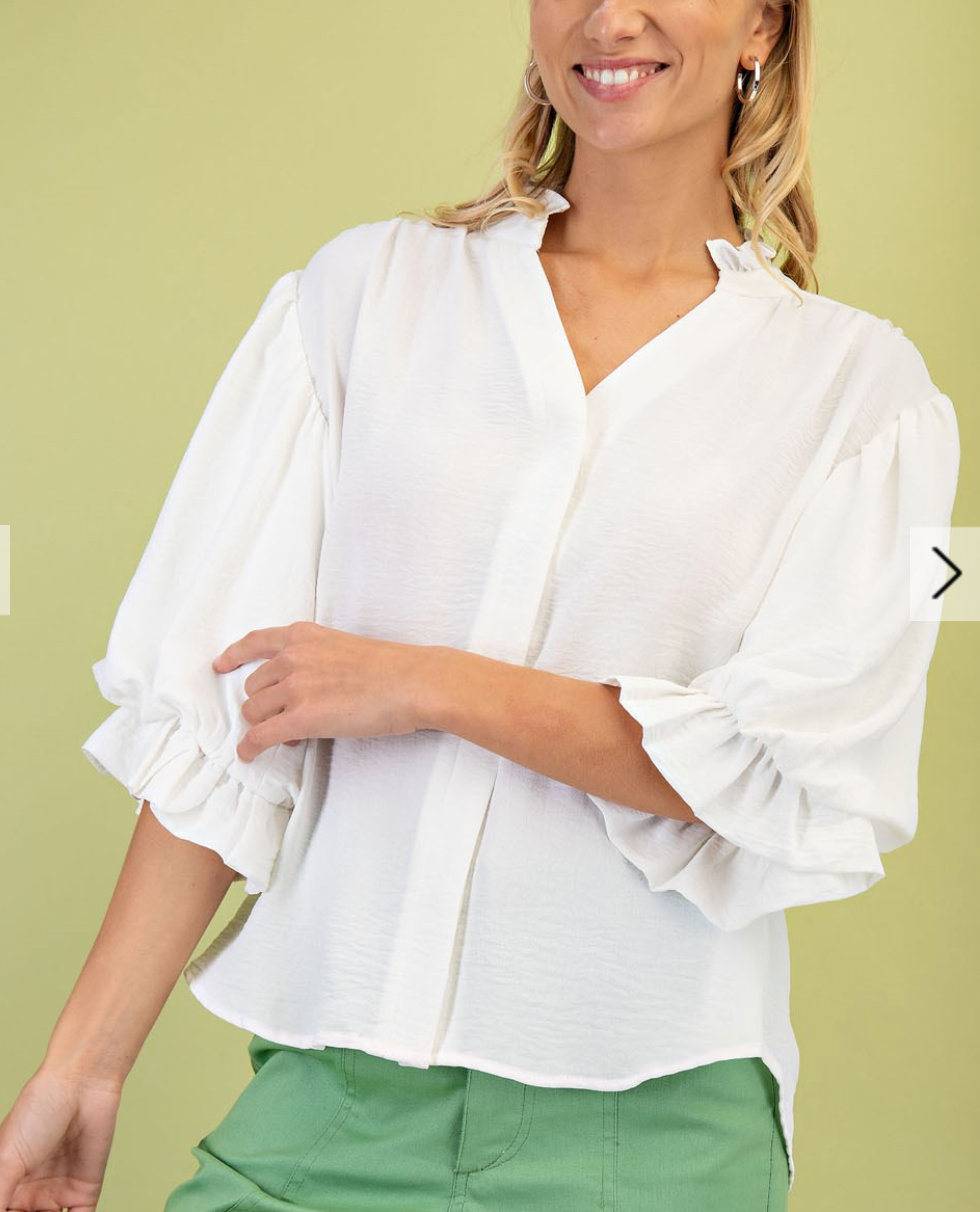 3/4 Length Gathered Balloon Sleeve Blouse with a Rounded Back Yoke