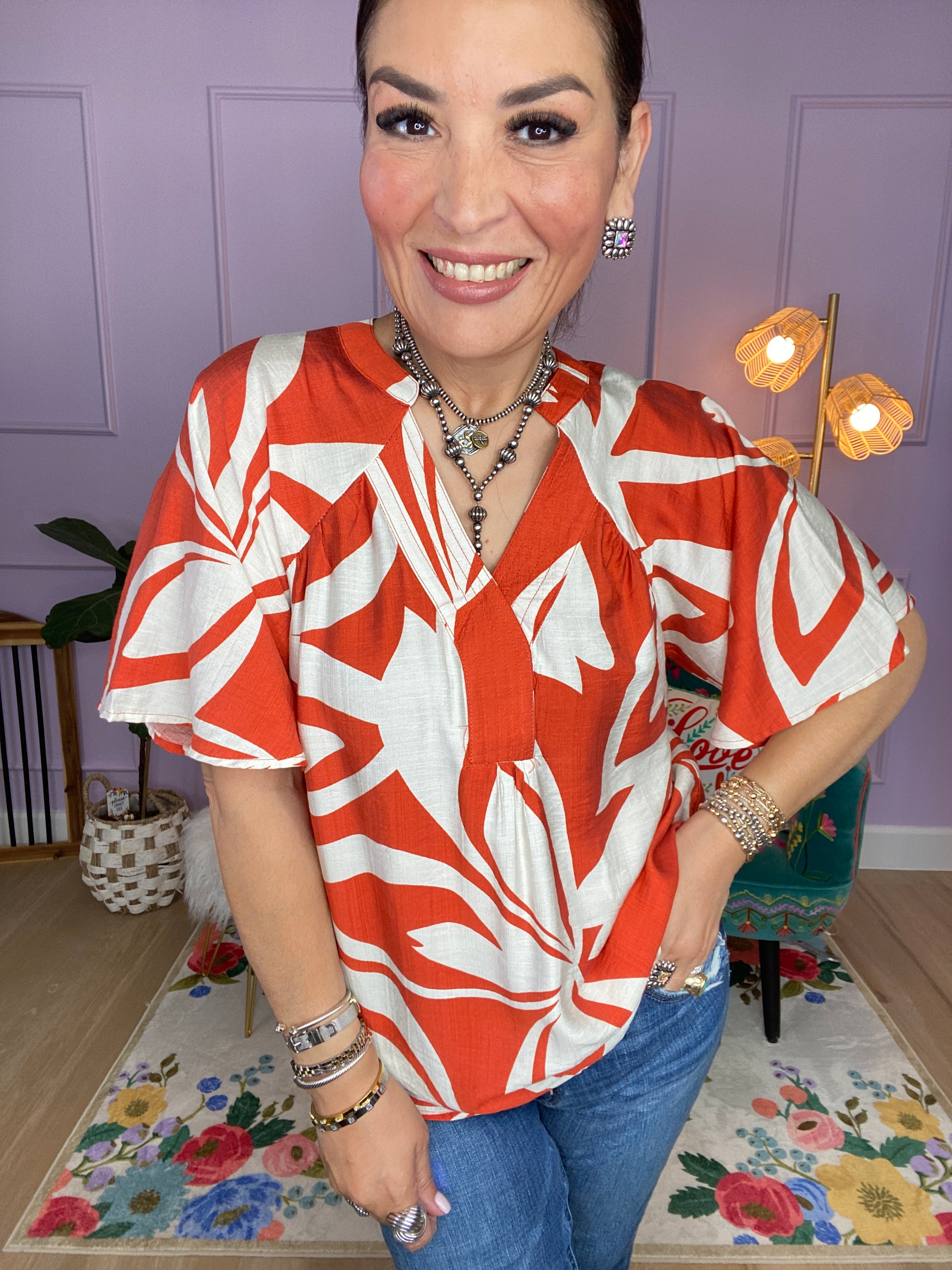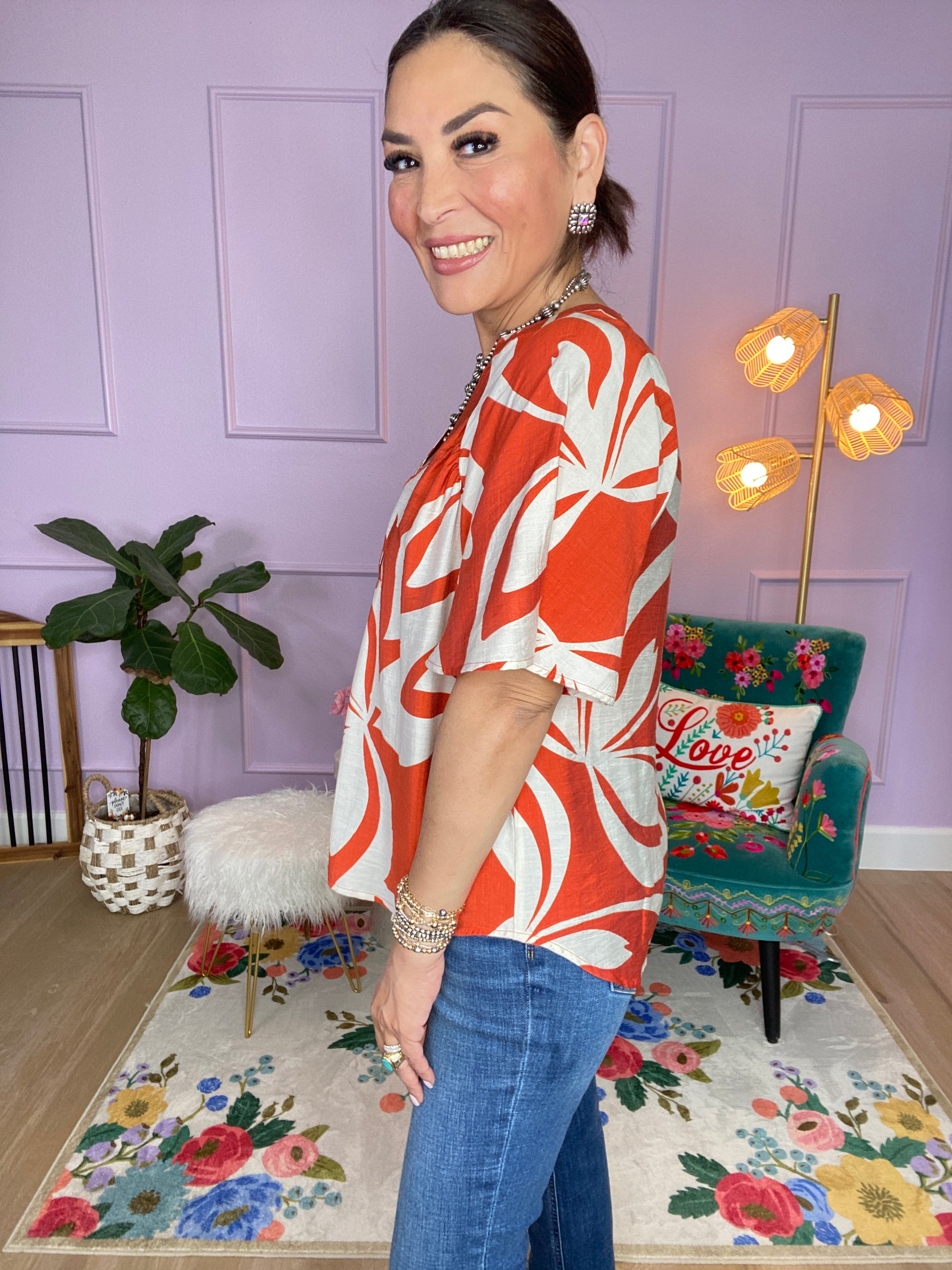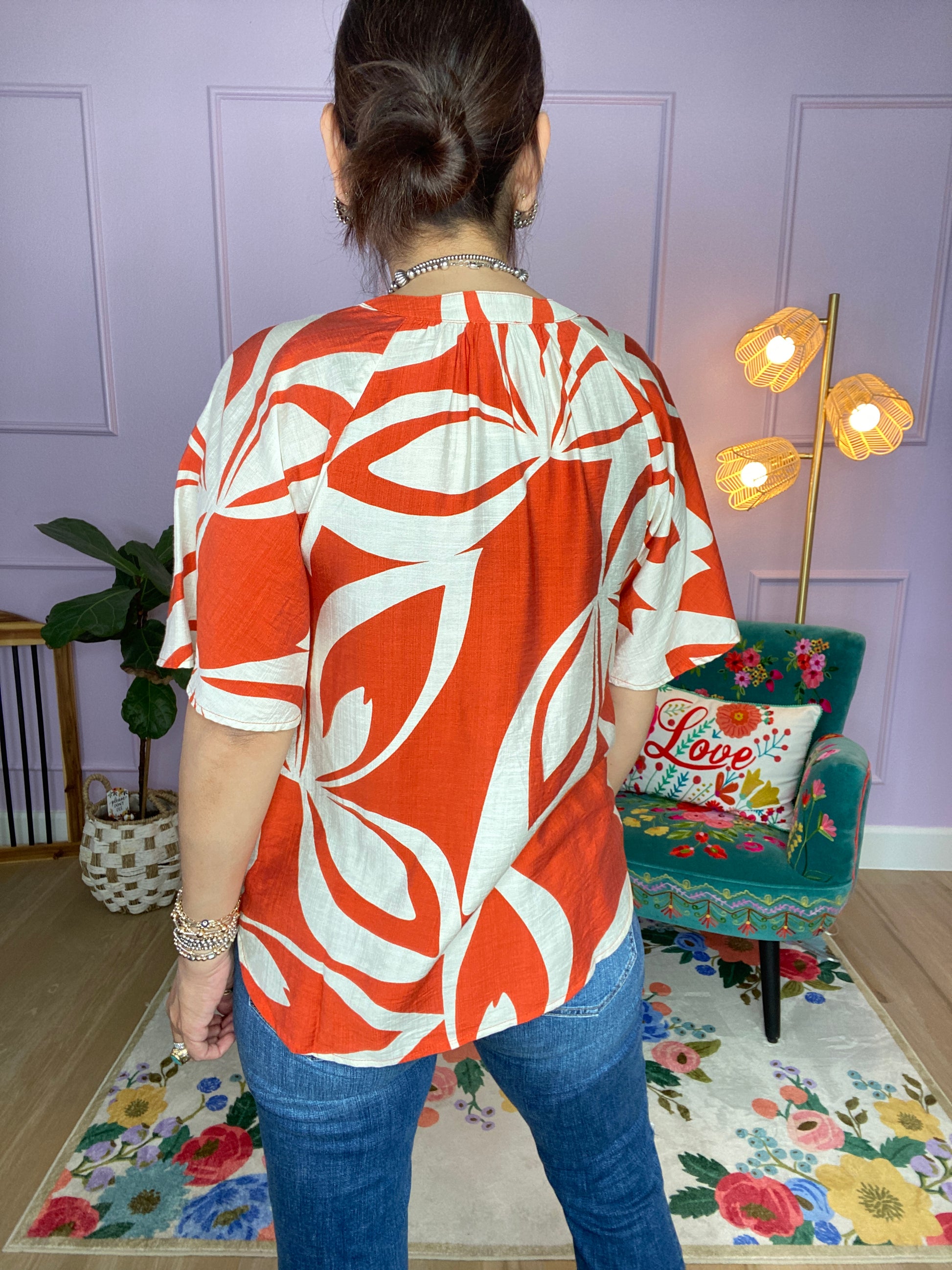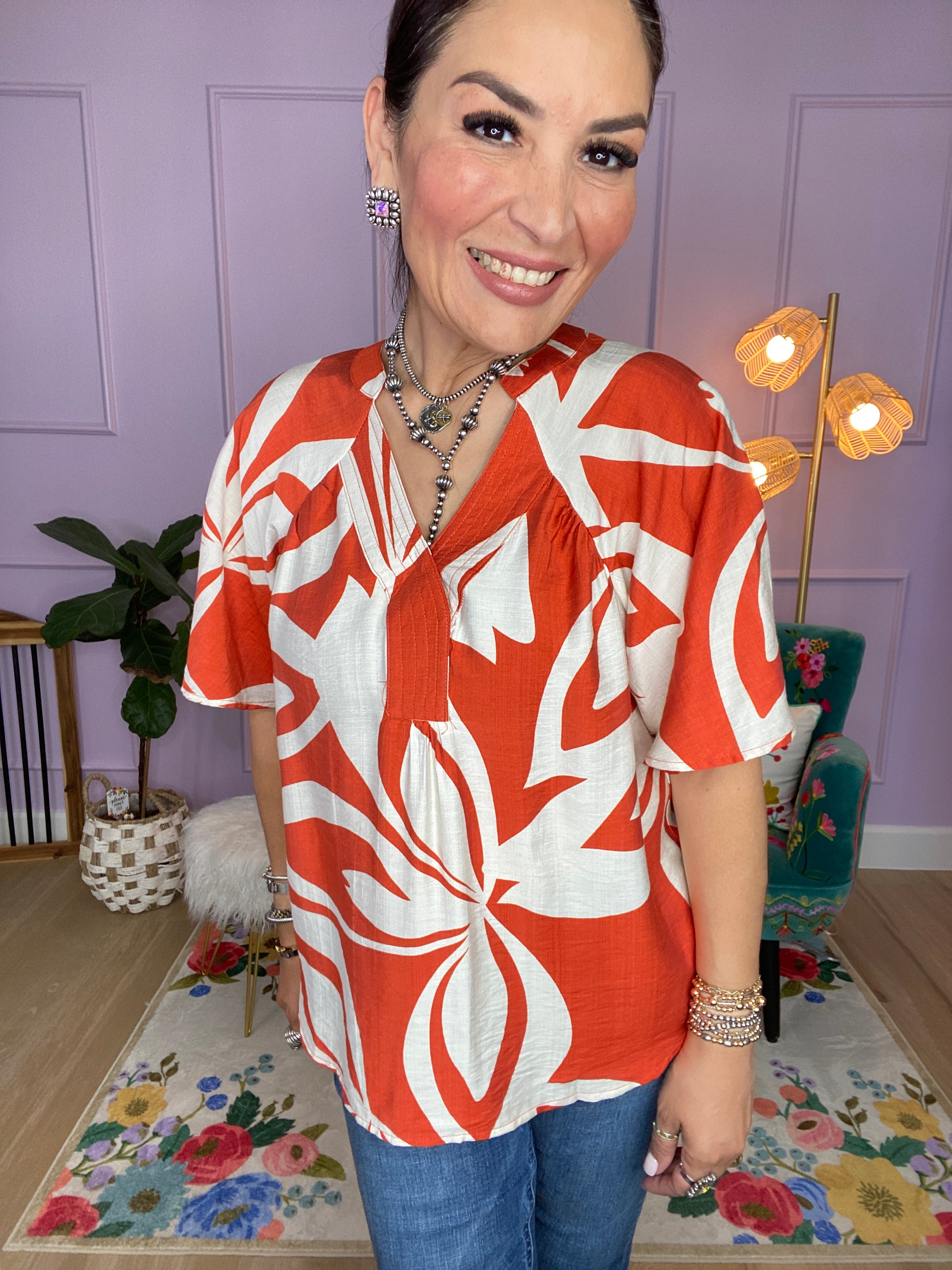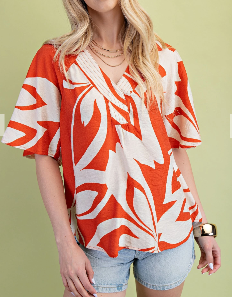 Leaf Print V-Neck Top with a Snap Closure and Trapunto Stitching