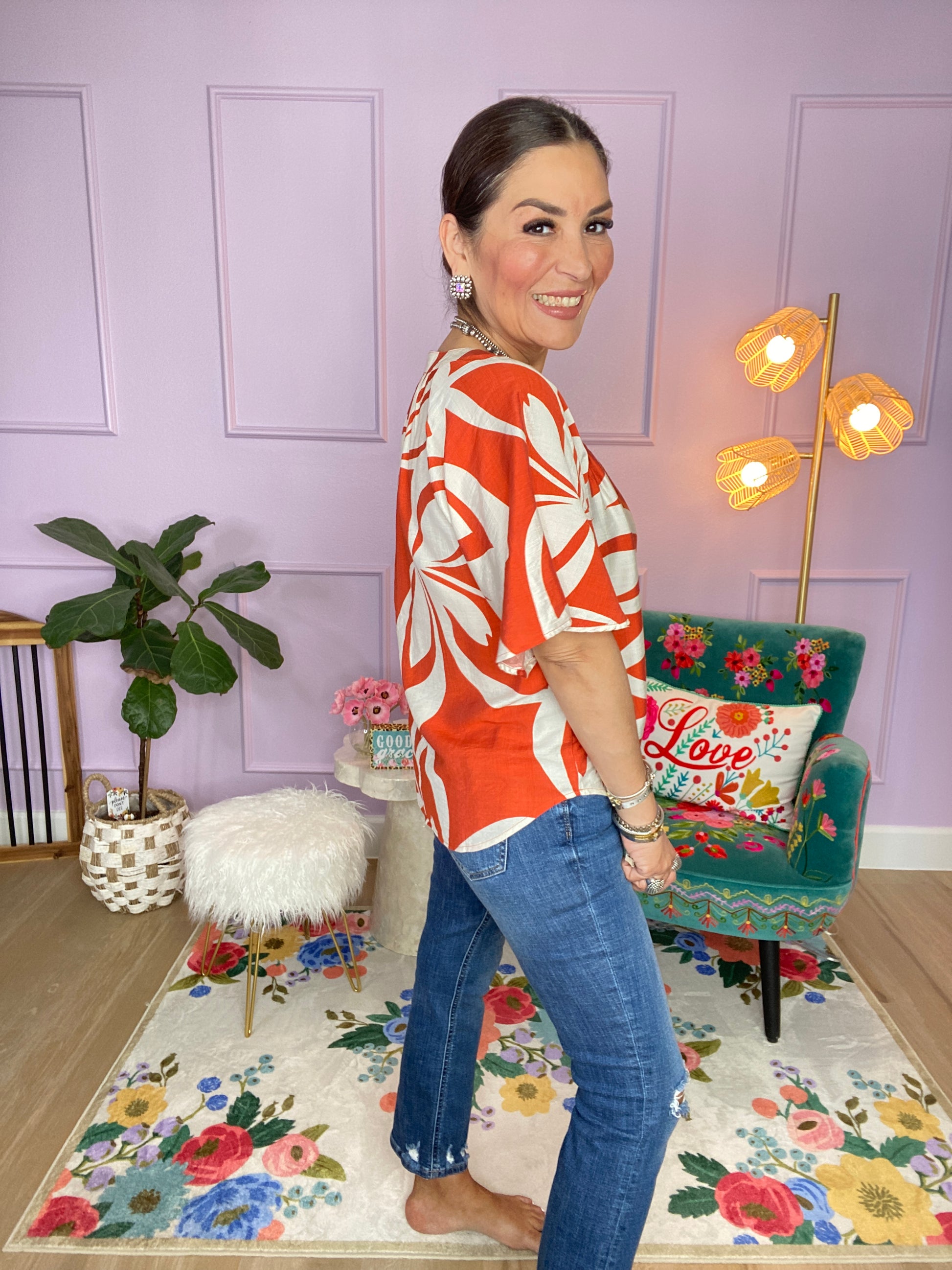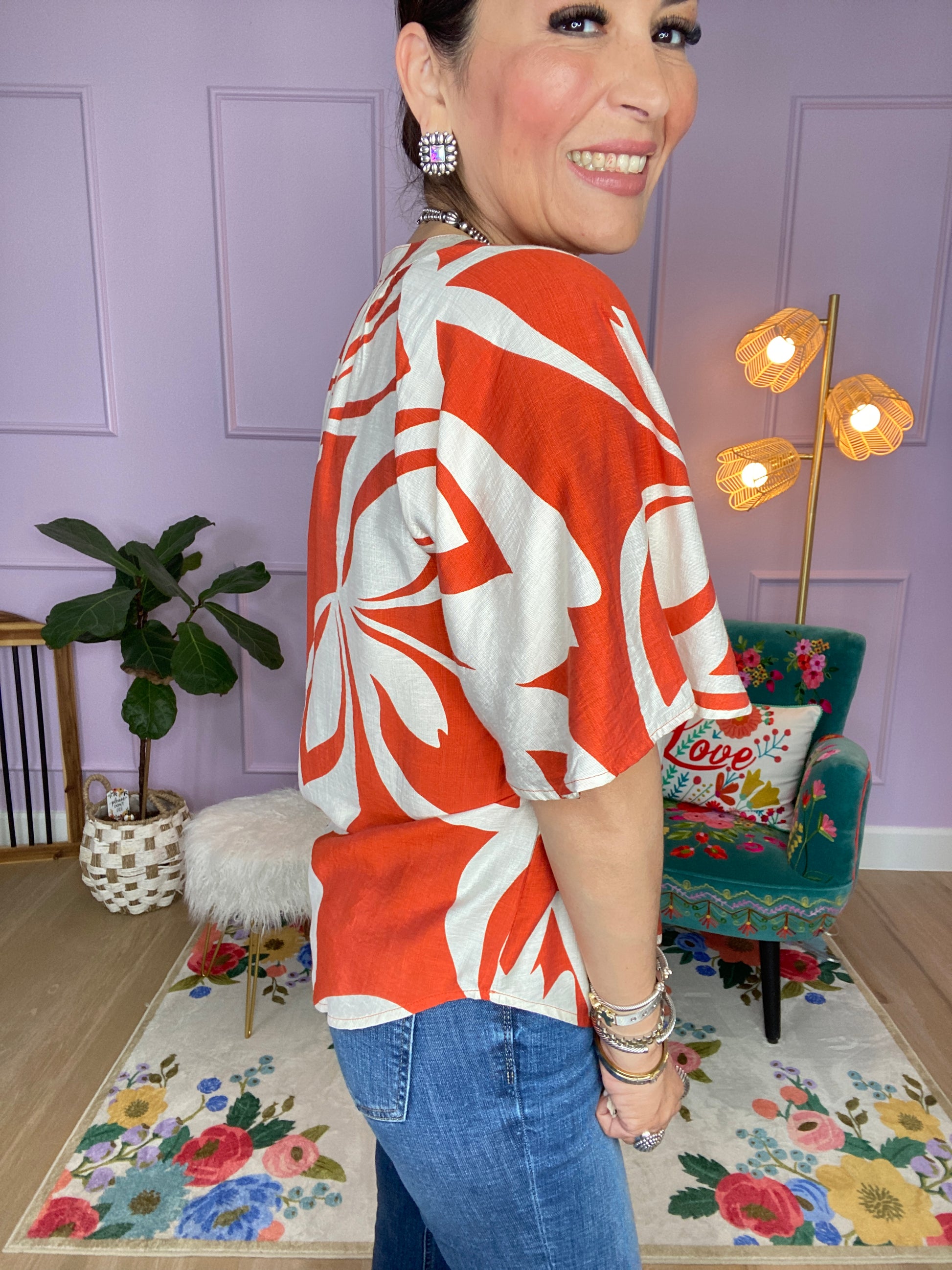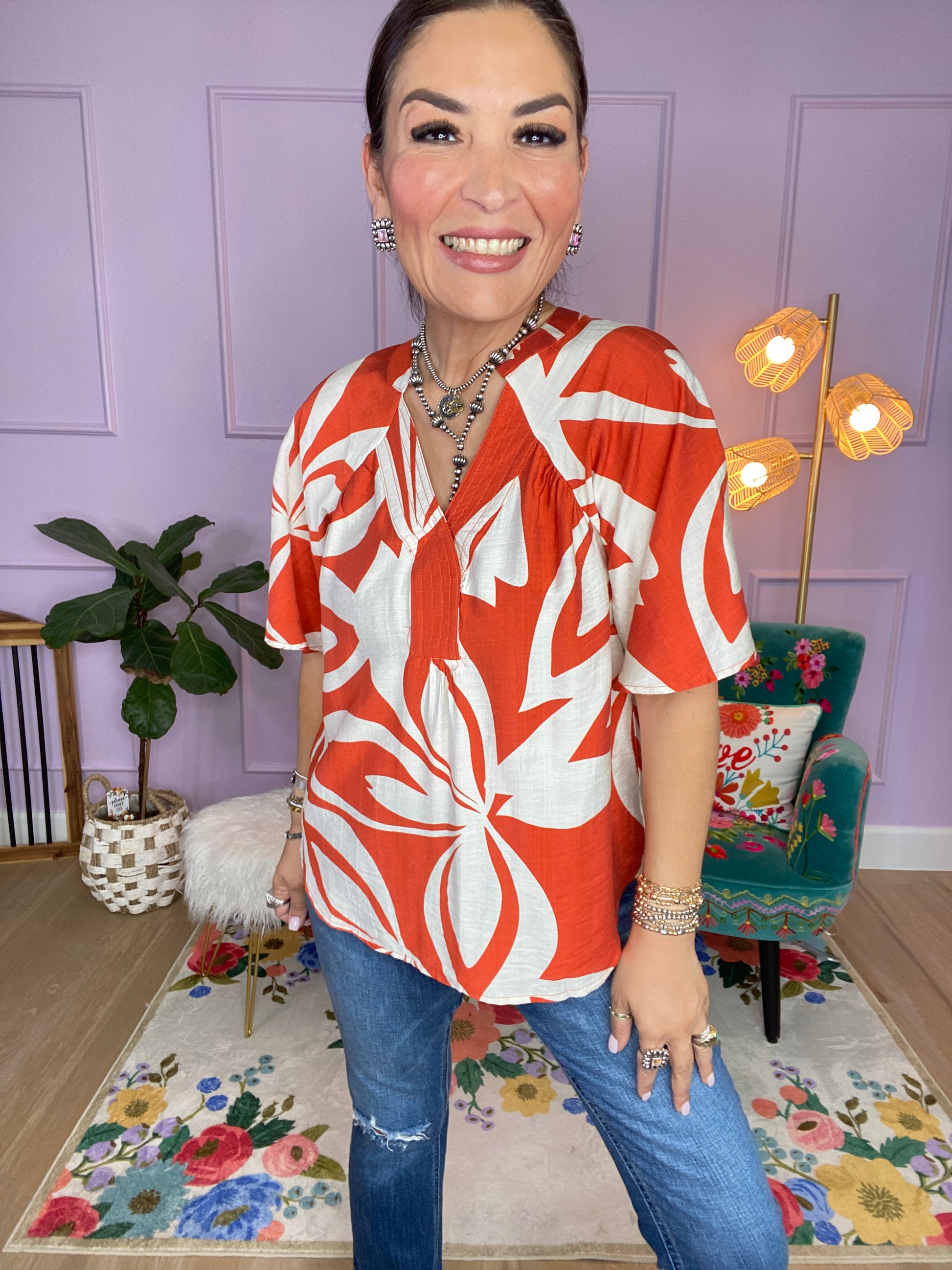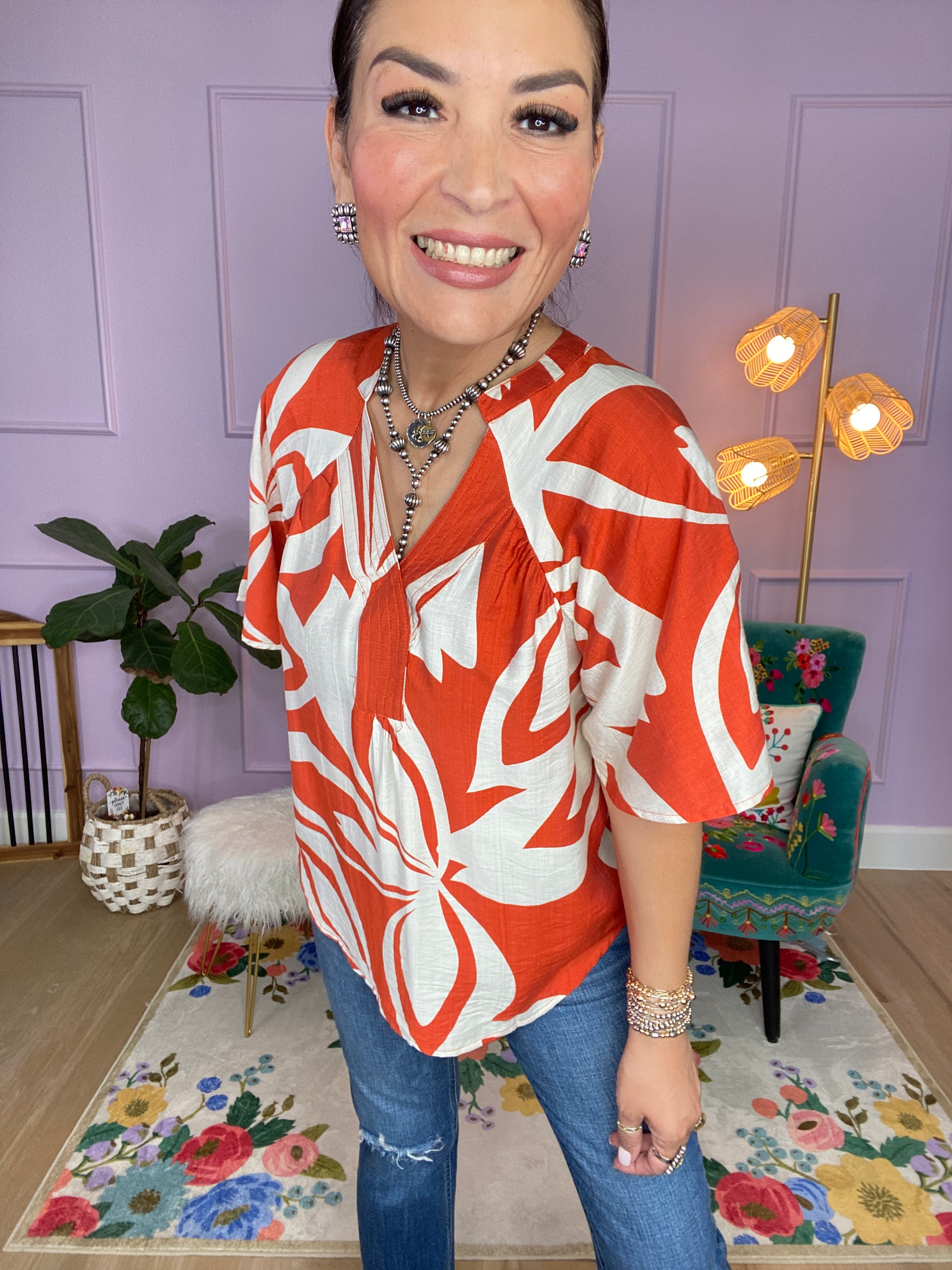 Leaf Print V-Neck Top with a Snap Closure and Trapunto Stitching