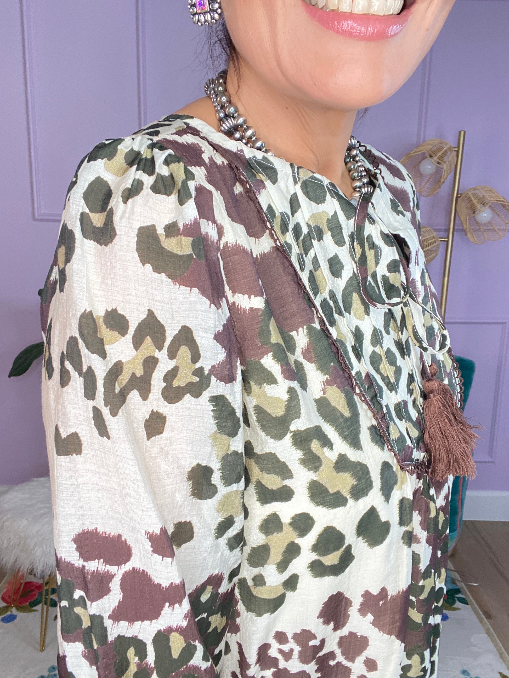 Leopard Print Long Sleeve Dress with Pintuck Details and a Decorative Trim. The Dress is Lined