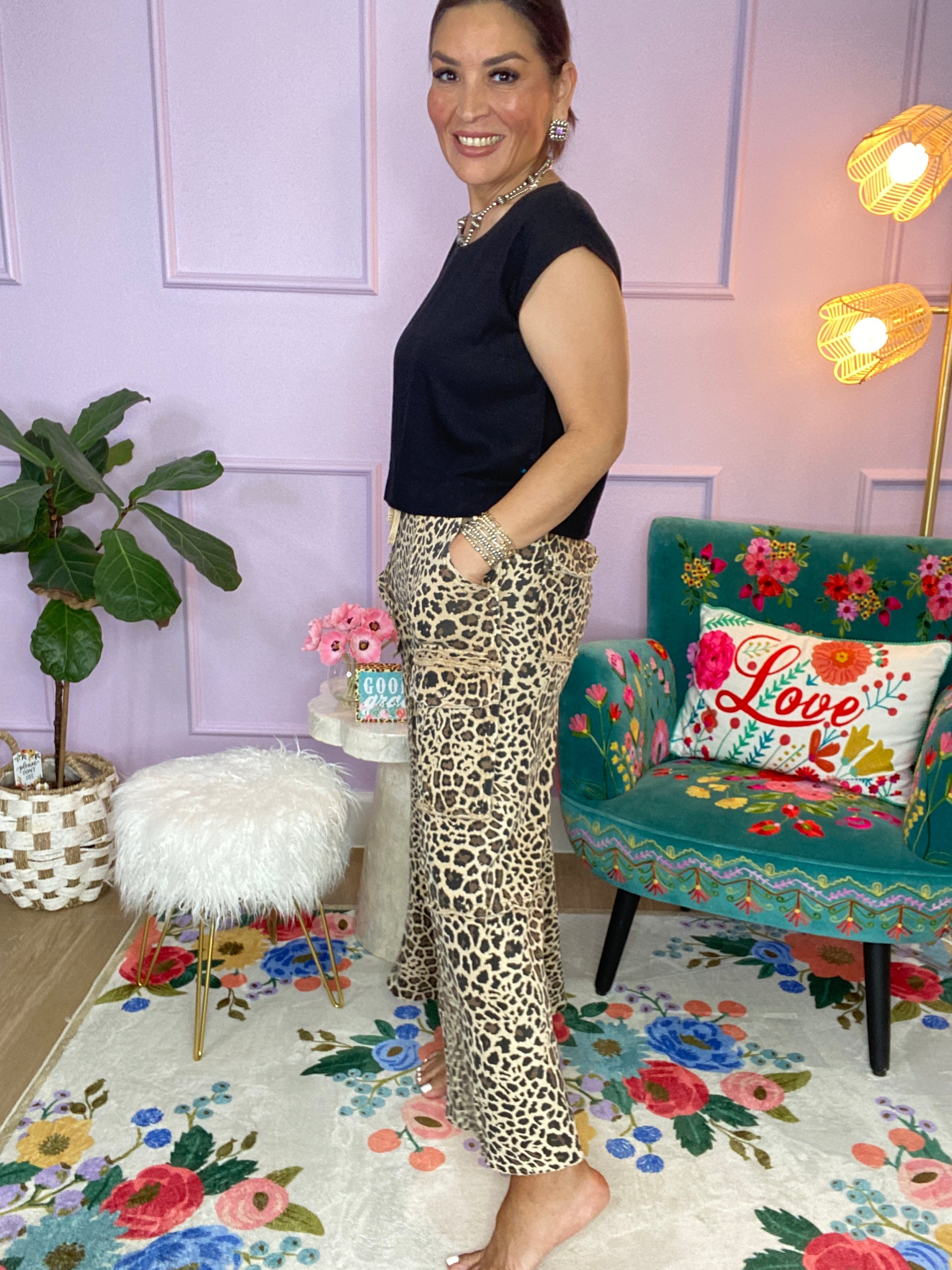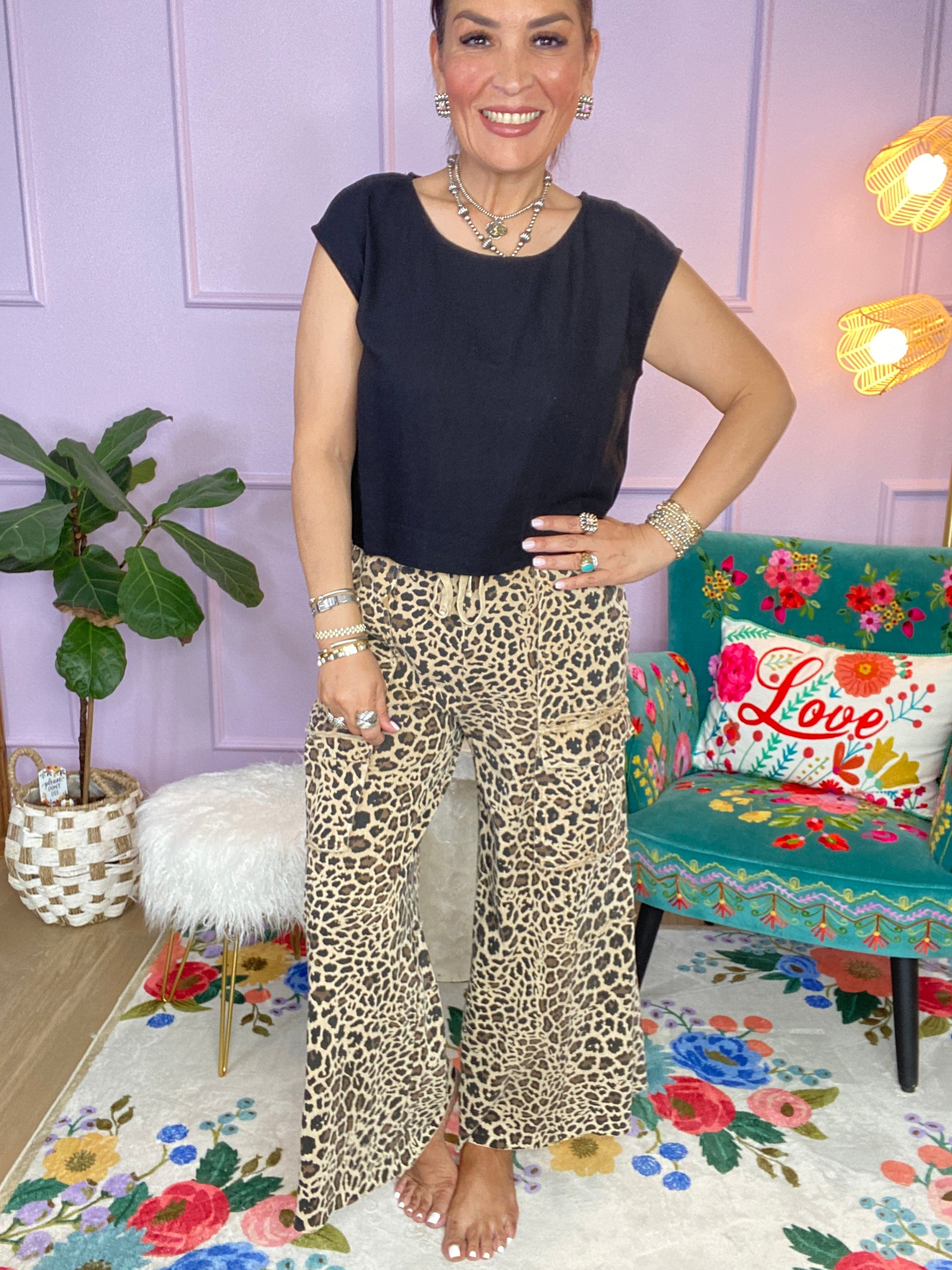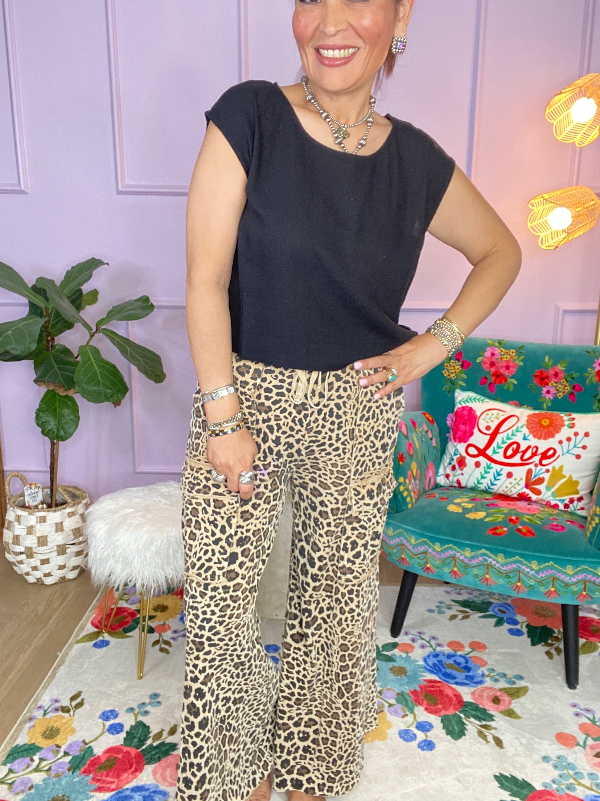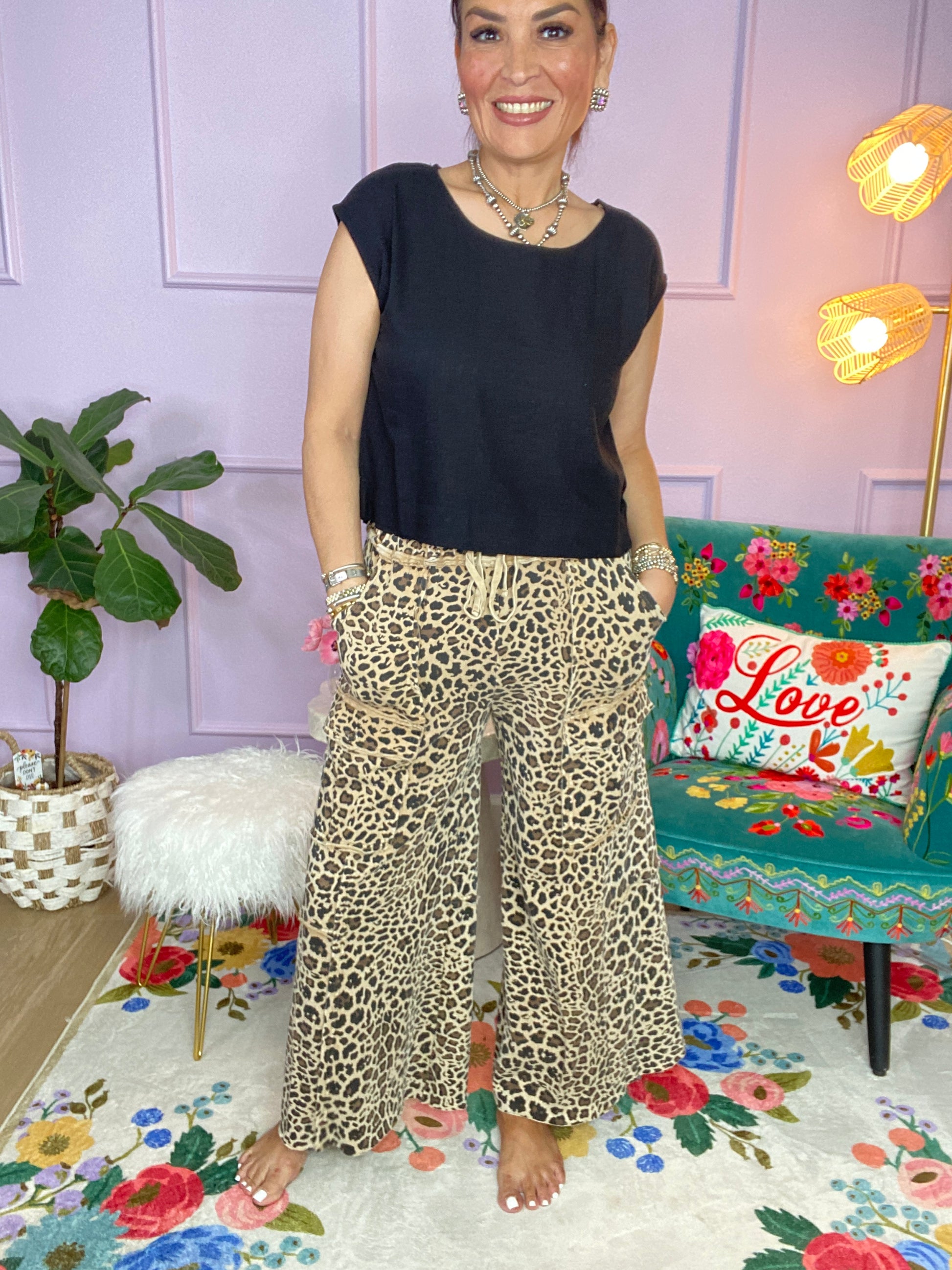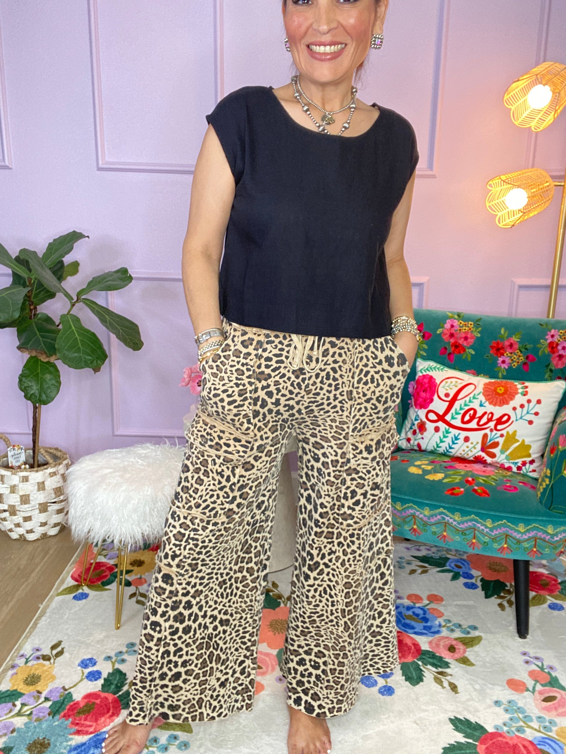 ANIMAL PRINTED TERRY KNIT MINERAL WASHED CARGO PANTS