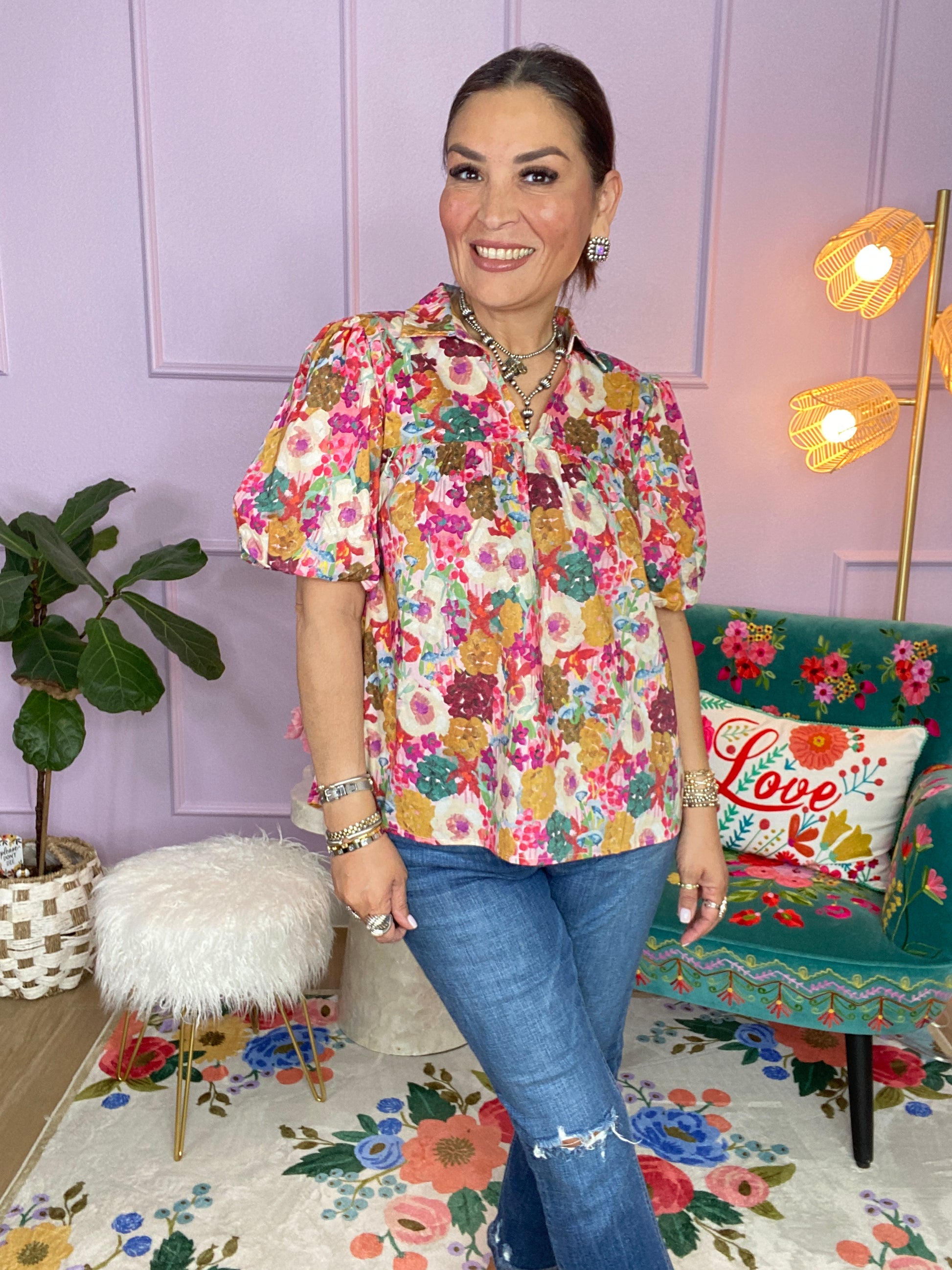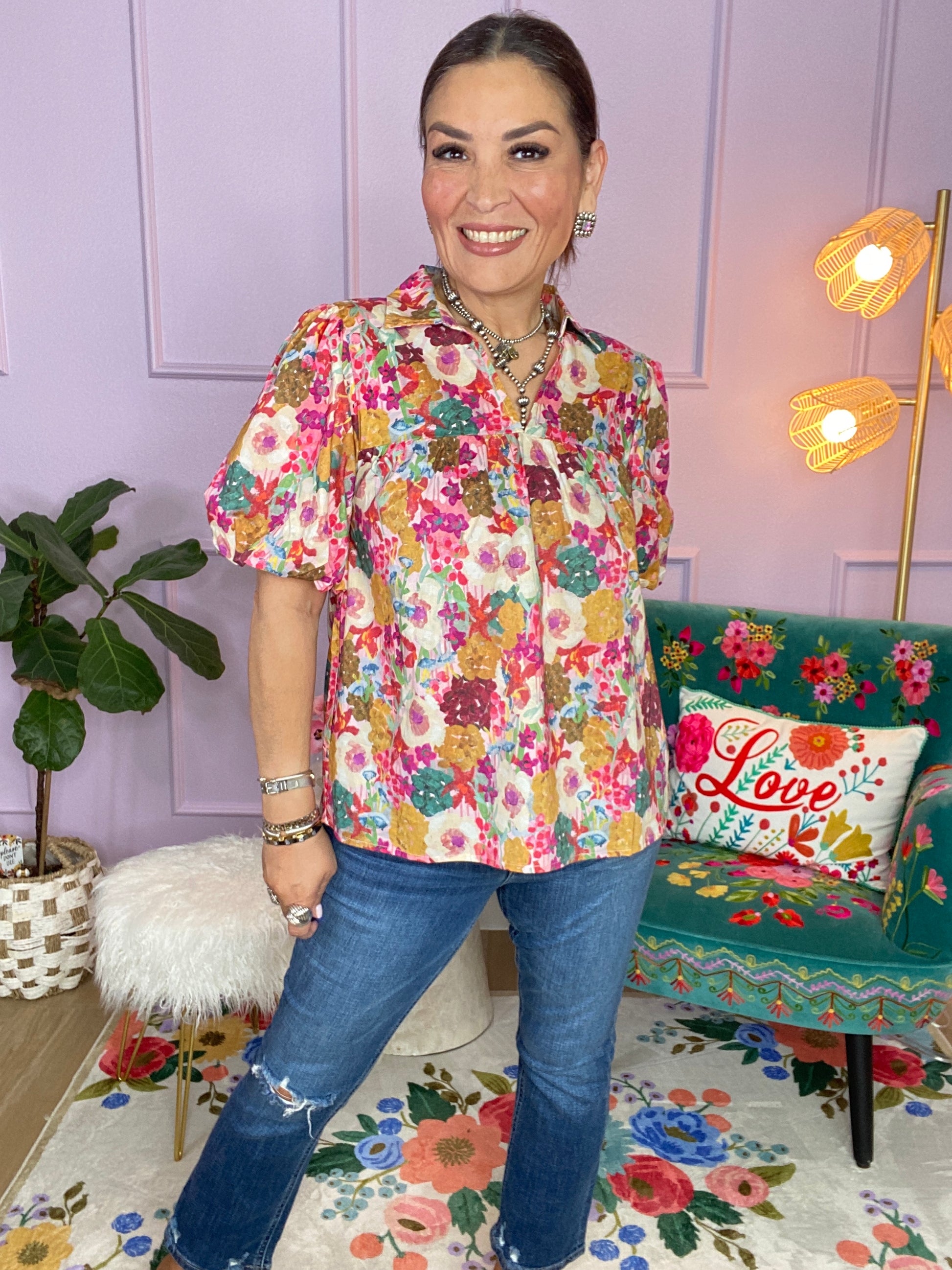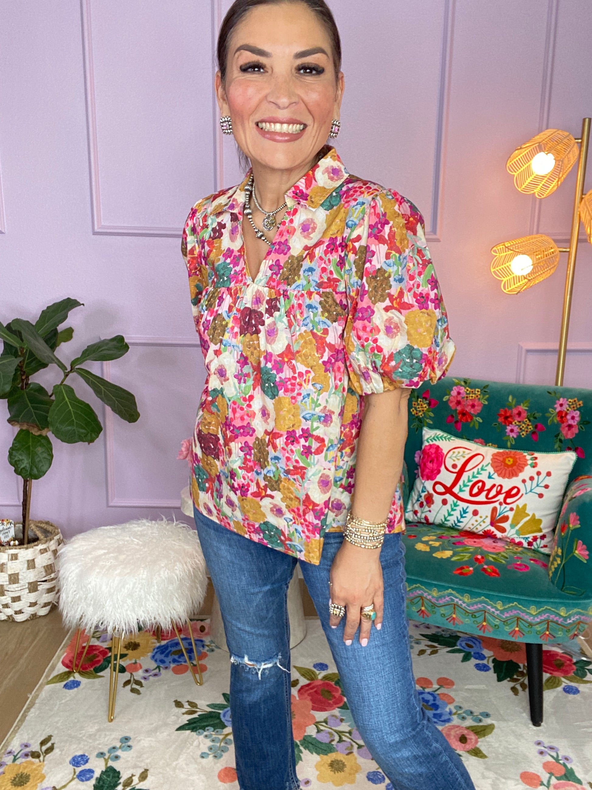 Floral print top with open collared neck, wrinkle yoke, and short puffed sleeves.