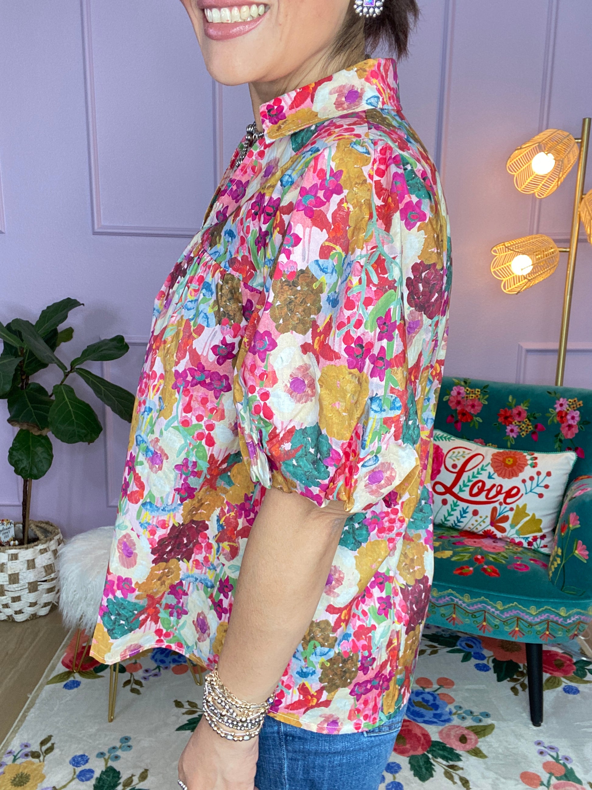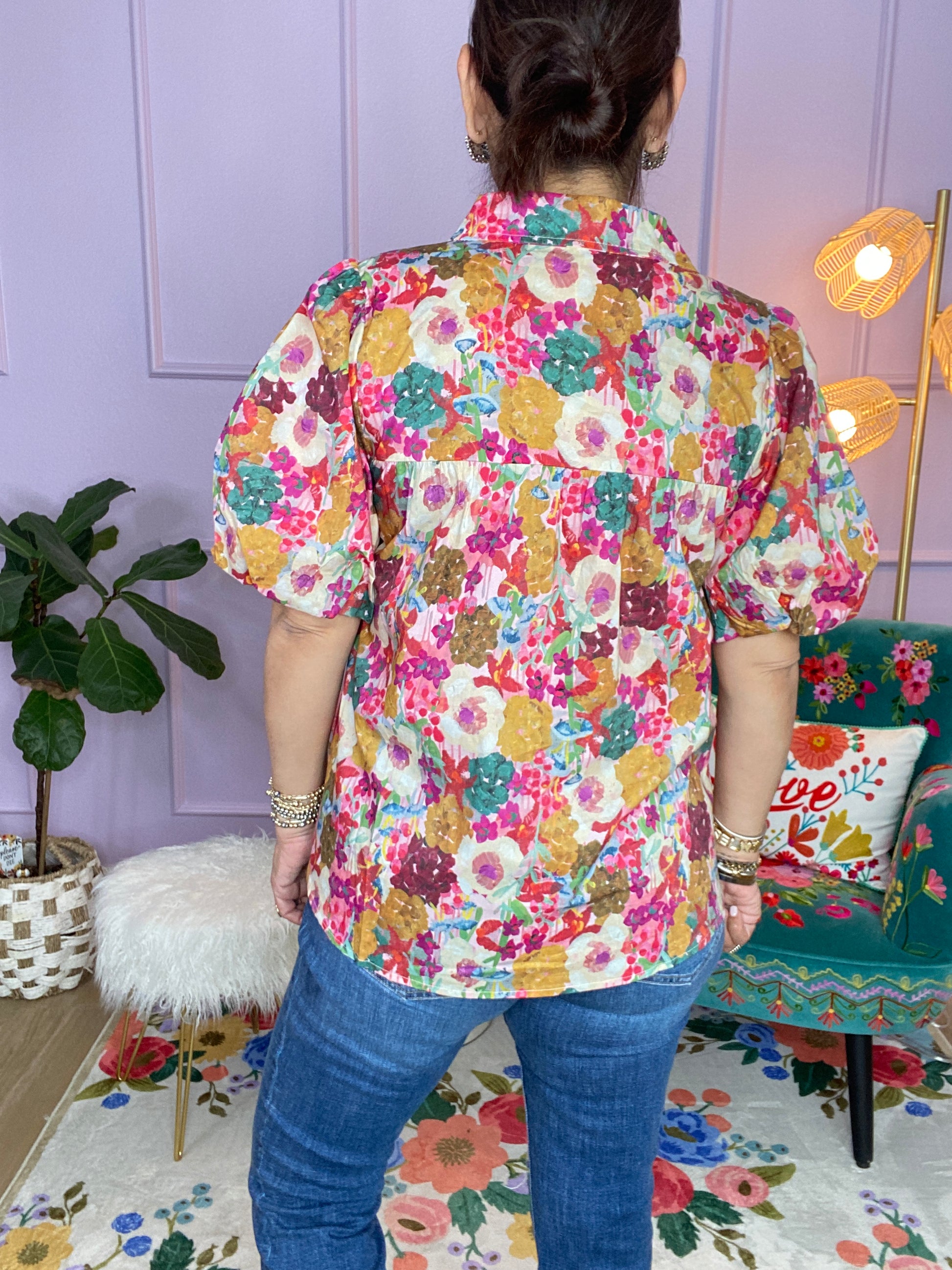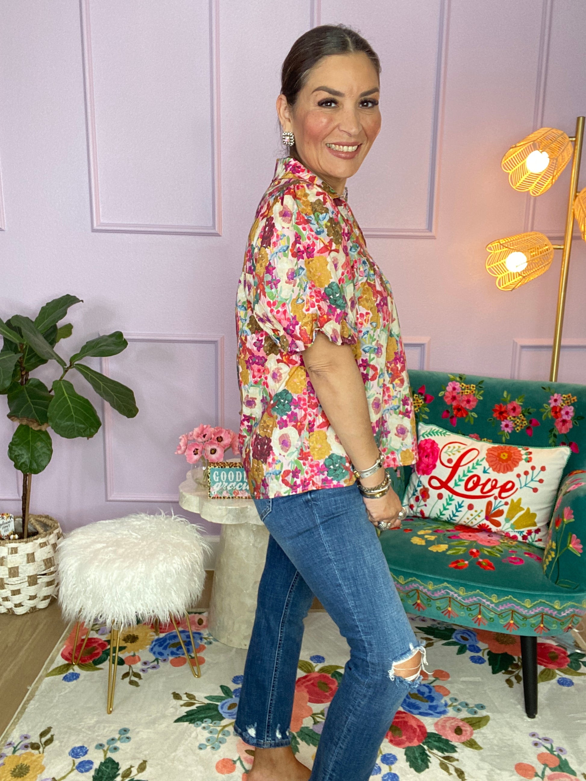Floral print top with open collared neck, wrinkle yoke, and short puffed sleeves.