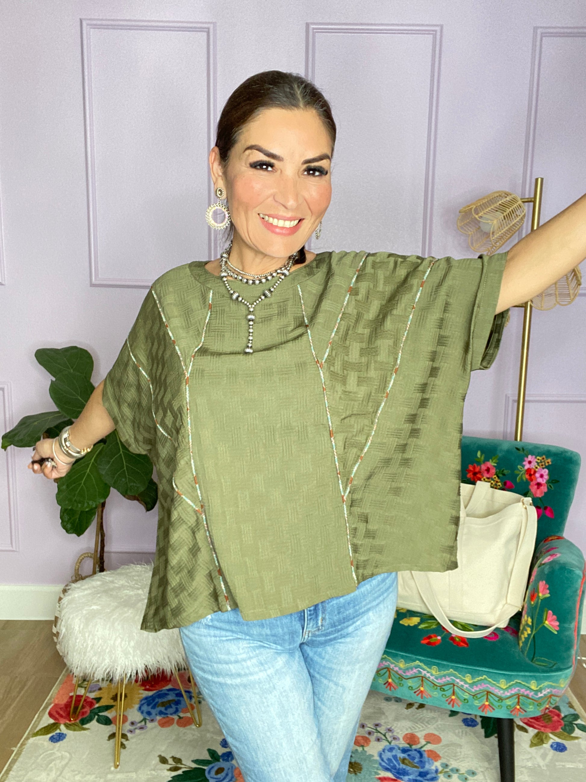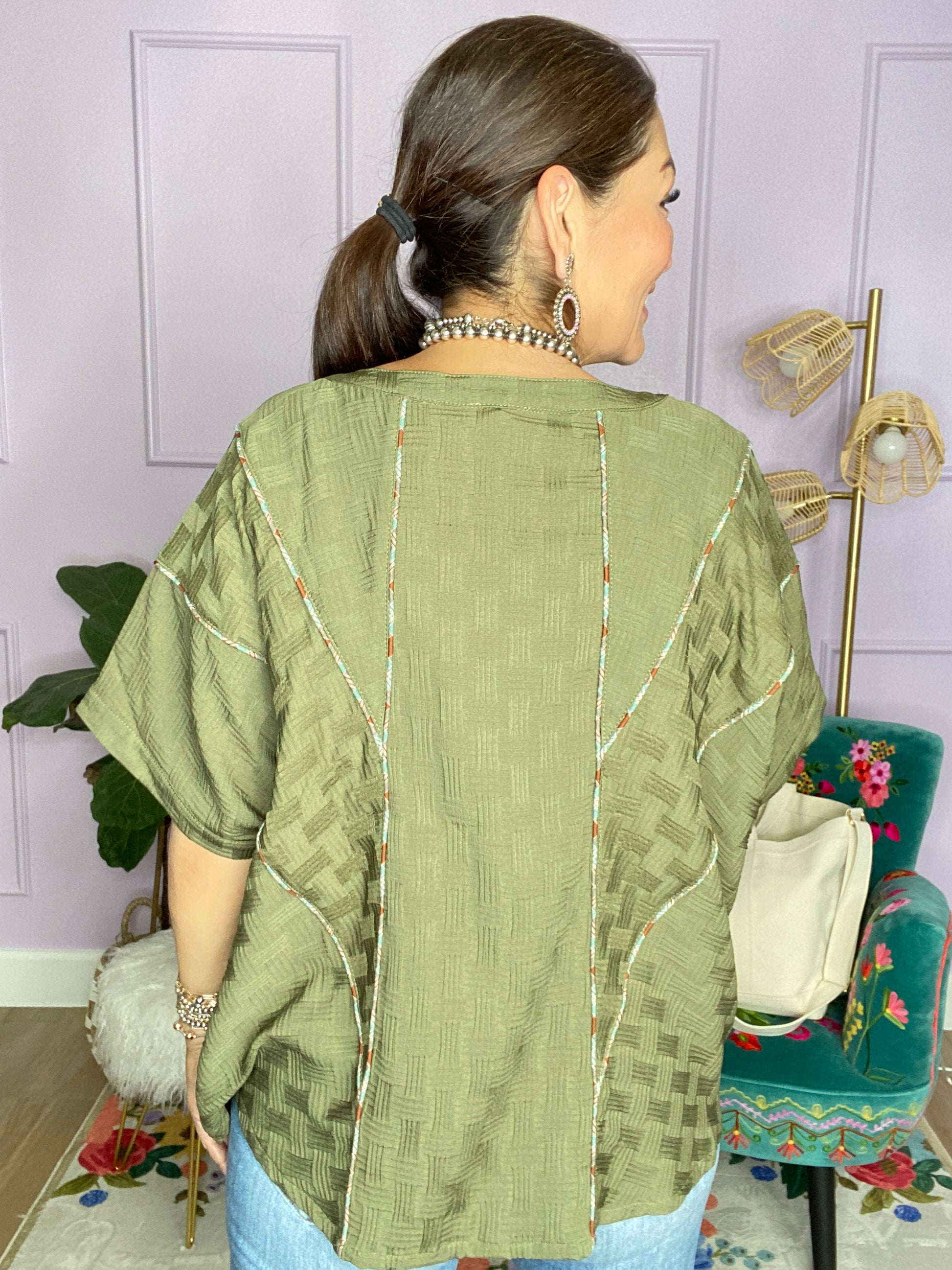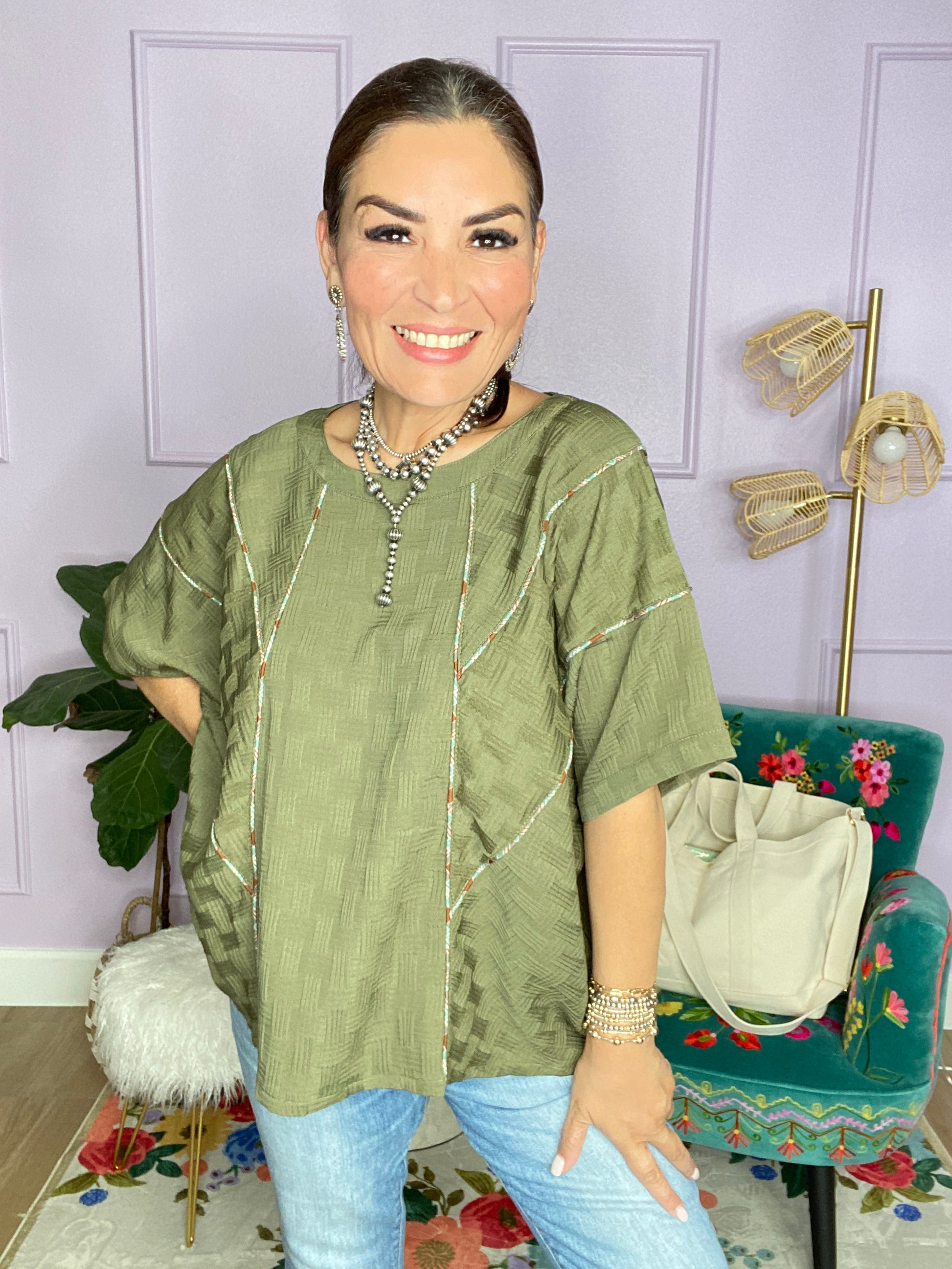 This isn't your basic tee — it’s a statement in subtle detail! Crafted with a soft, woven textured fabric and styled with a relaxed, loose fit, this olive green top features unique contrasting plaid binding that adds dimension and charm. The angled seam lines bring a flattering shape while keeping the look effortless.