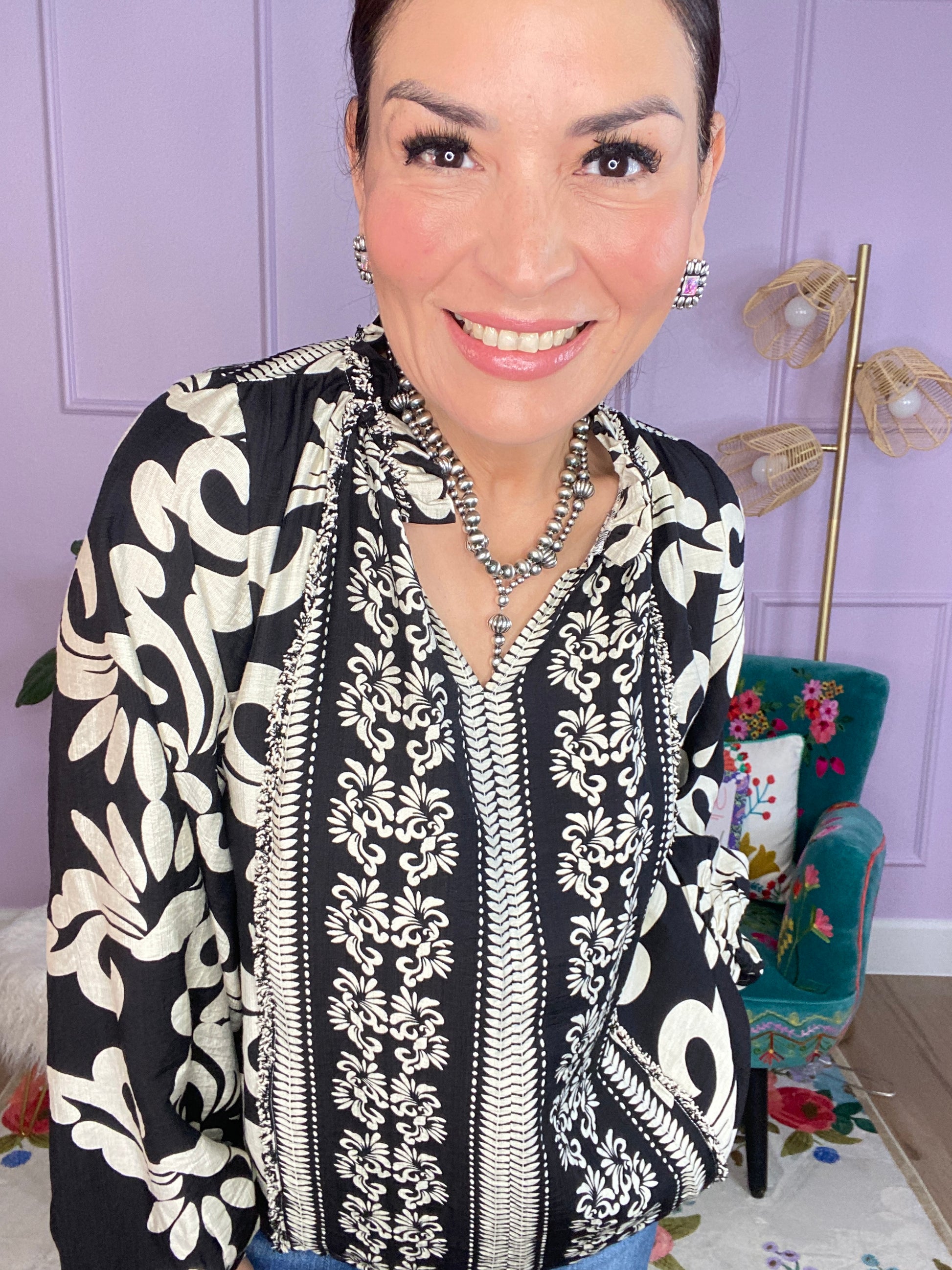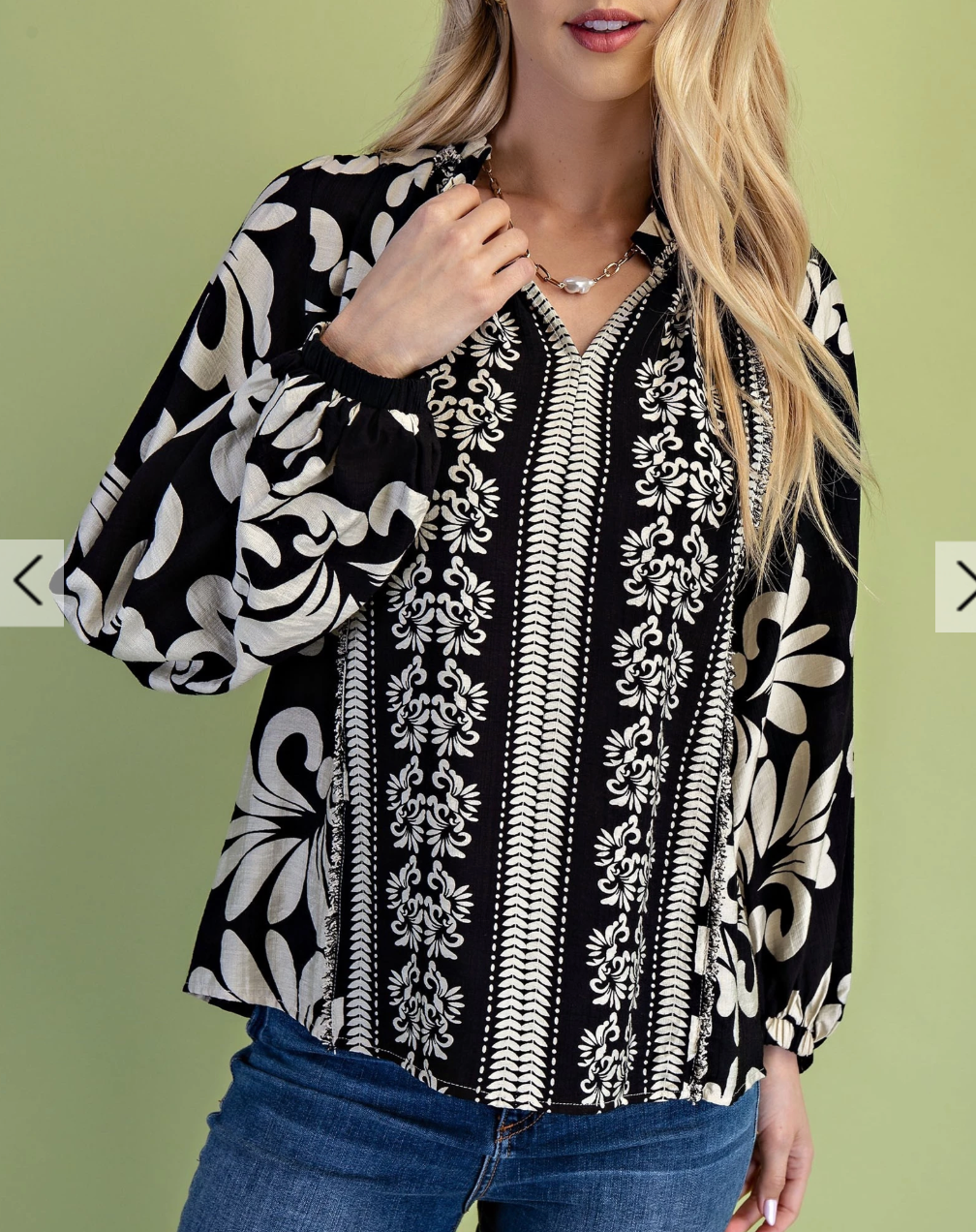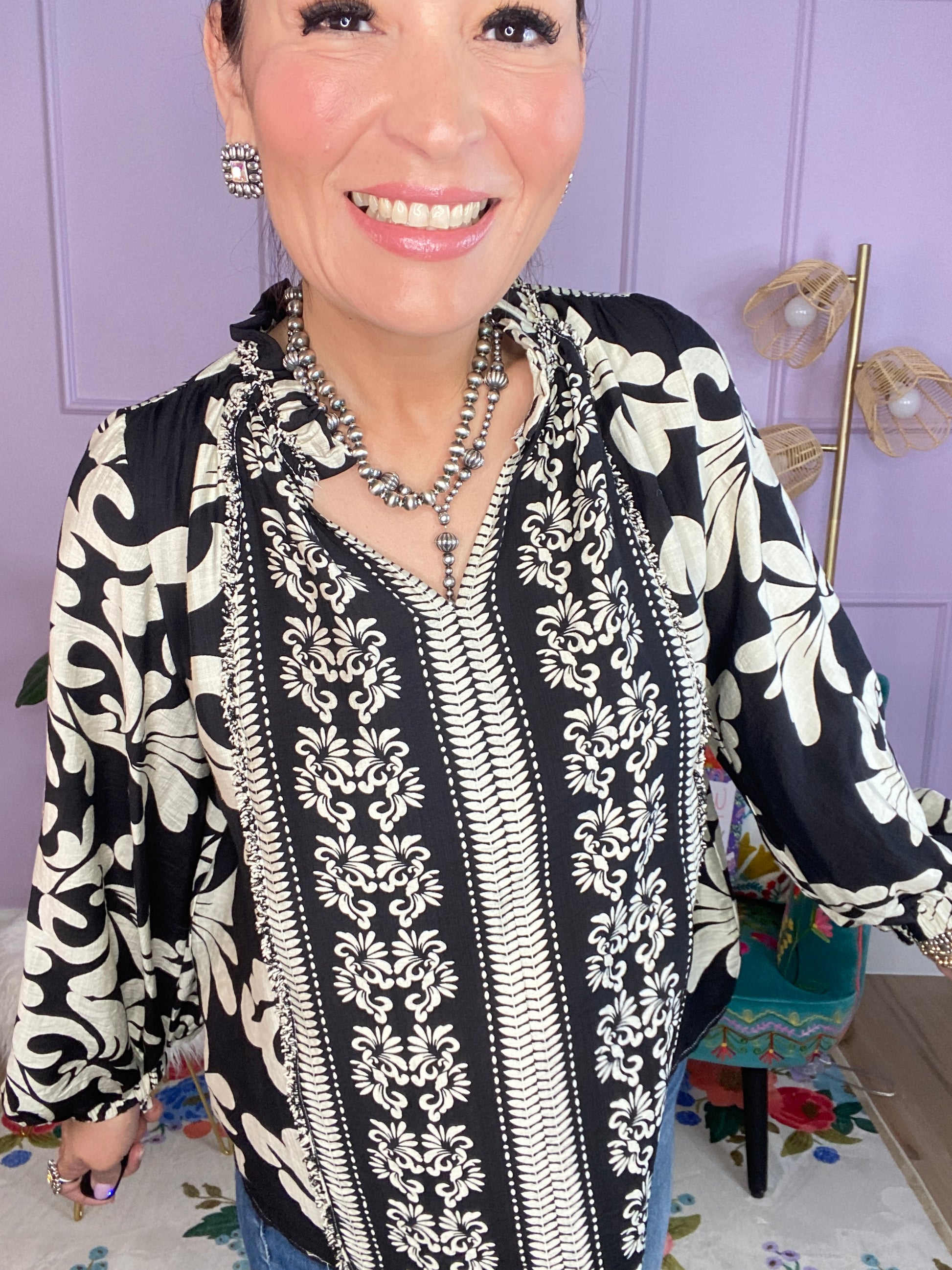 Printed Long Sleeve Blouse with a Ruffled Neck and Frayed Fringe Details