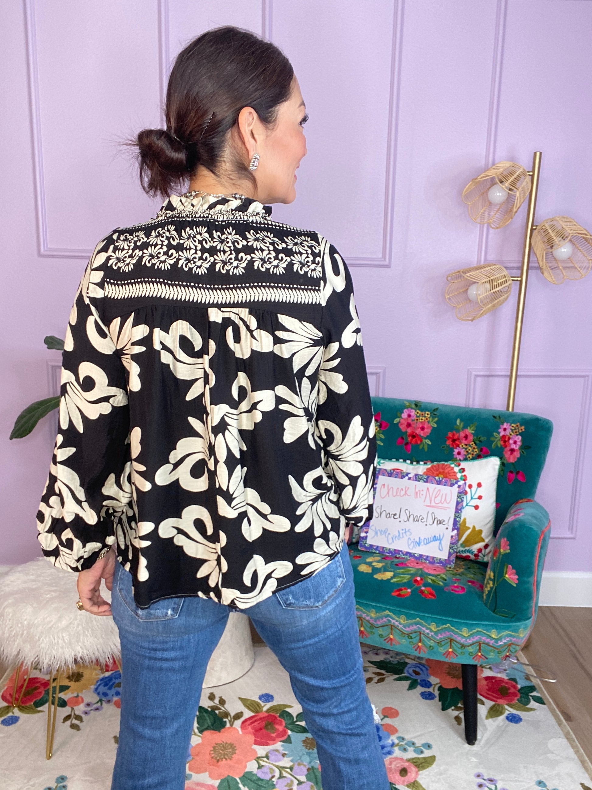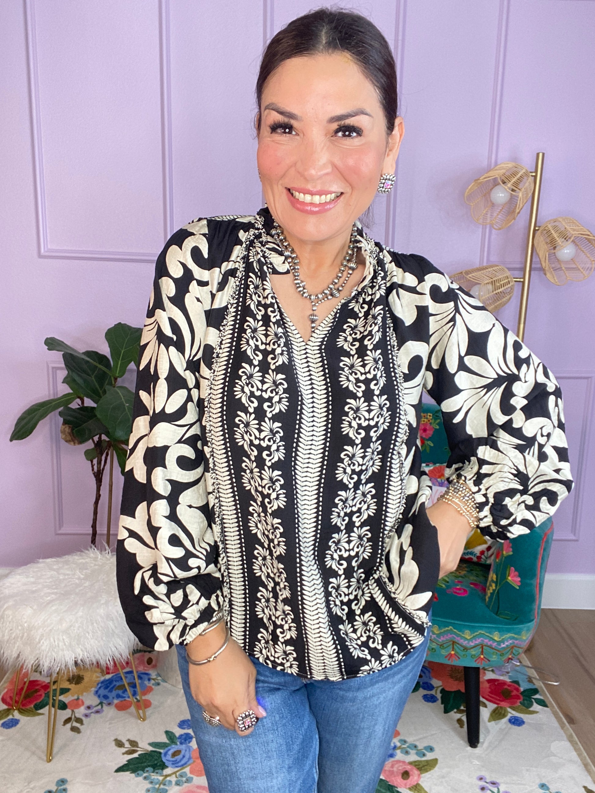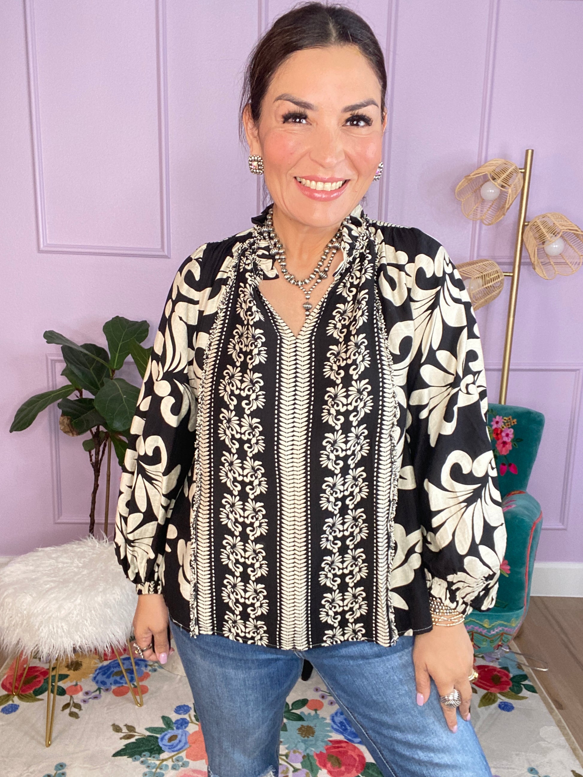Printed Long Sleeve Blouse with a Ruffled Neck and Frayed Fringe Details