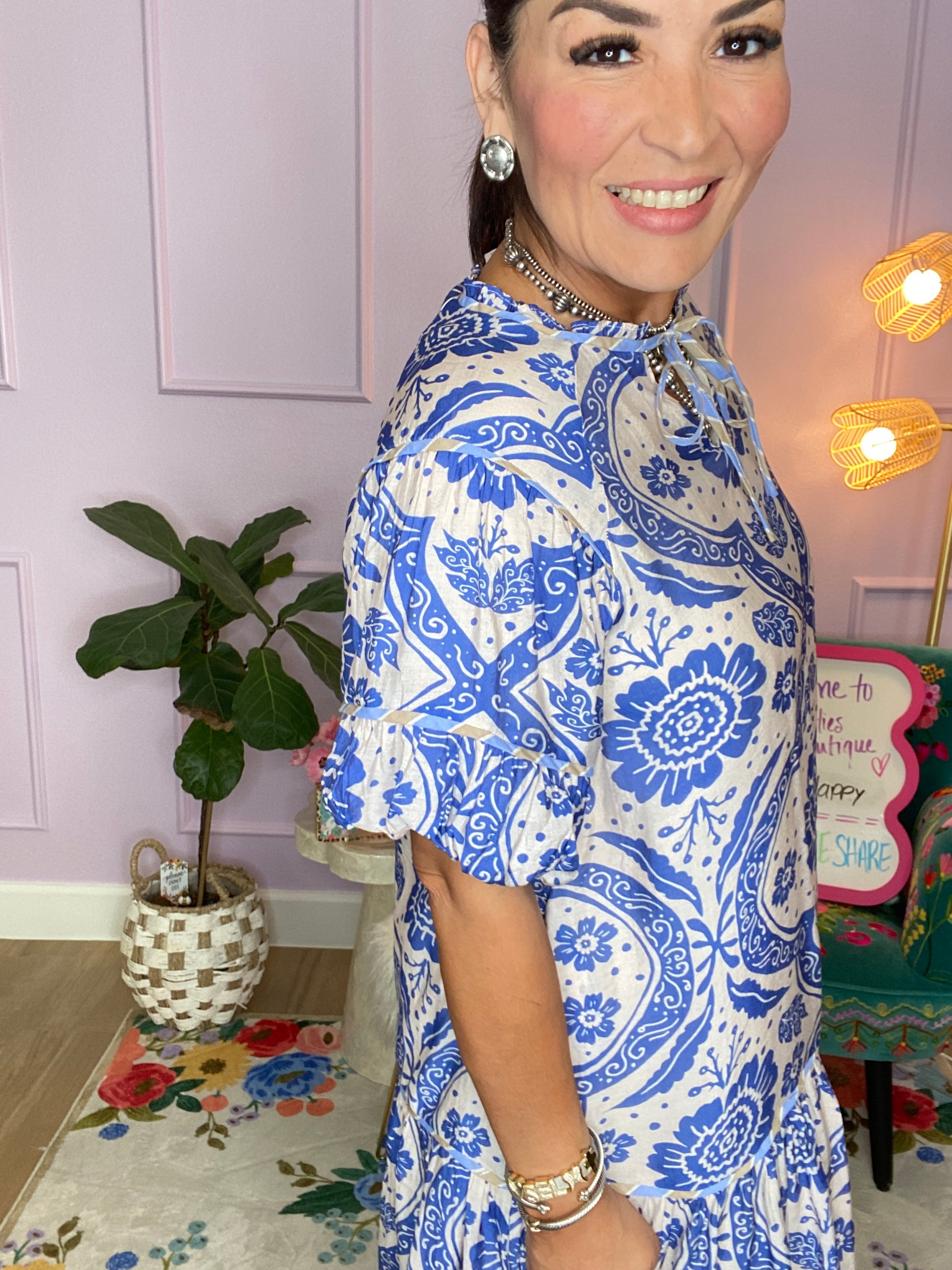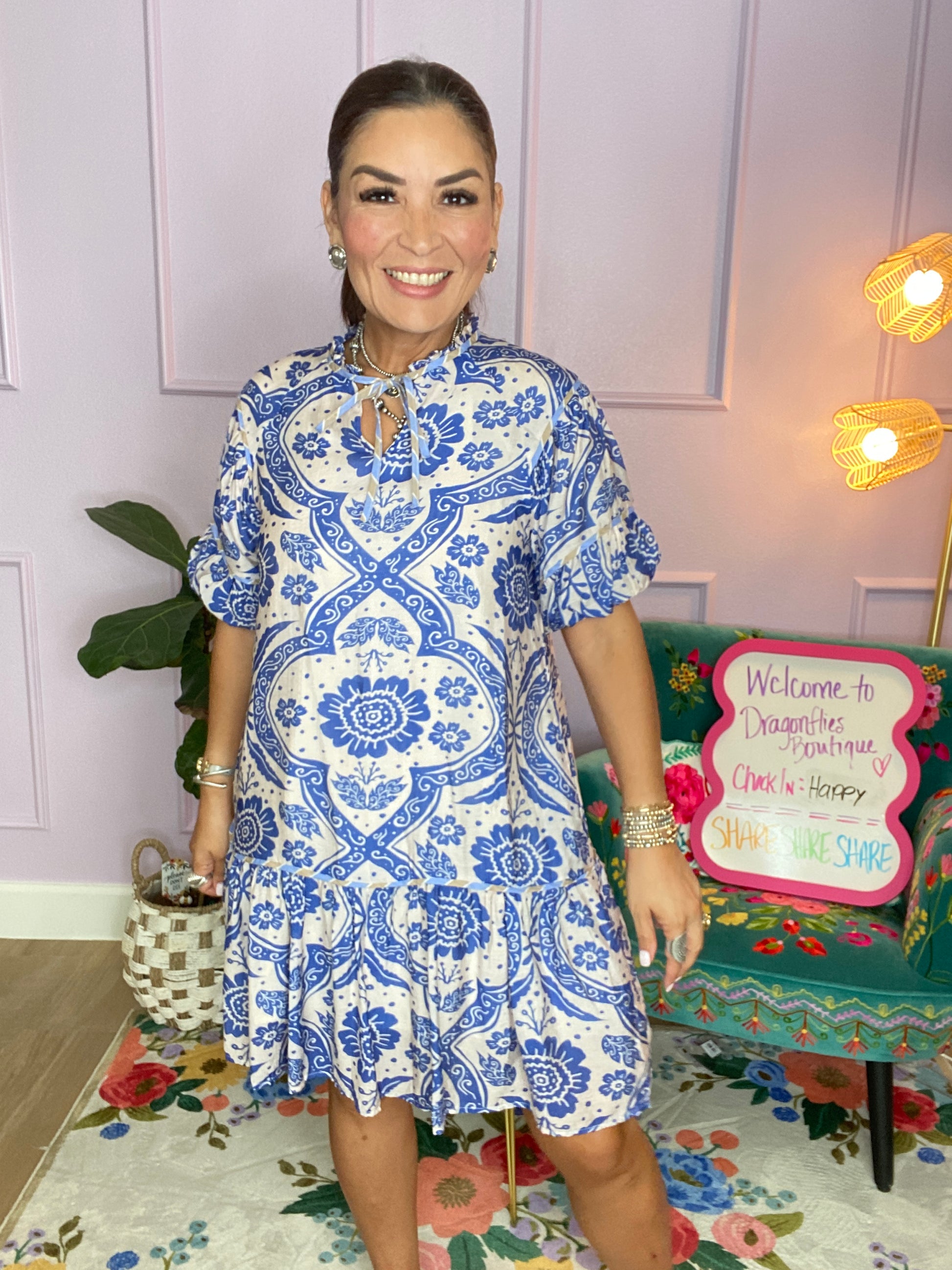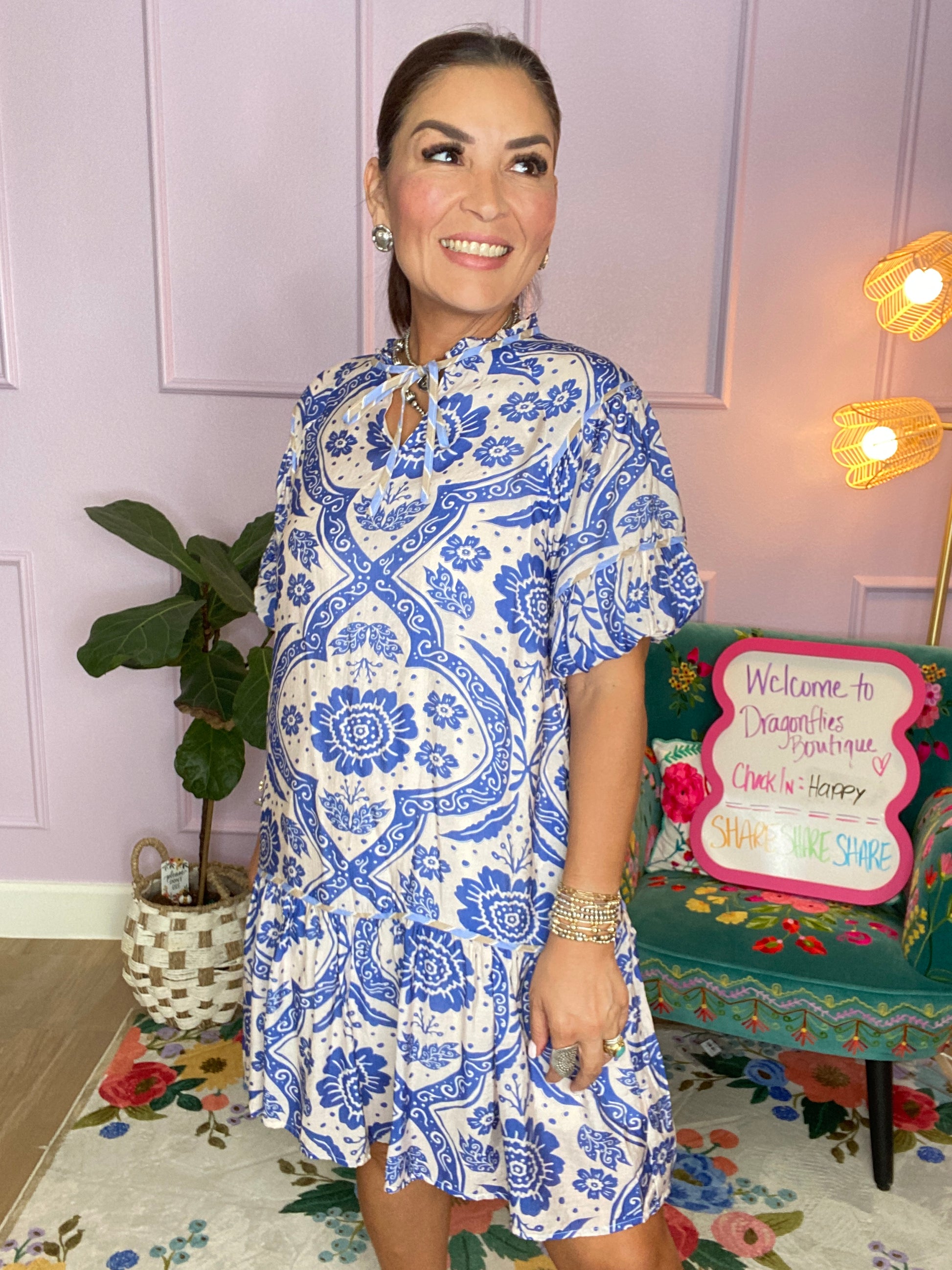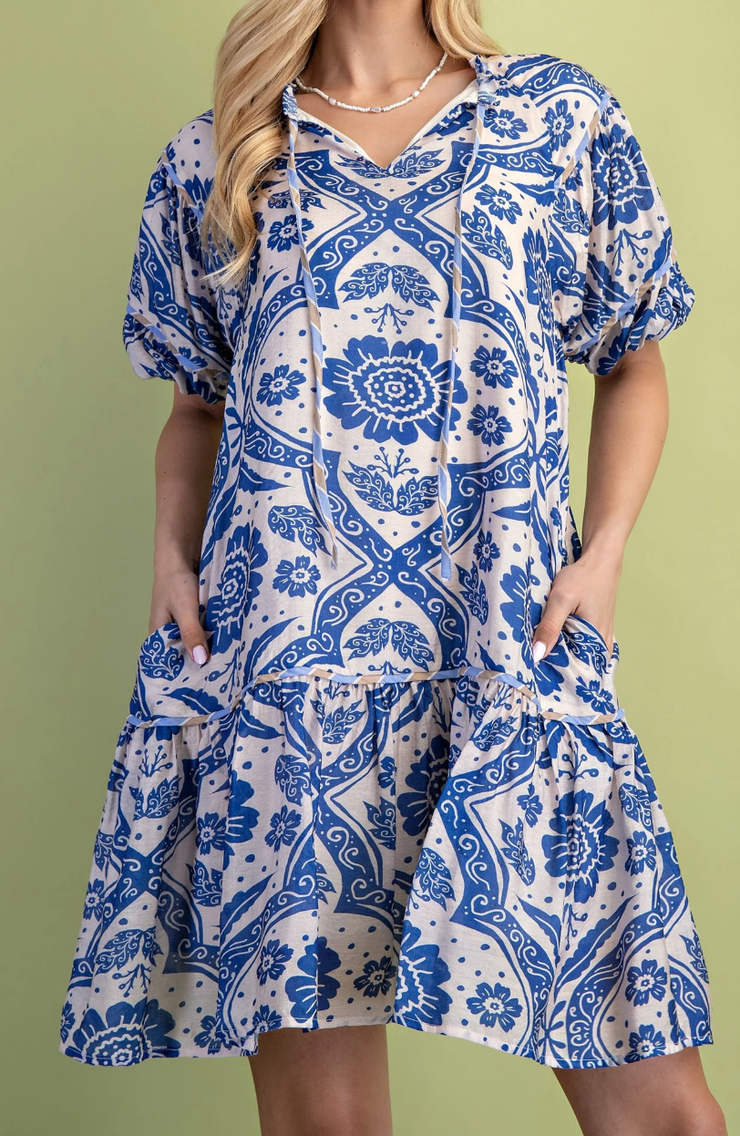 Fresh, flirty, and full of charm — the Bluebell Tile Puff Sleeve Dress is your new go-to for easy days and spontaneous adventures. Featuring a vibrant tile-inspired print in classic cobalt on a soft oatmeal base, this dress brings instant sunshine to any day.