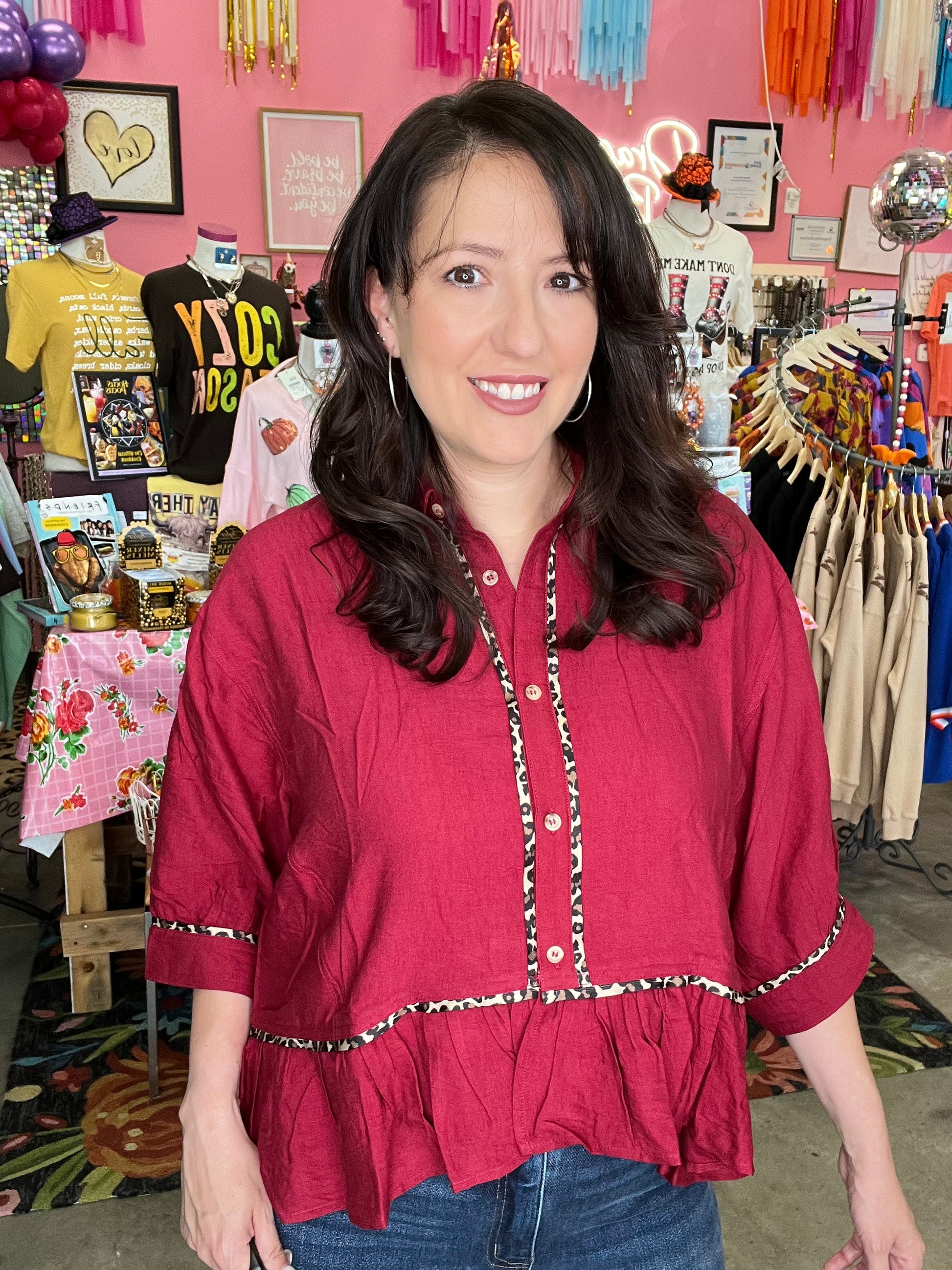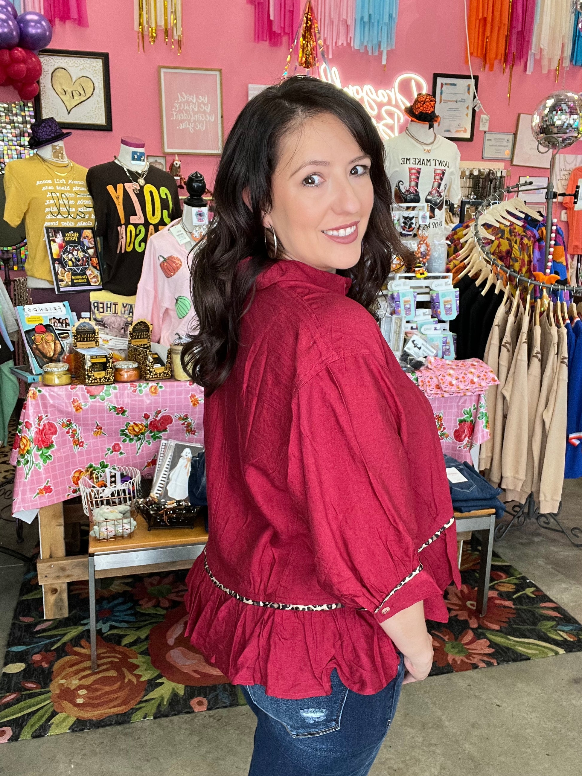 Add a playful yet polished touch to your wardrobe with this solid woven top. Featuring ¾ dolman sleeves with cuff bands, a ruffle hem, and contrast accent binding details, it’s the perfect blend of chic and effortless style. Crafted in lightweight woven fabric, it’s unlined, non-sheer, and comfortable for all-day wear.