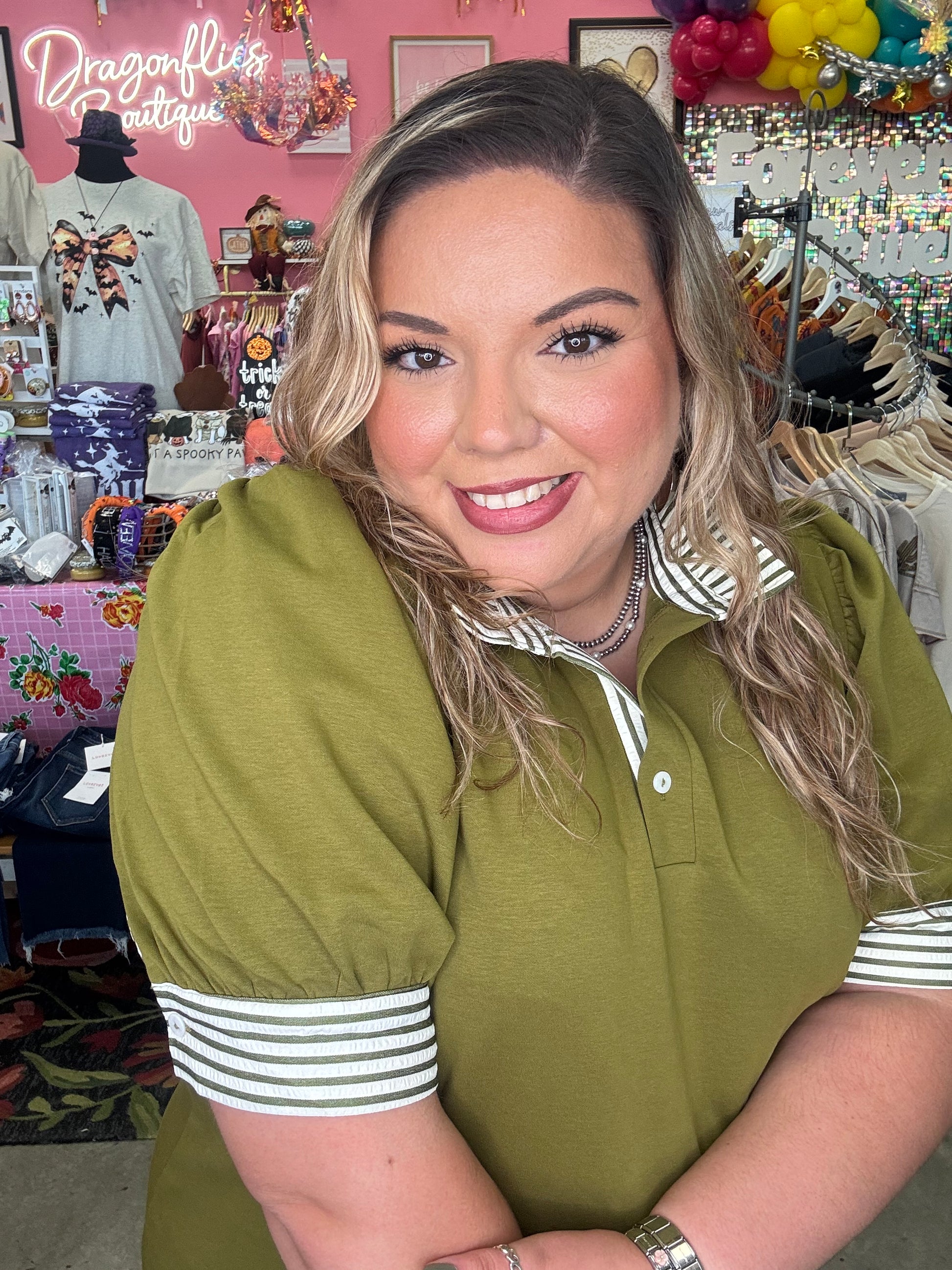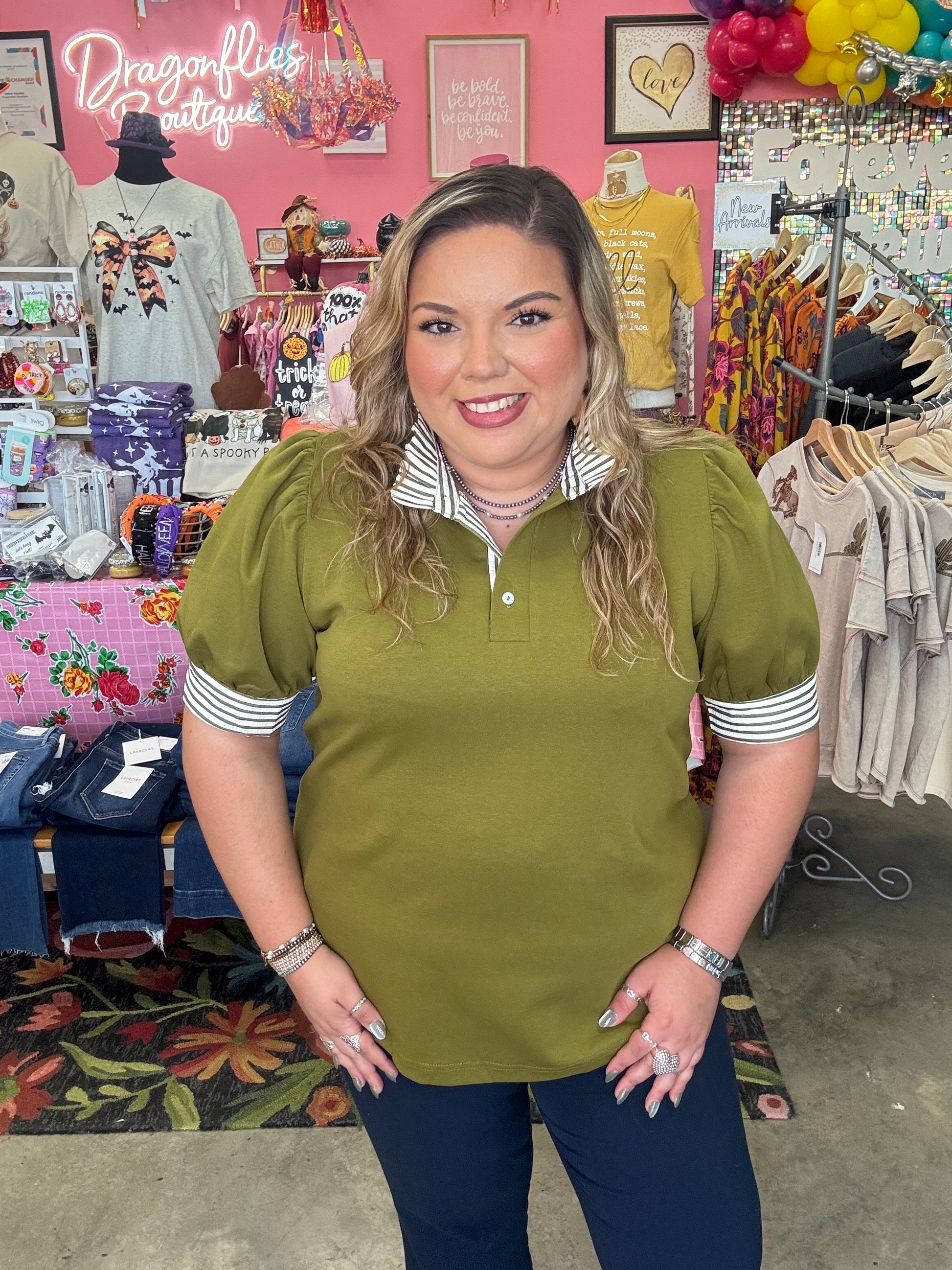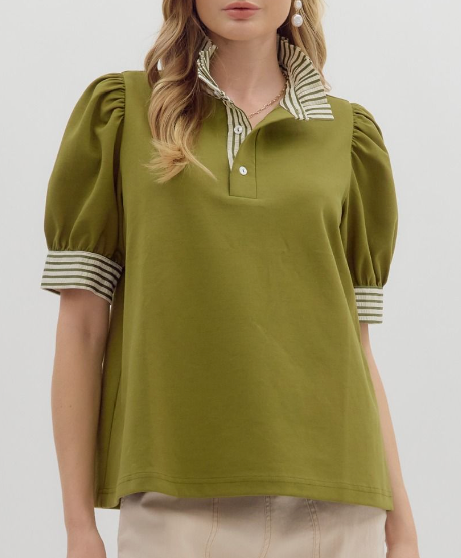 A chic twist on a classic! This solid knit puff shoulder short sleeve top features a playful contrast with striped ruffle detail at the neckline and sleeve cuffs. Designed to keep you stylish and comfortable, it’s unlined, non-sheer, lightweight, and easy to wear—perfect for pairing with jeans, skirts, or trousers.