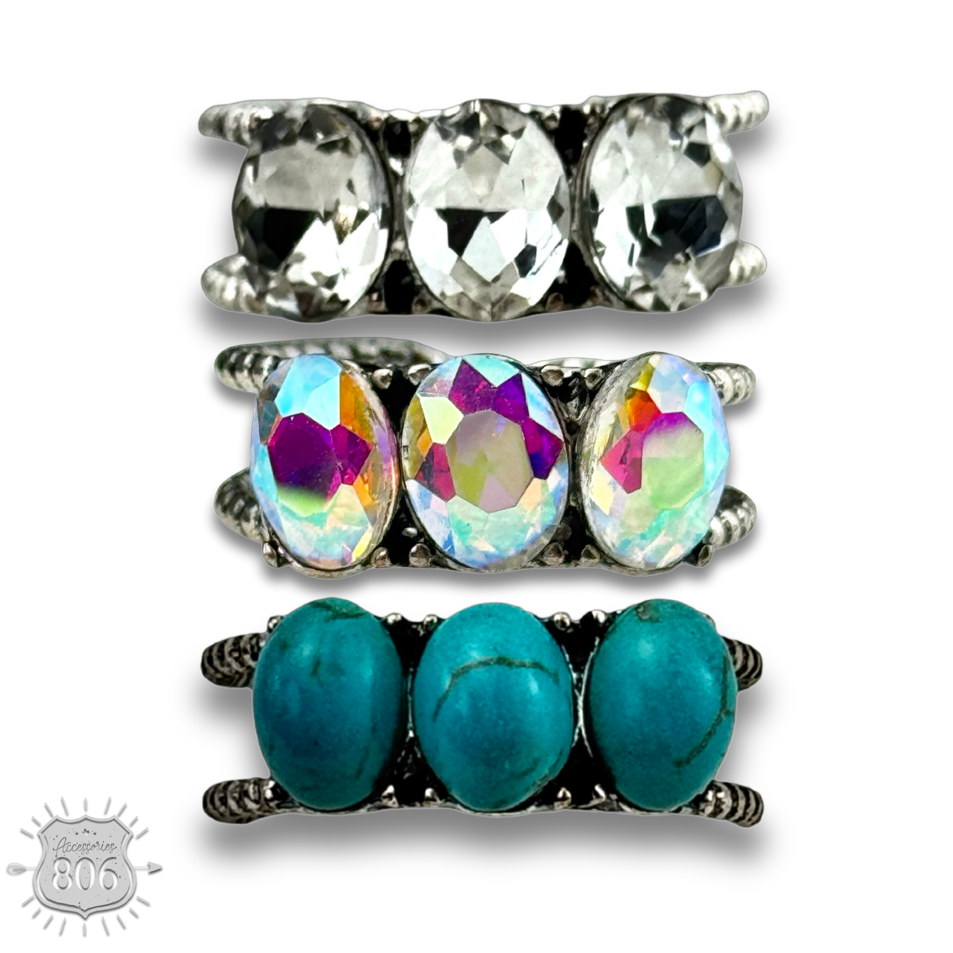 This silver tone ring has three oval stones in the center. Open in back and is adjustable.