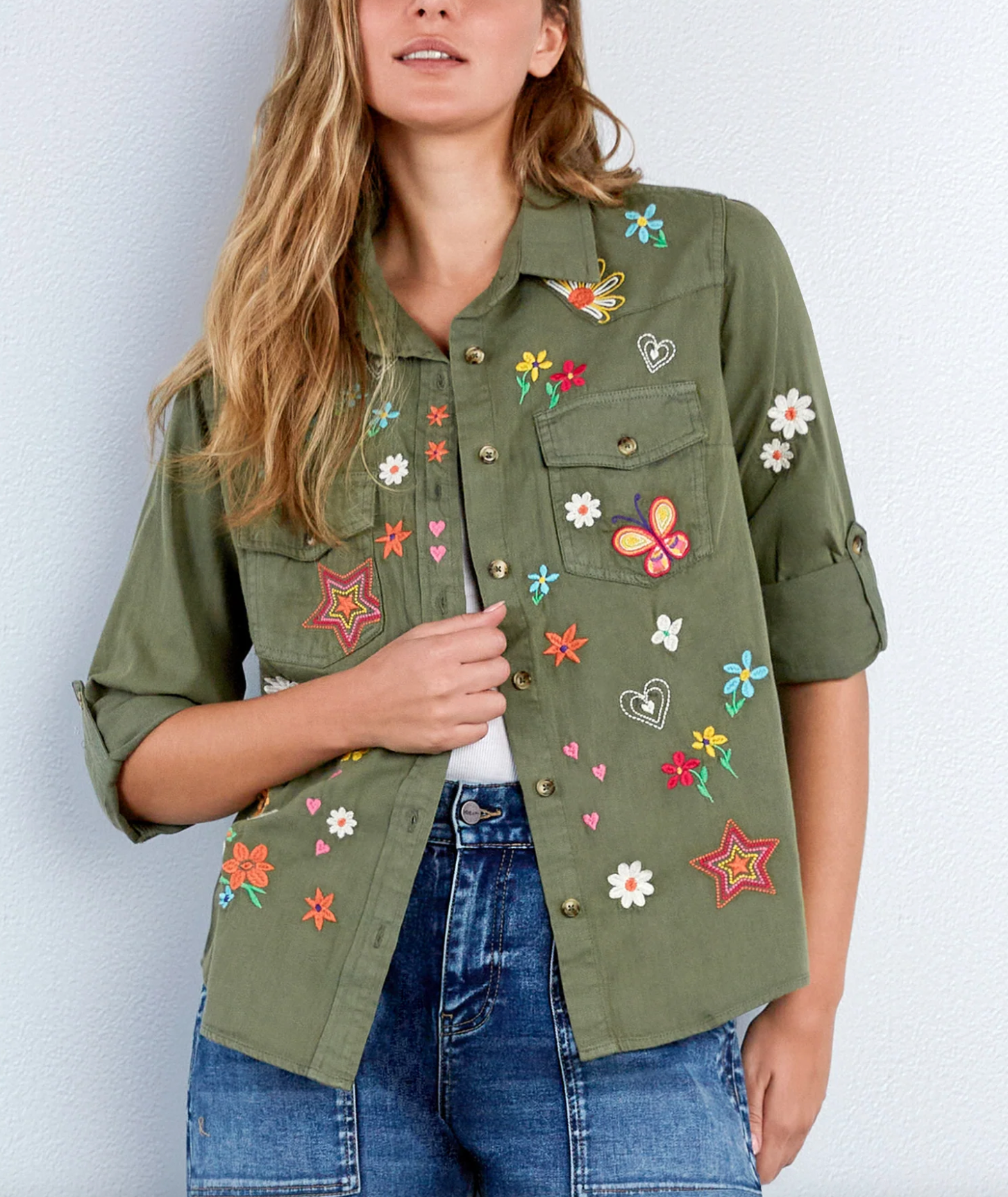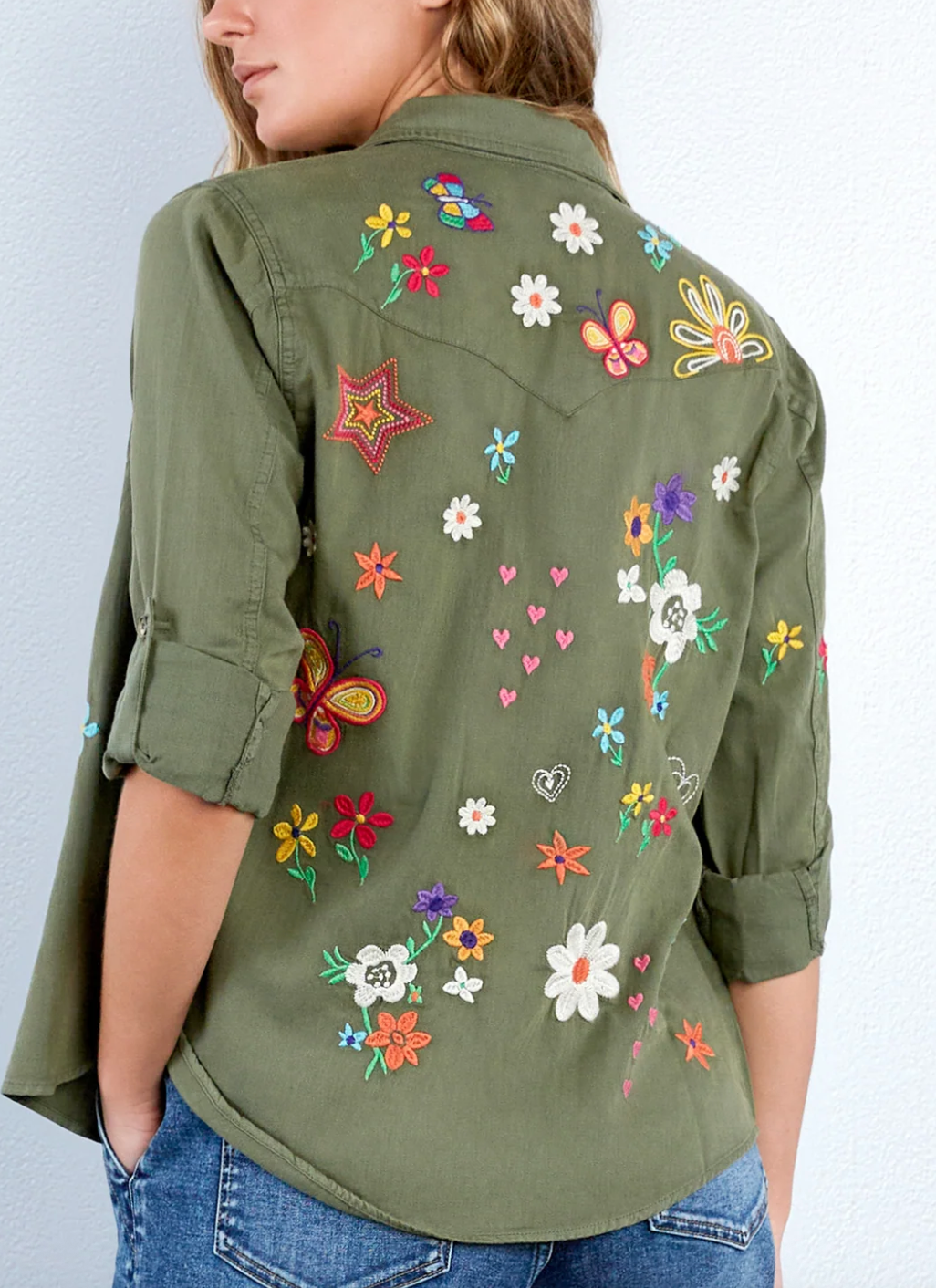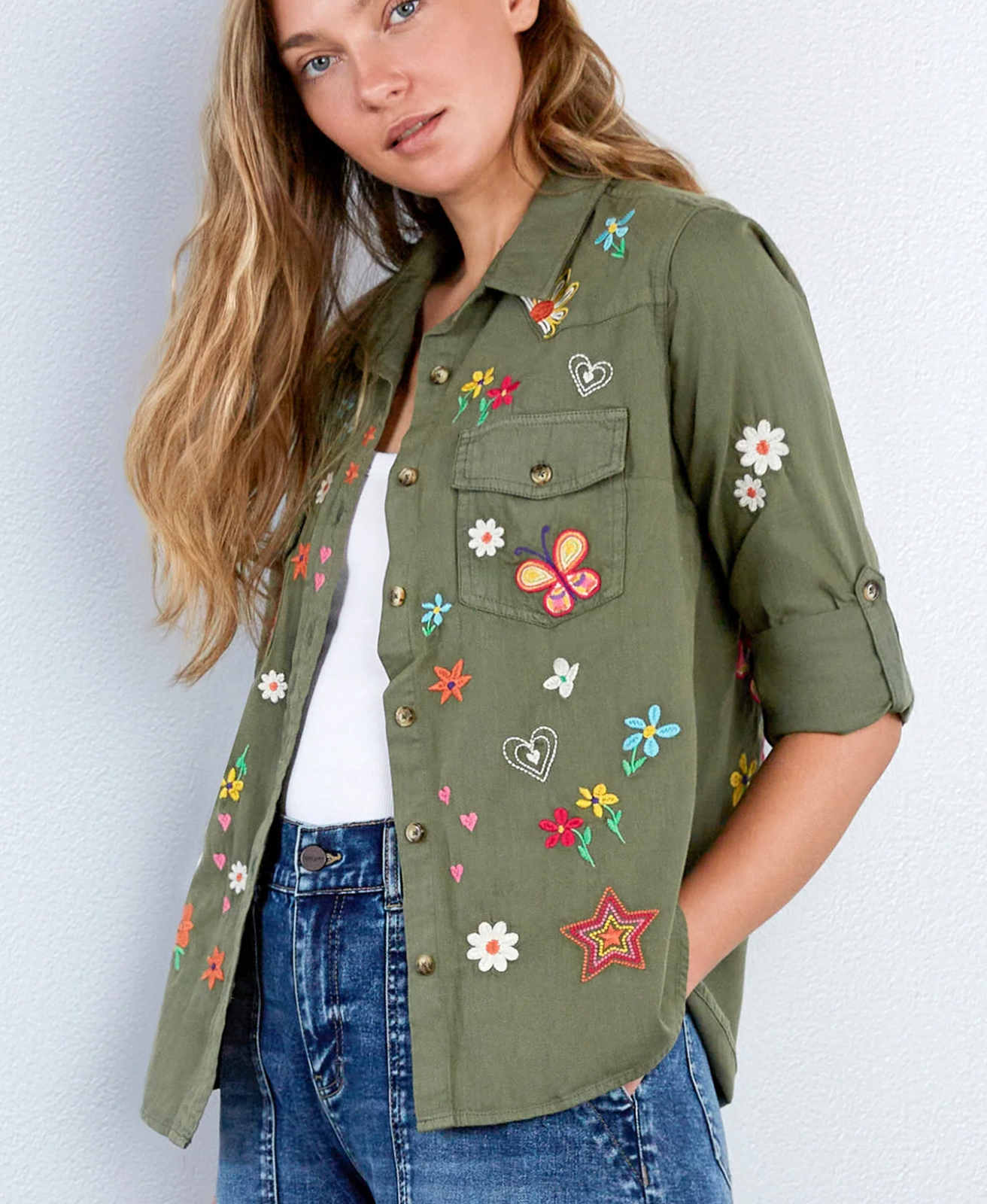 Our happy and fun vintage-inspired Sketchbook embroidered soft olive shirt is made with super soft lyocell. Good for you and good for the planet.