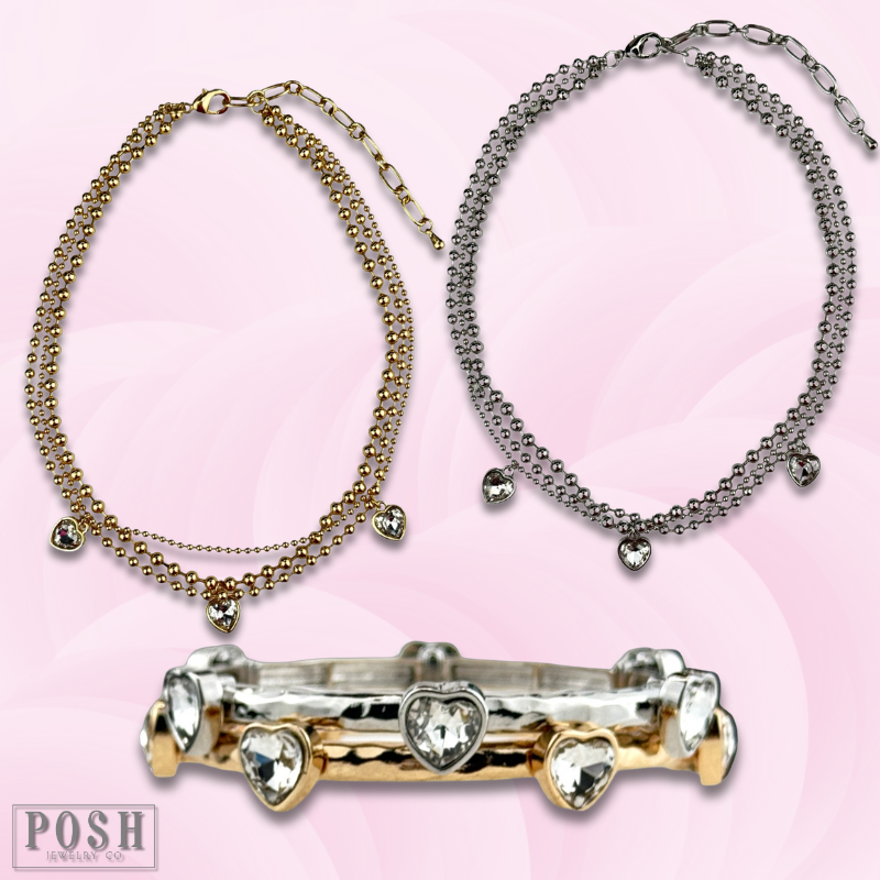 This necklace has three strands of bead chain in varying sizes. Each strand has a rhinestone heart charm and provides a great layered look.
